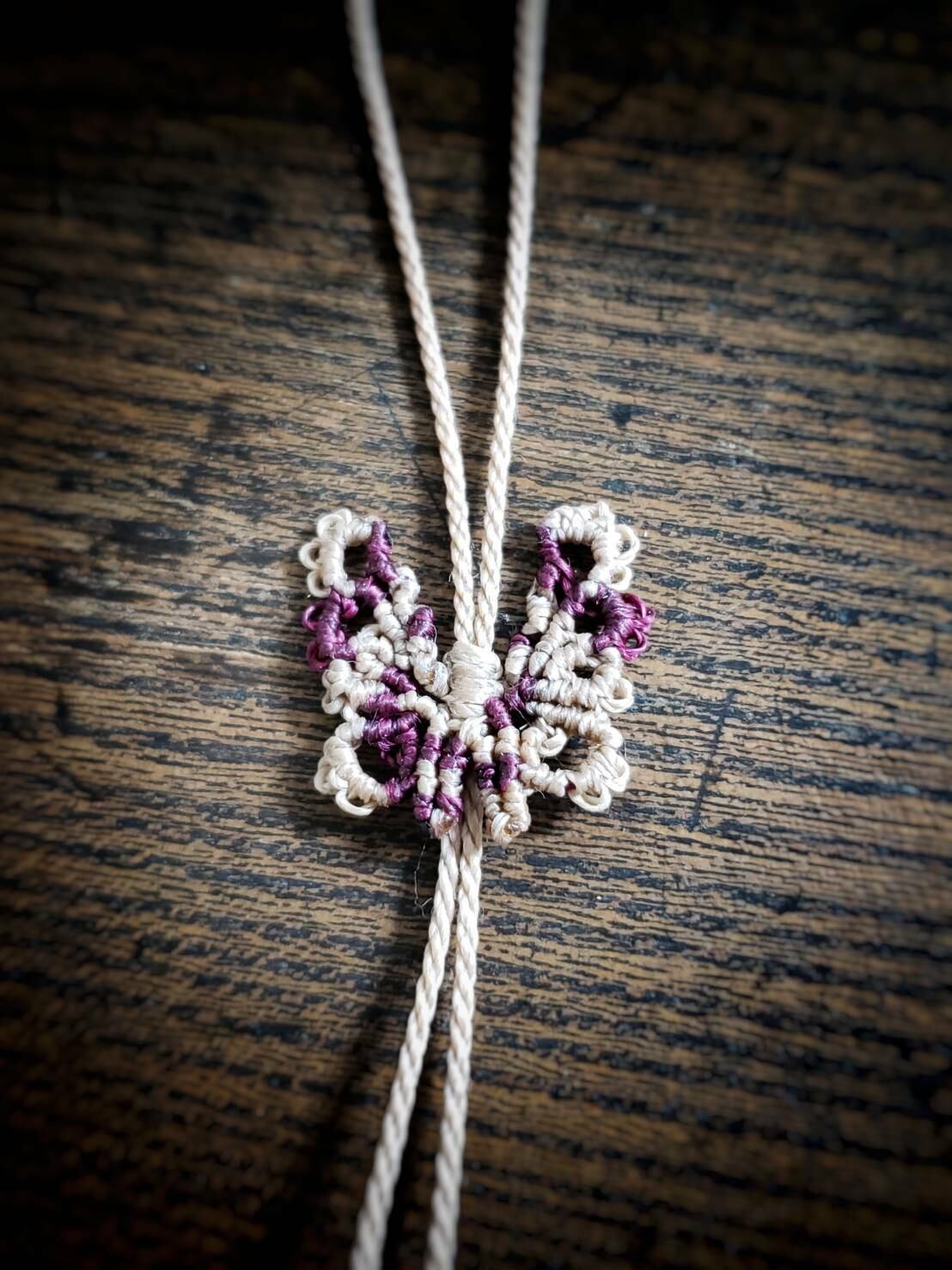 0.5ミリのナチュラル色とルージュ色のワックスコードで編んでます。