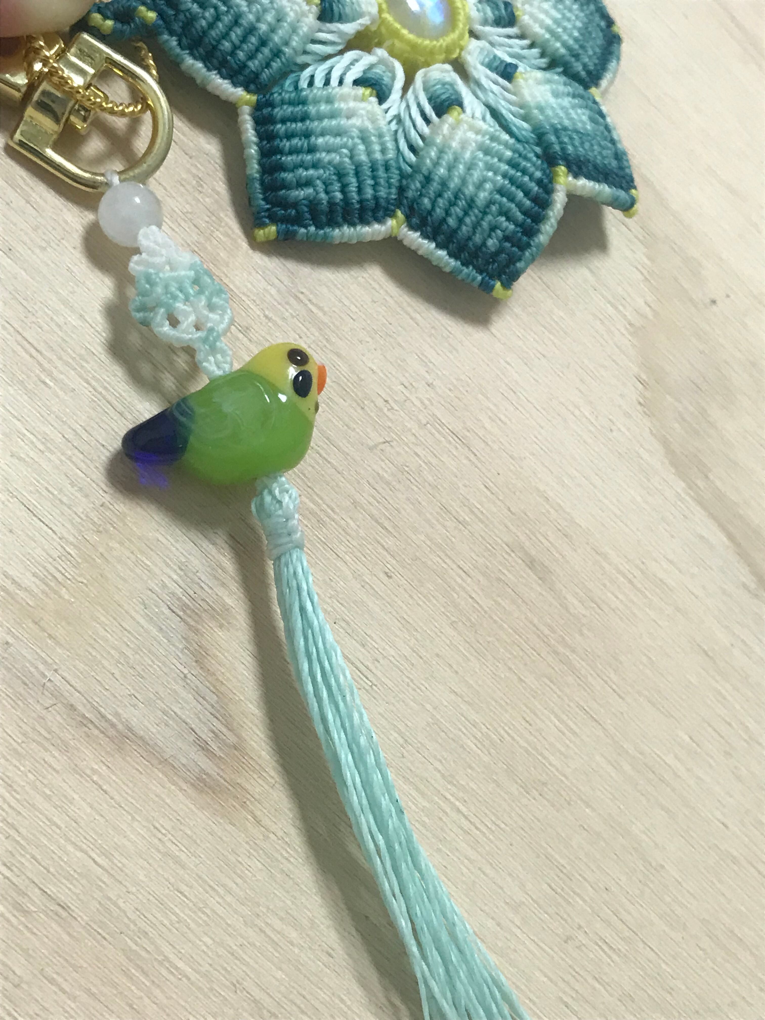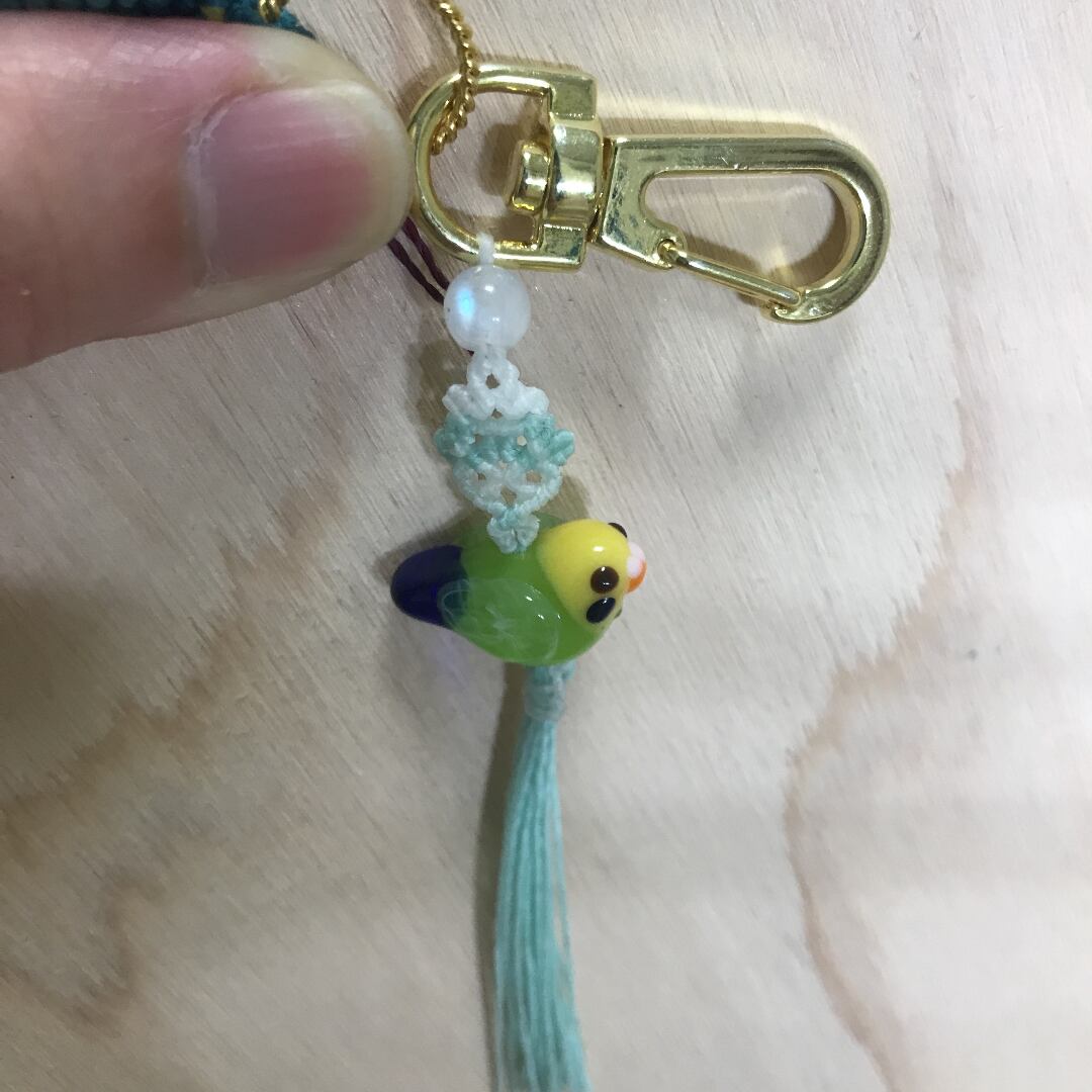 こちらは、レガリスさんワークショップレシピの「クレマチス」をメインに、アトリエKozaikuさんからお迎えした小鳥ビーズシリーズとタッセルを付けて、キーホルダーにしました。