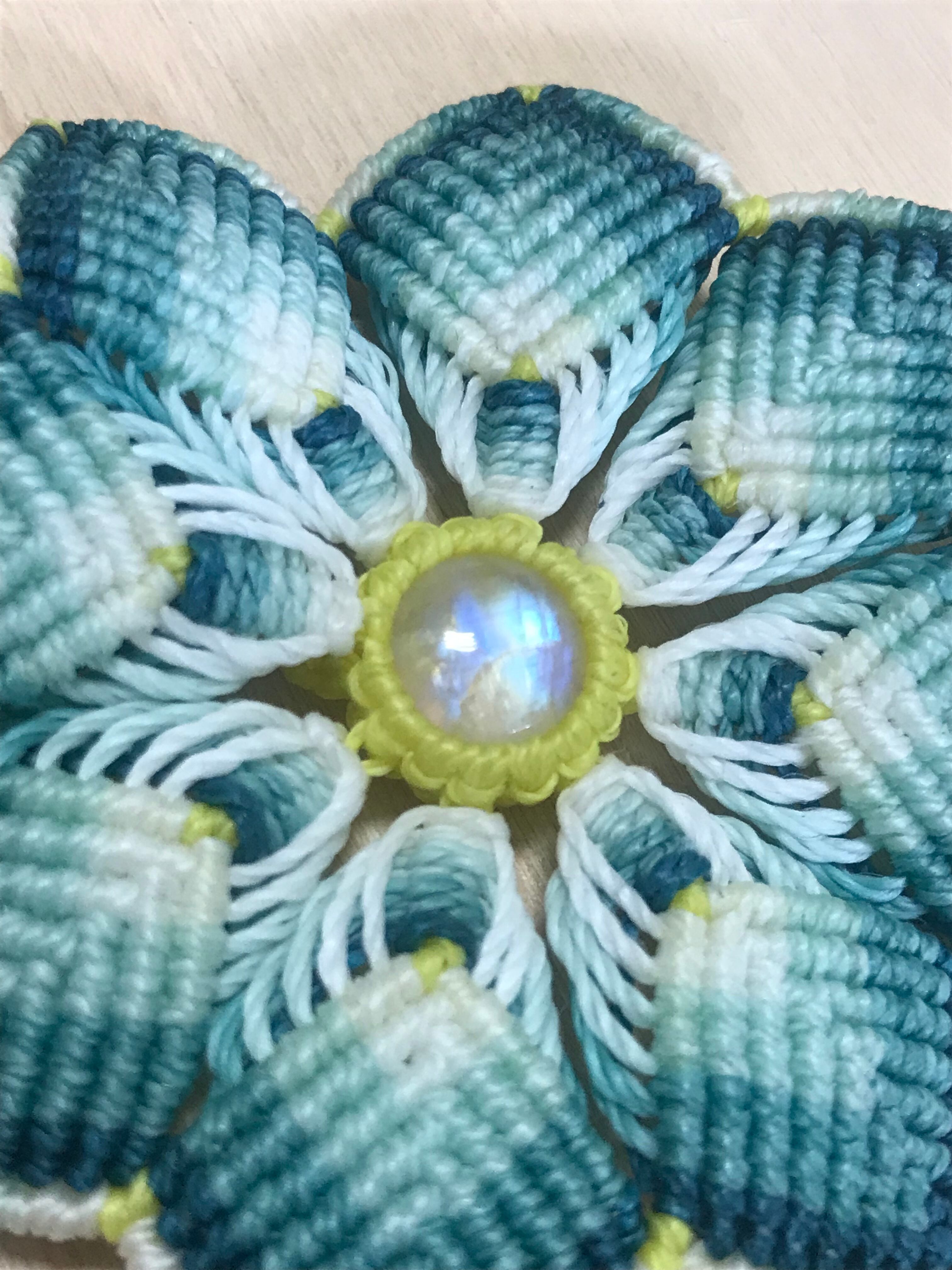 セキセイインコさんの色味をイメージしたクレマチスにしました。クレマチスの真ん中とインコさんの上のビーズは、ムーンストーンです。