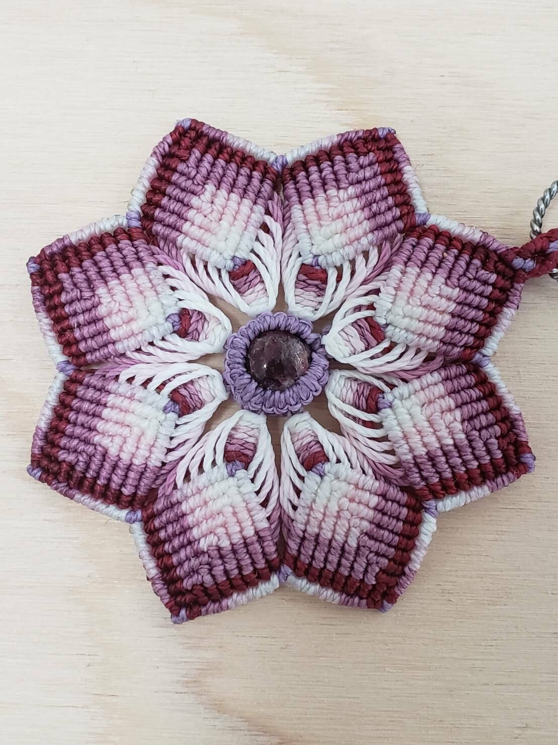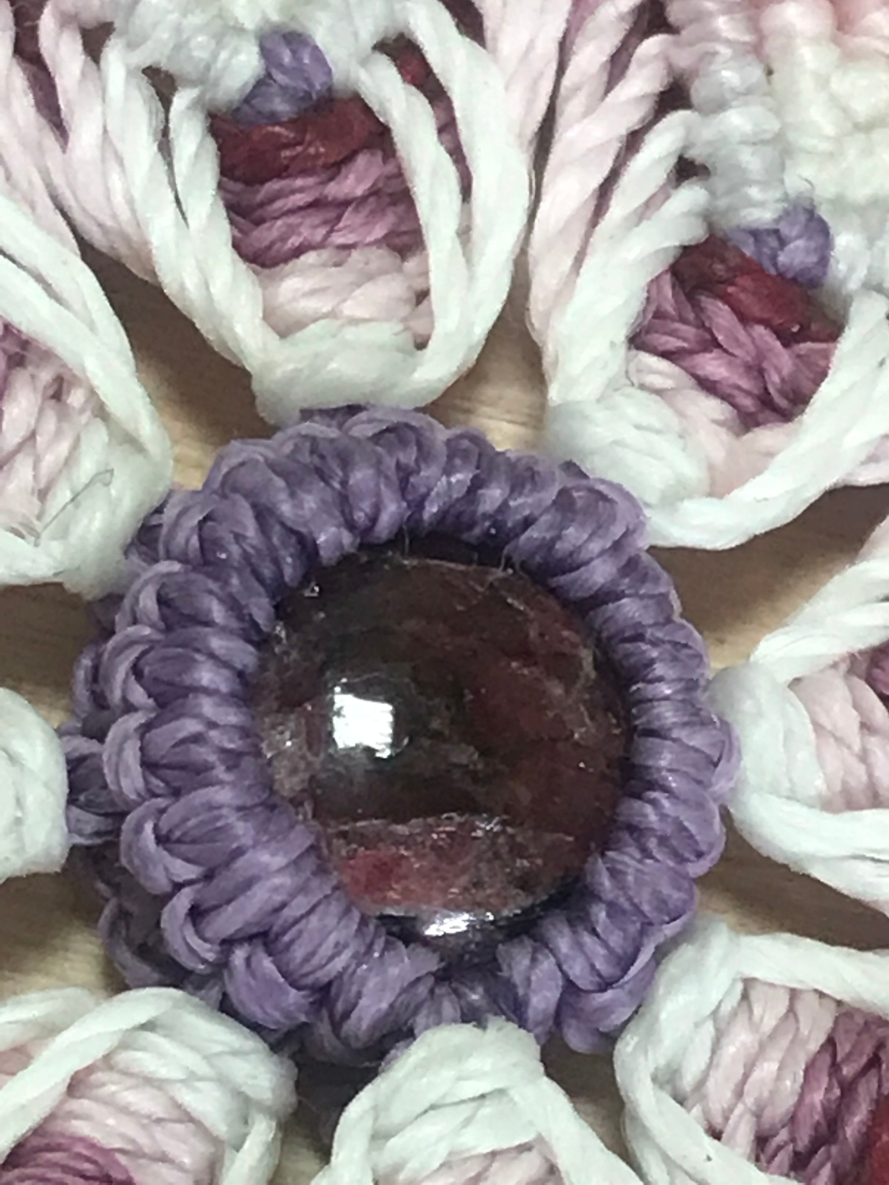 3A ユーディアライト10ミリカボションで、レガリスさんワークショップレシピの「クレマチス」を編みました。
