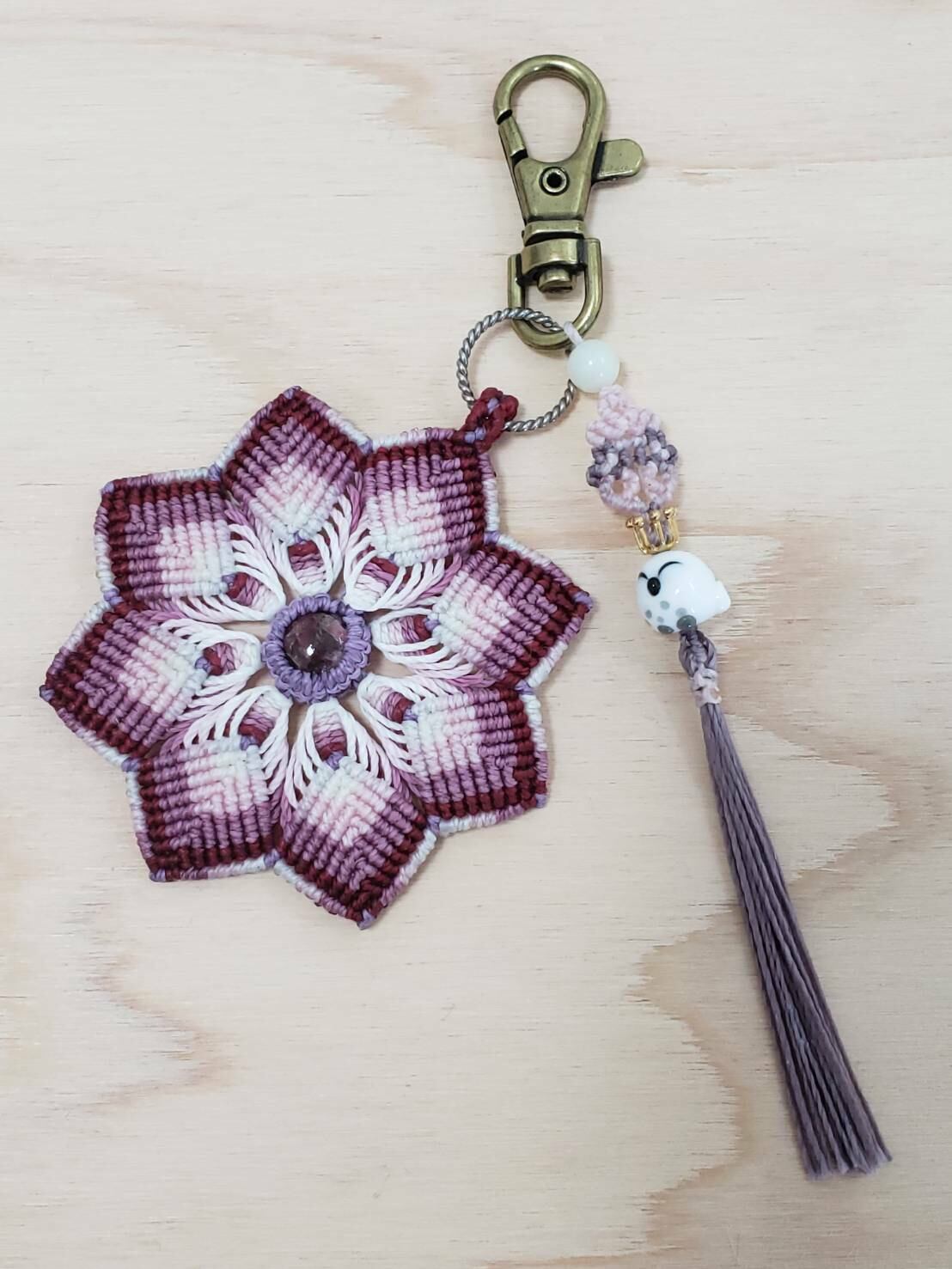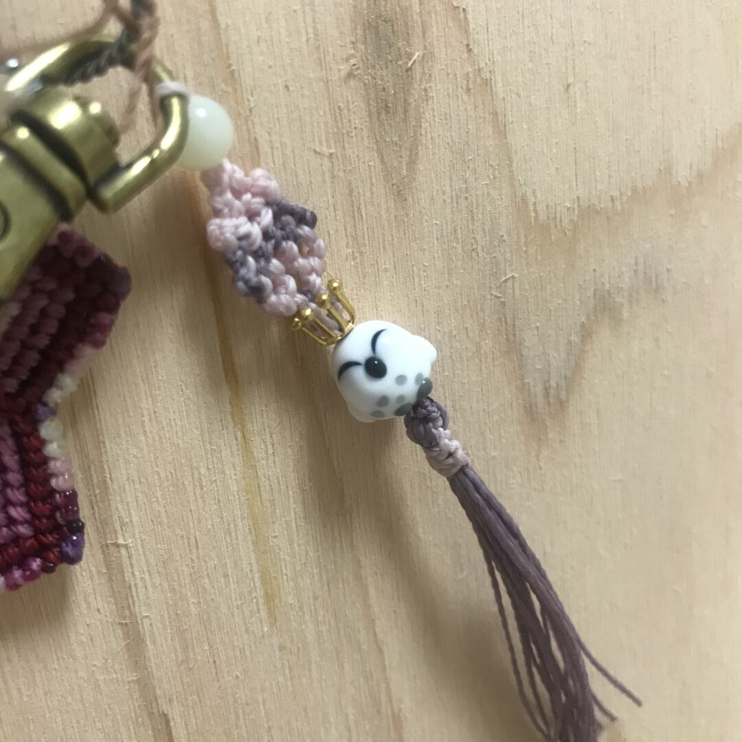 となりのタッセル付きのマクラメ編みは、上には、6ミリのグリーンオパールビーズ、マクラメ編みをして、フクロウには王冠をかぶせました。