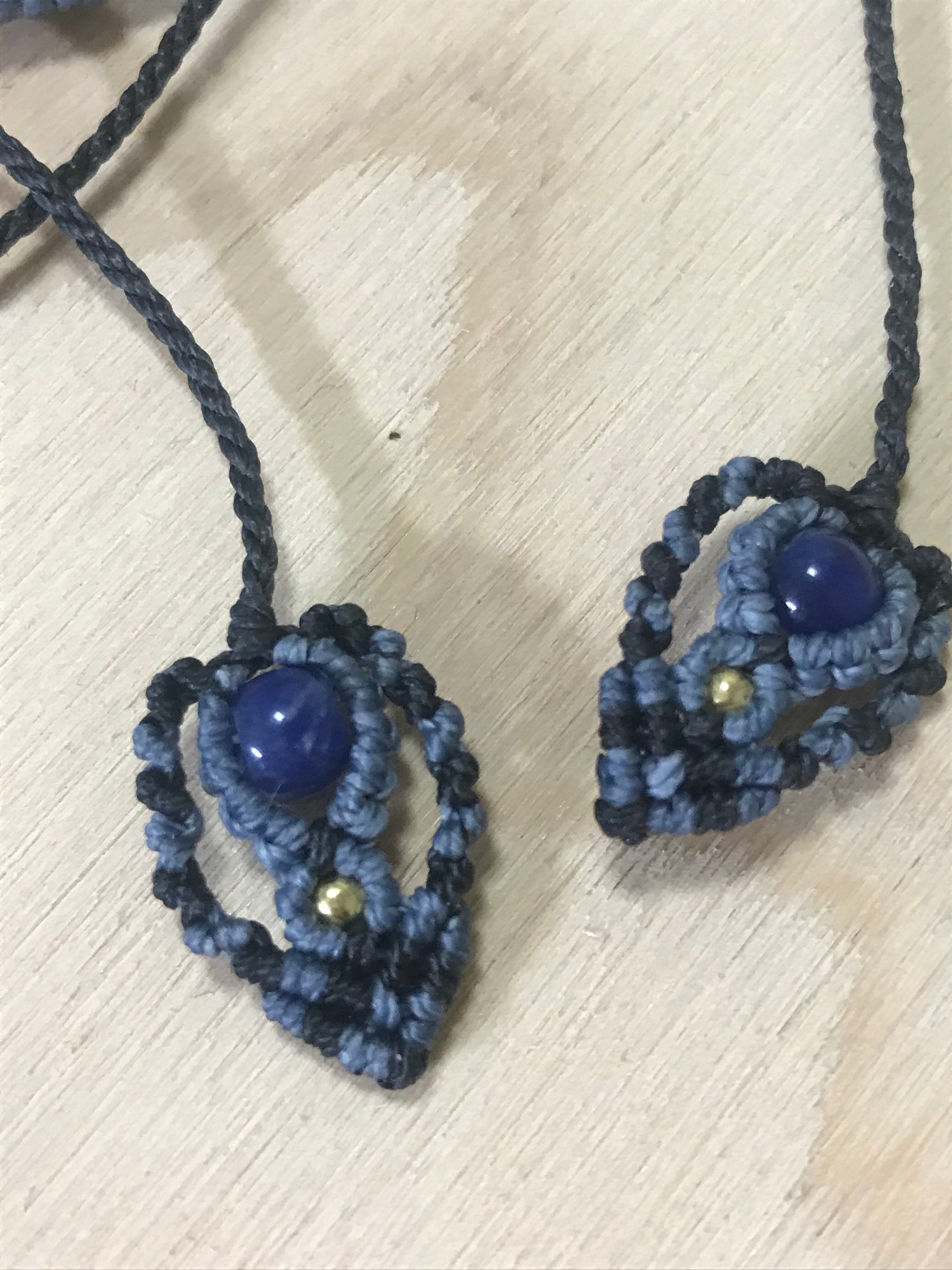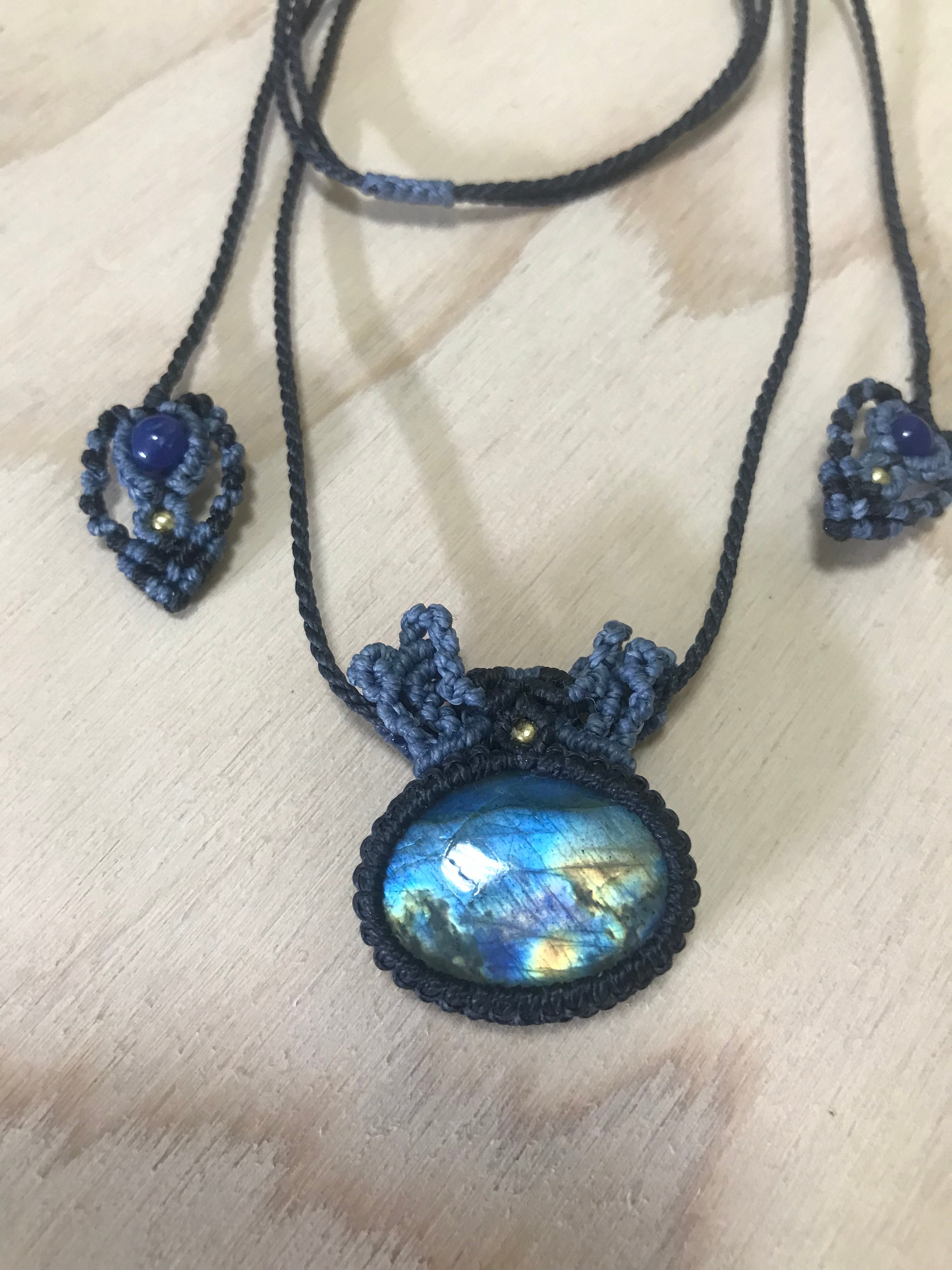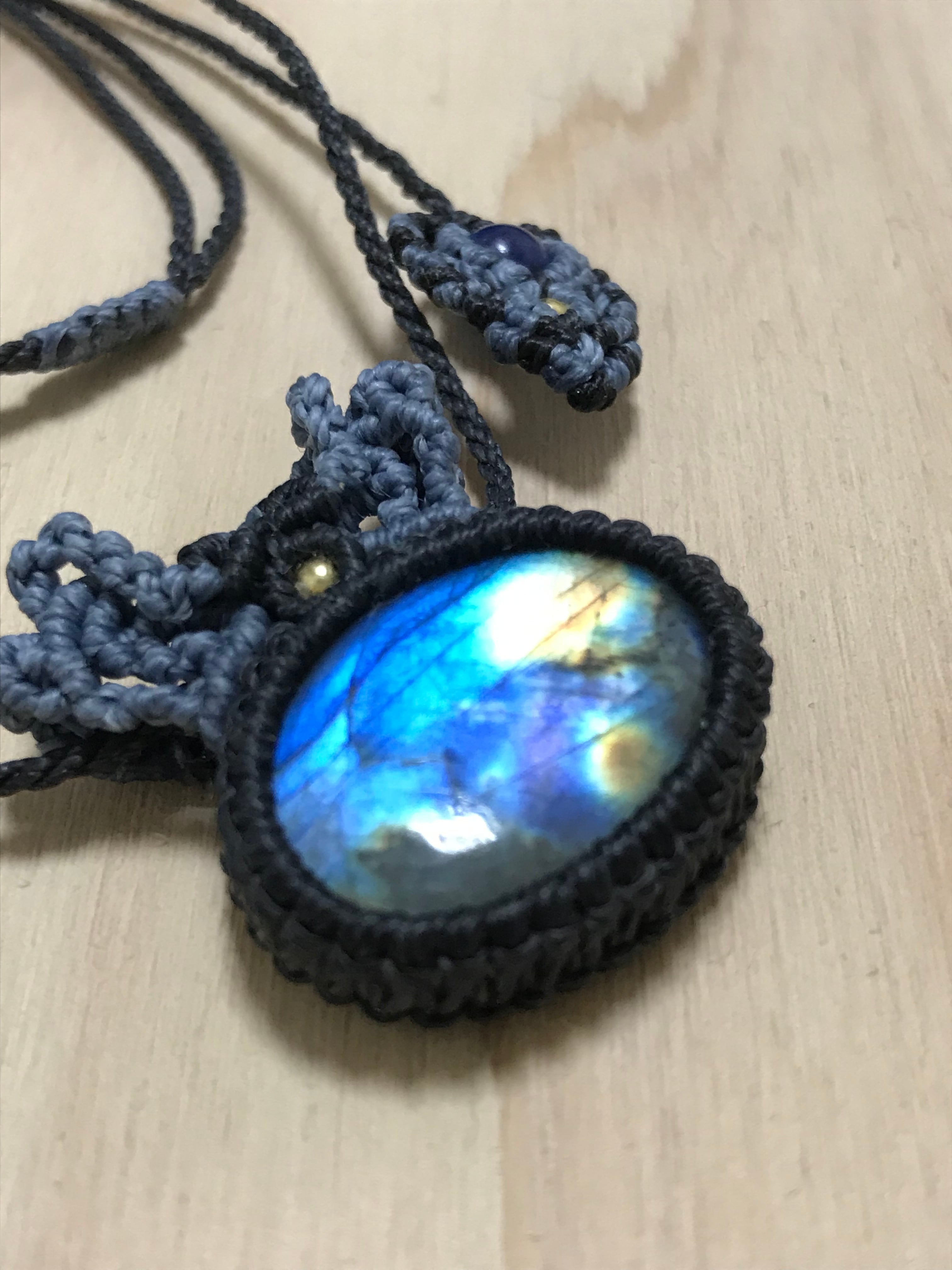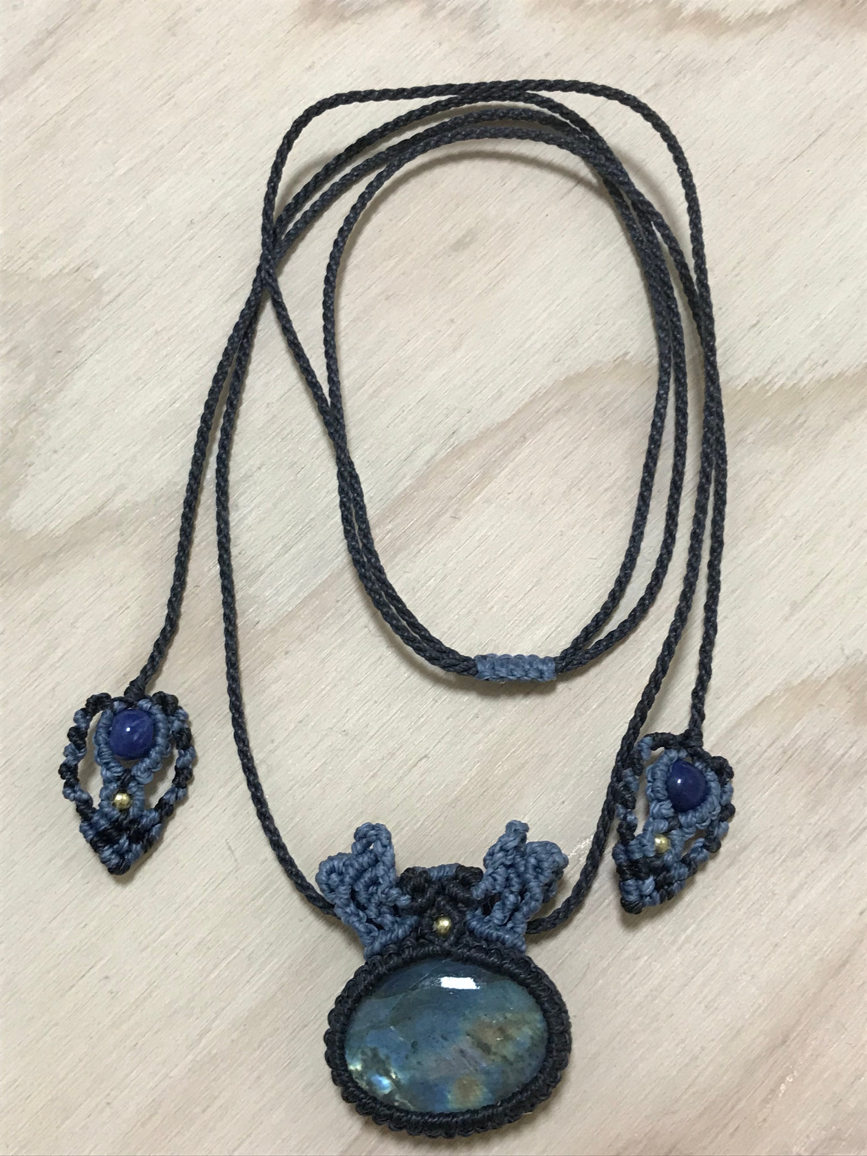 こちらは「ラブラドライト」のマクラメ編みネックレです。