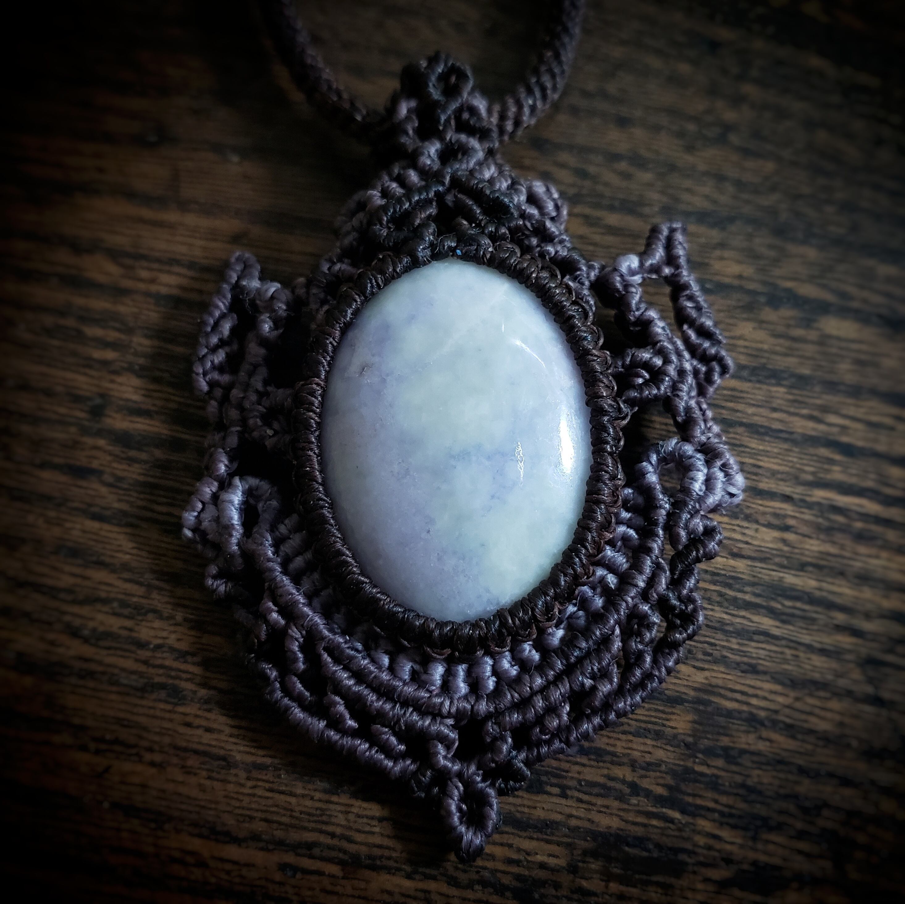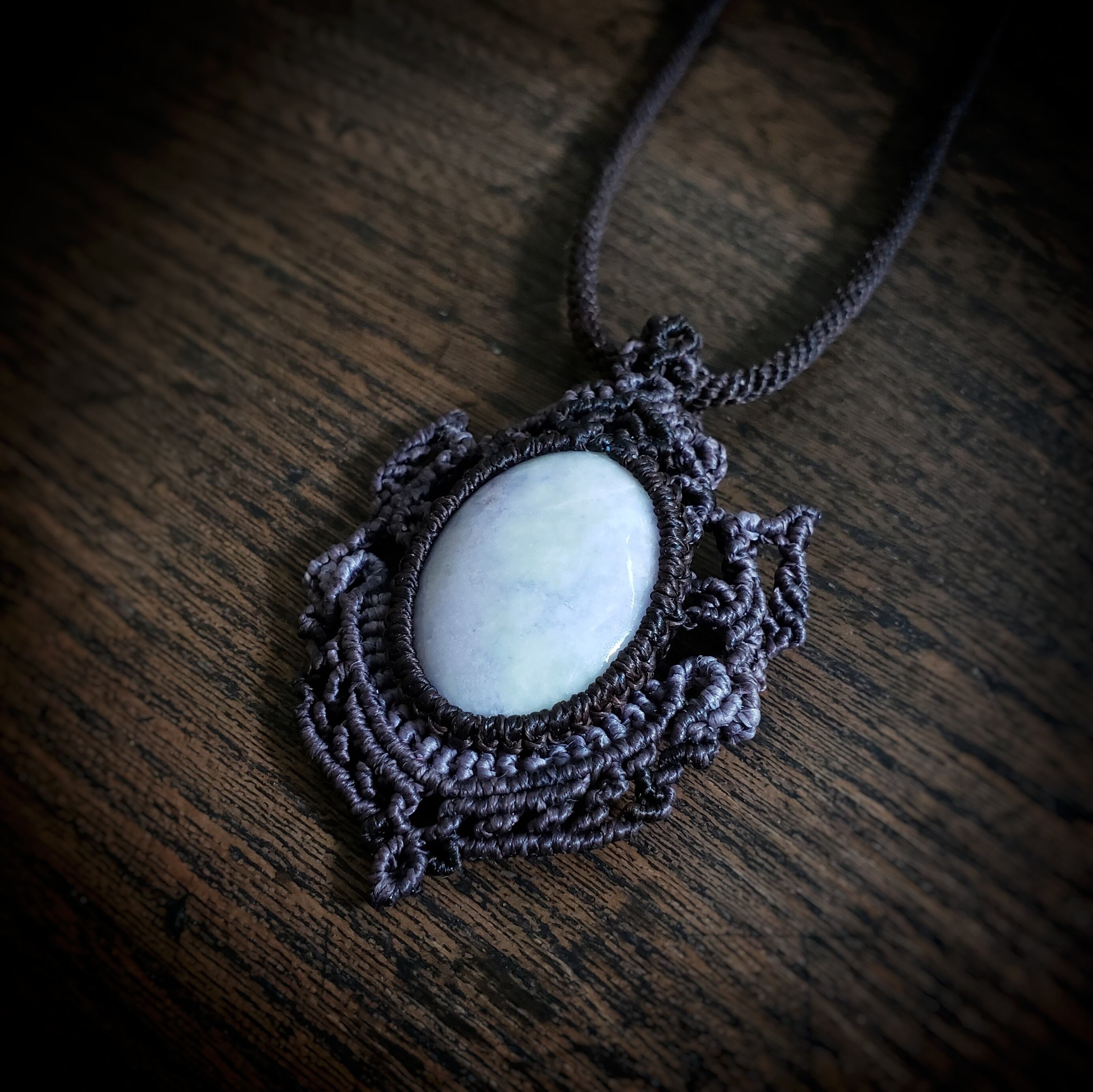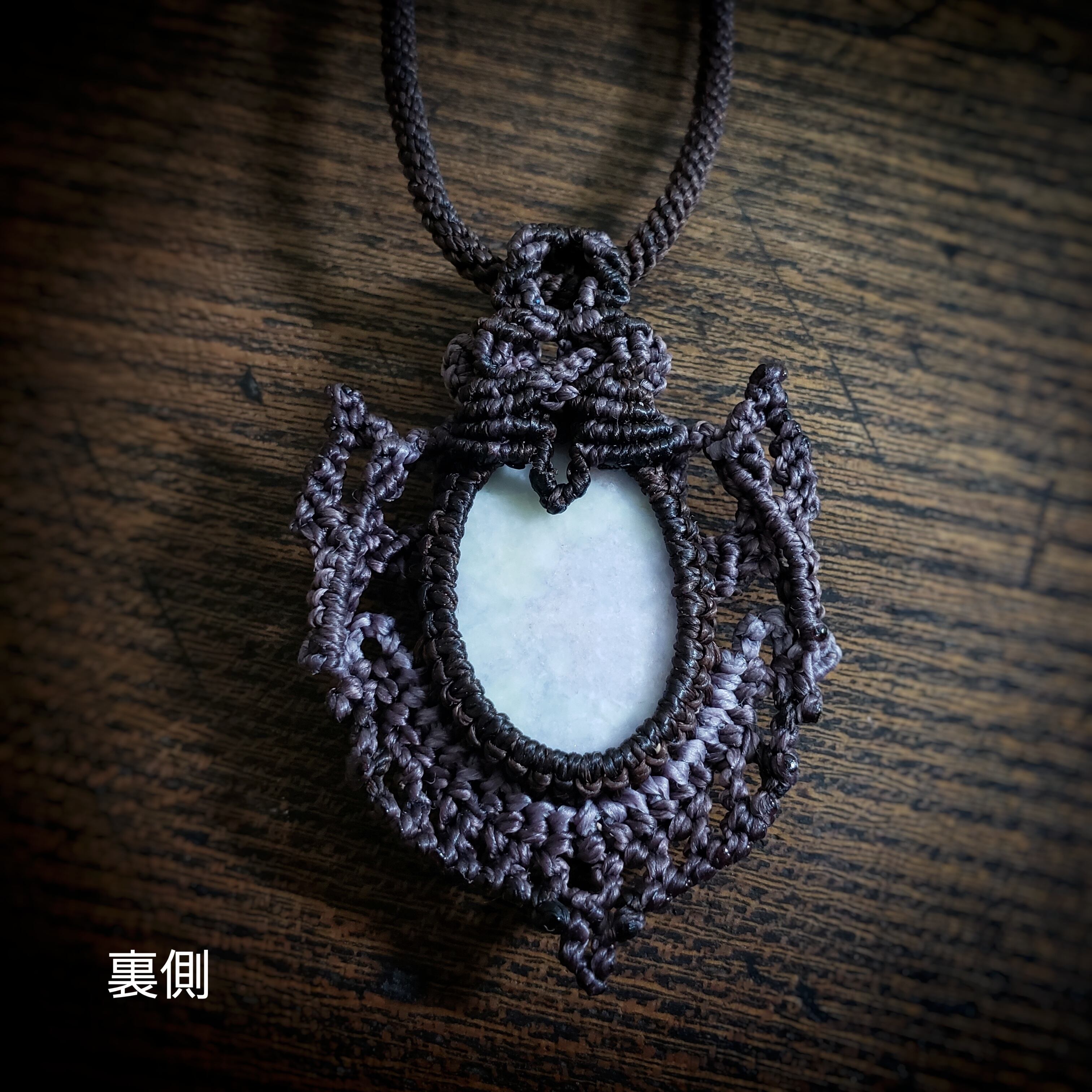 こちらは、グアテマラ産「ラベンダー翡翠」のマクラメ編みネックレスです。