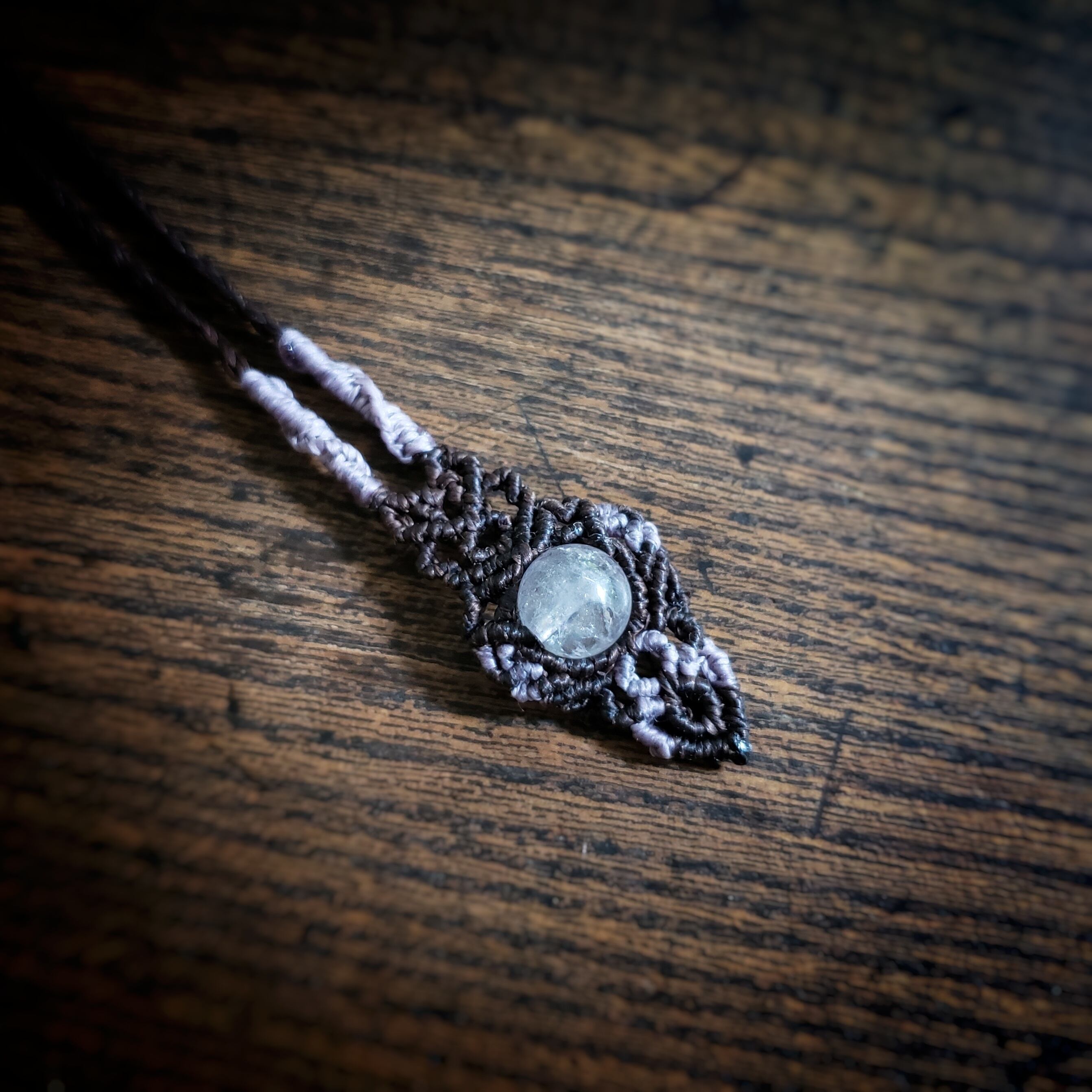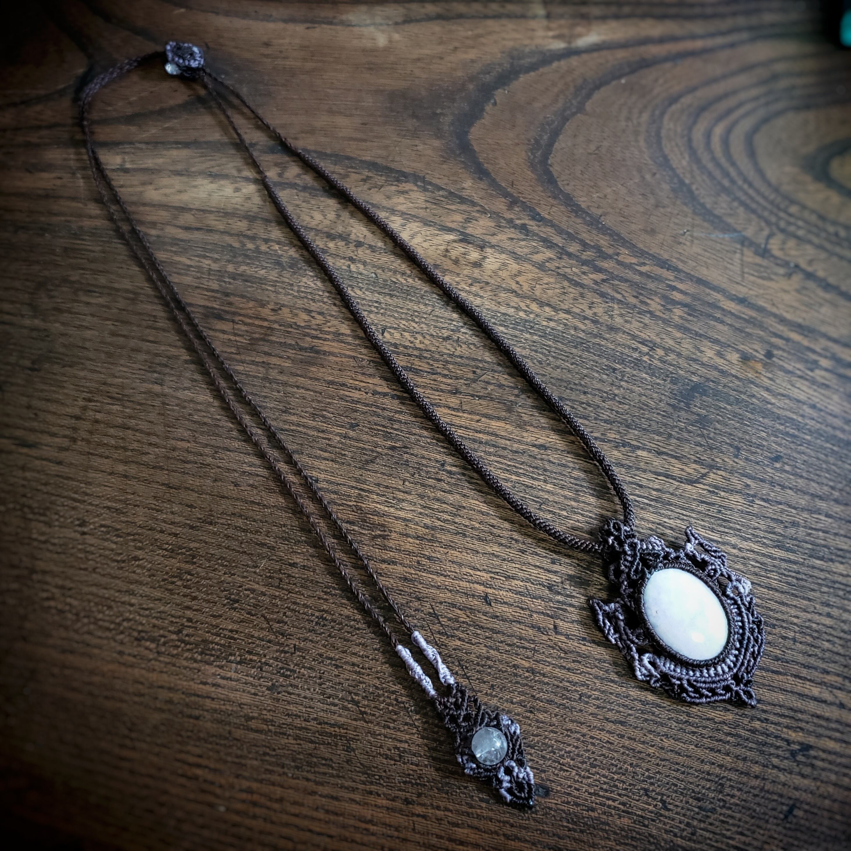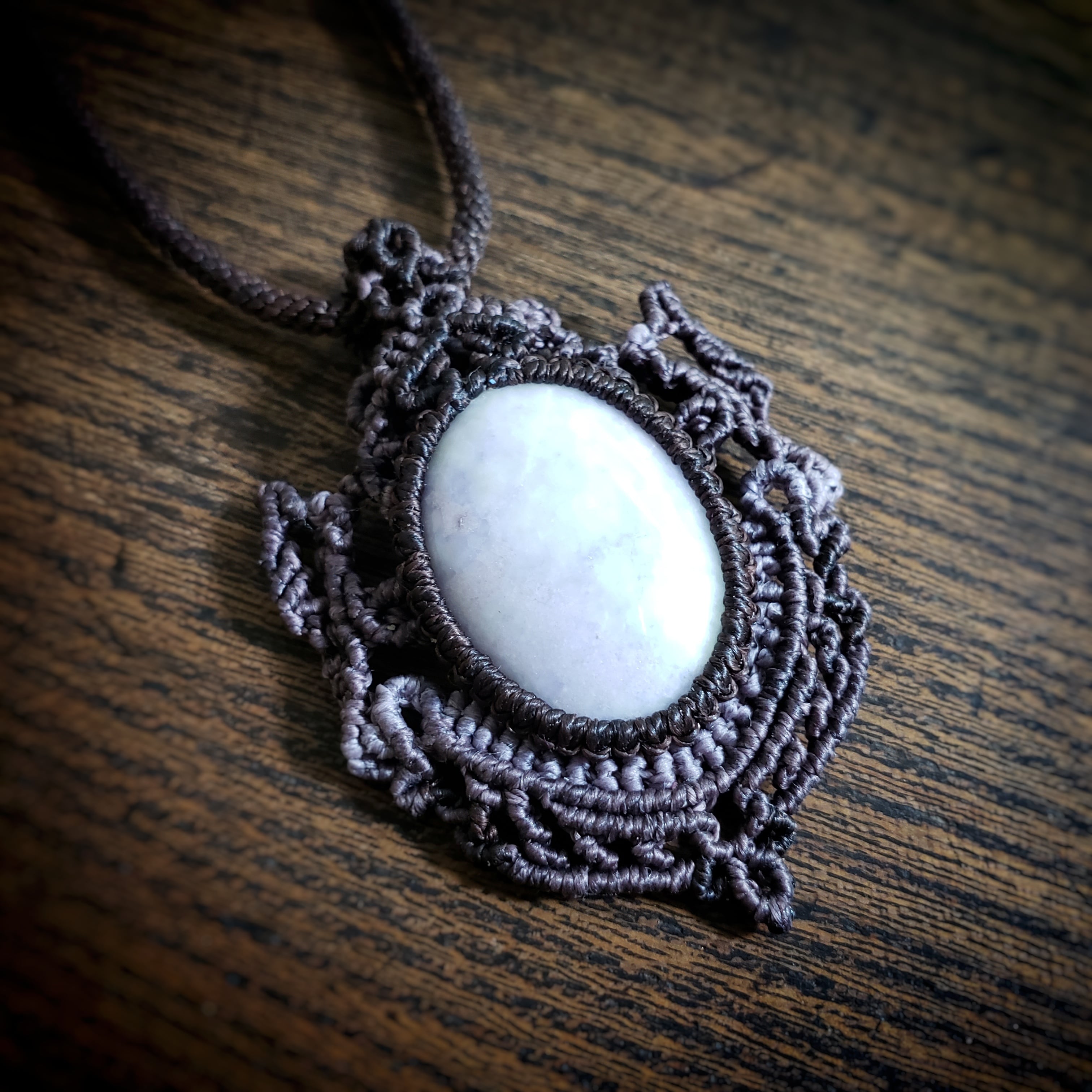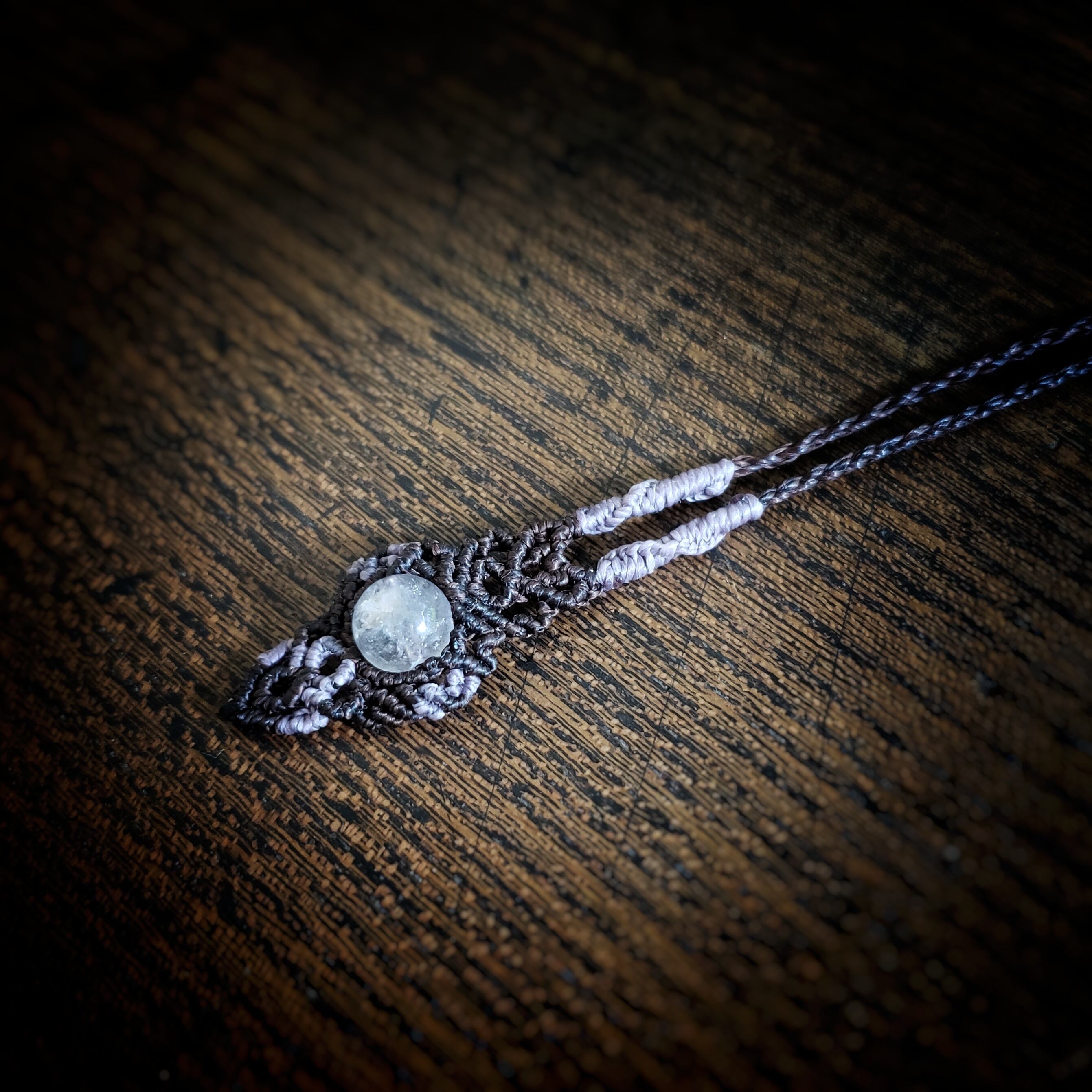 こちらは、グアテマラ産「ラベンダー翡翠」のマクラメ編みネックレスです。