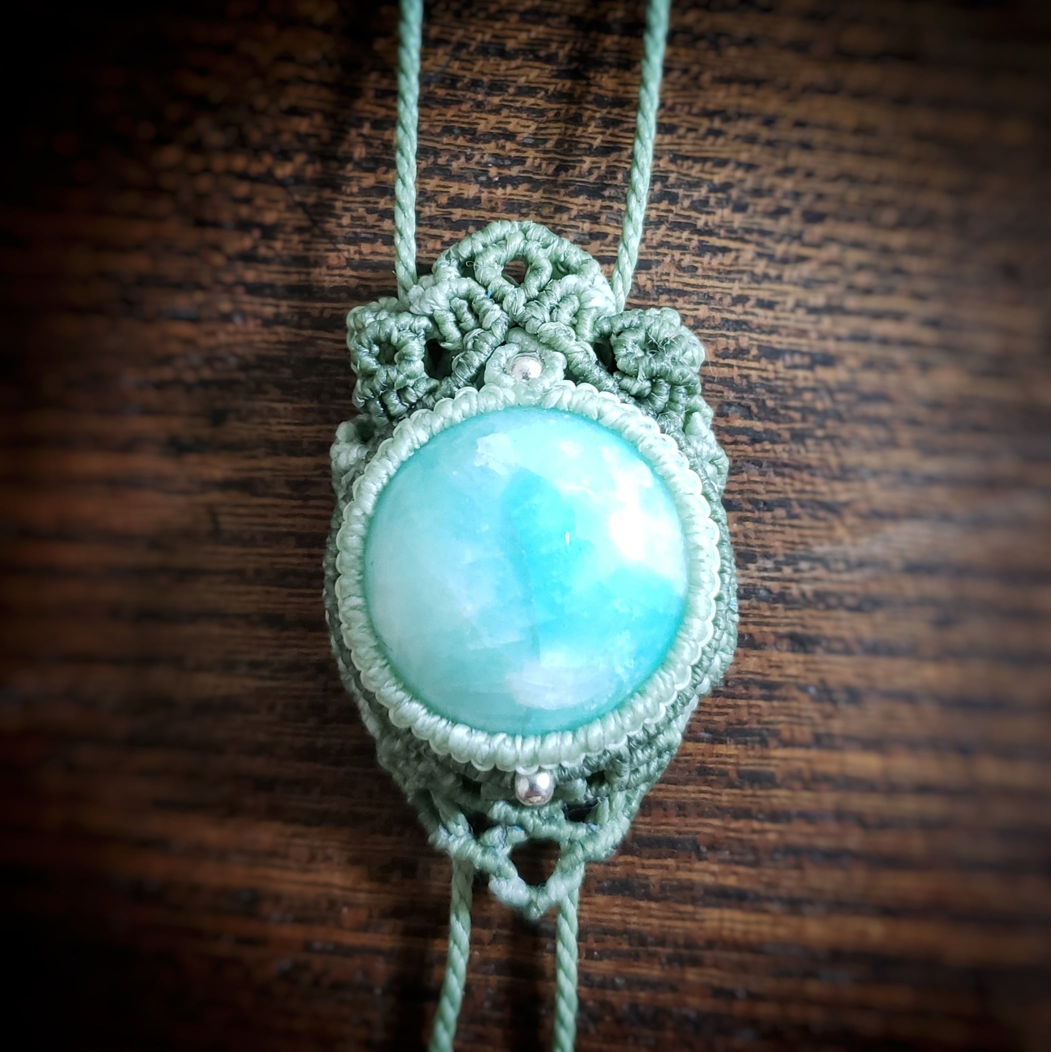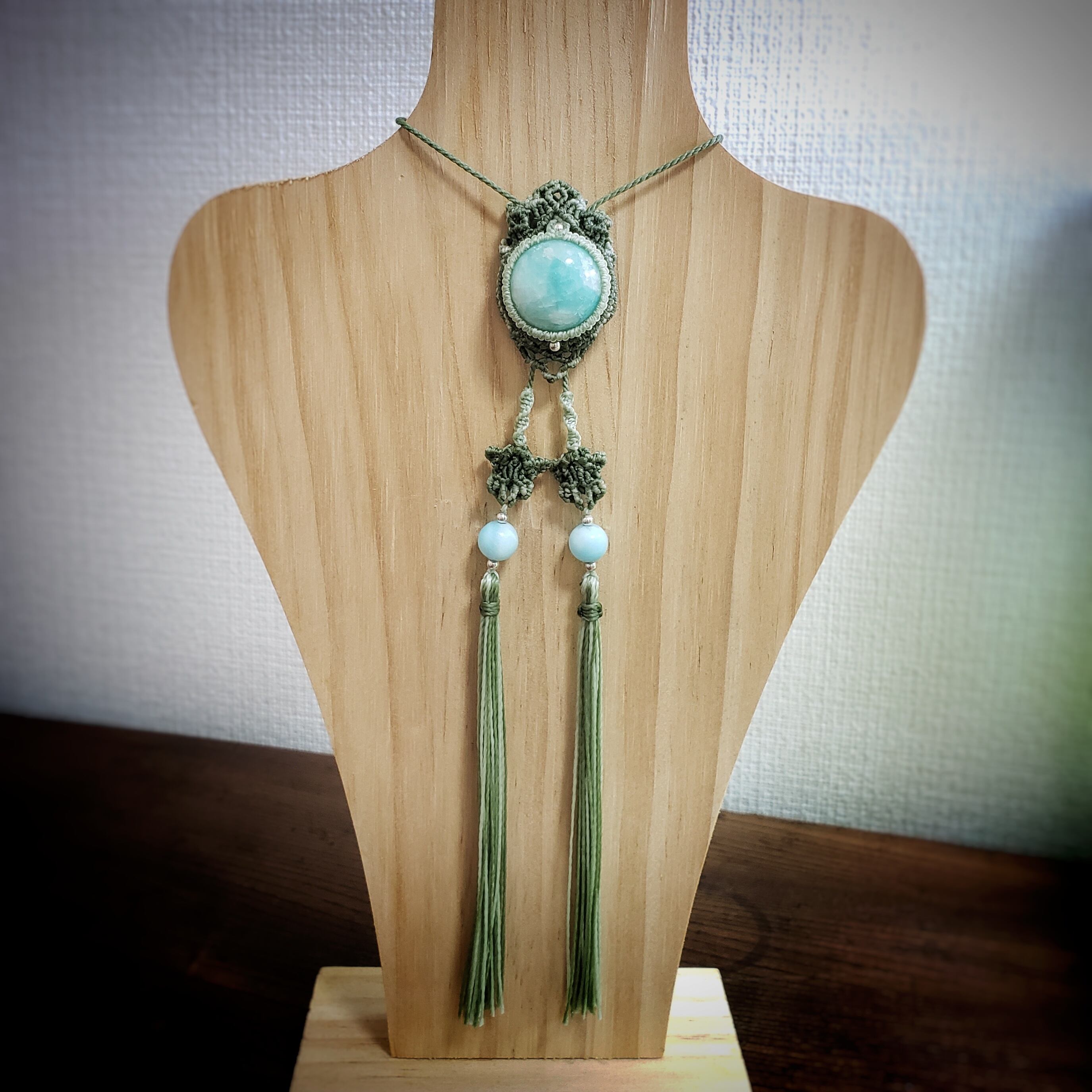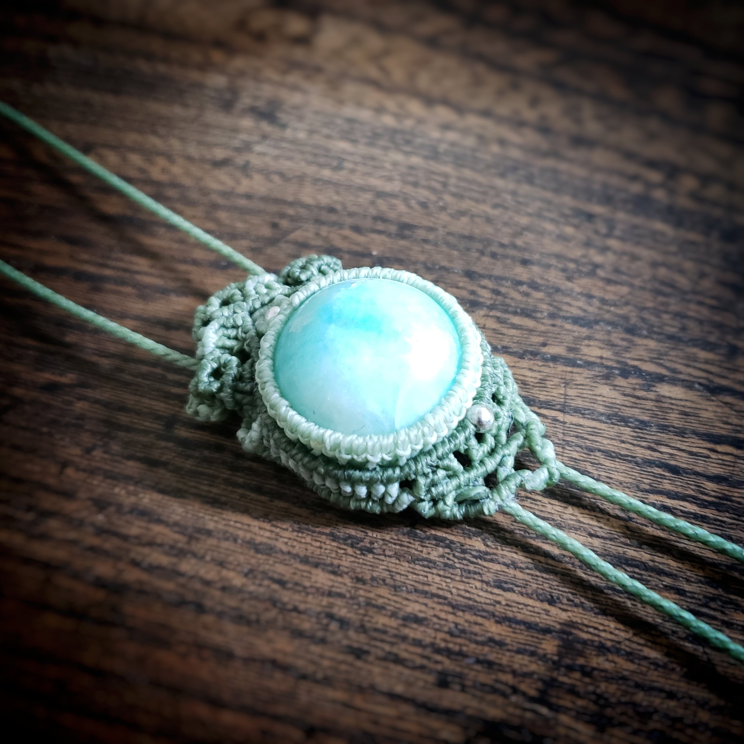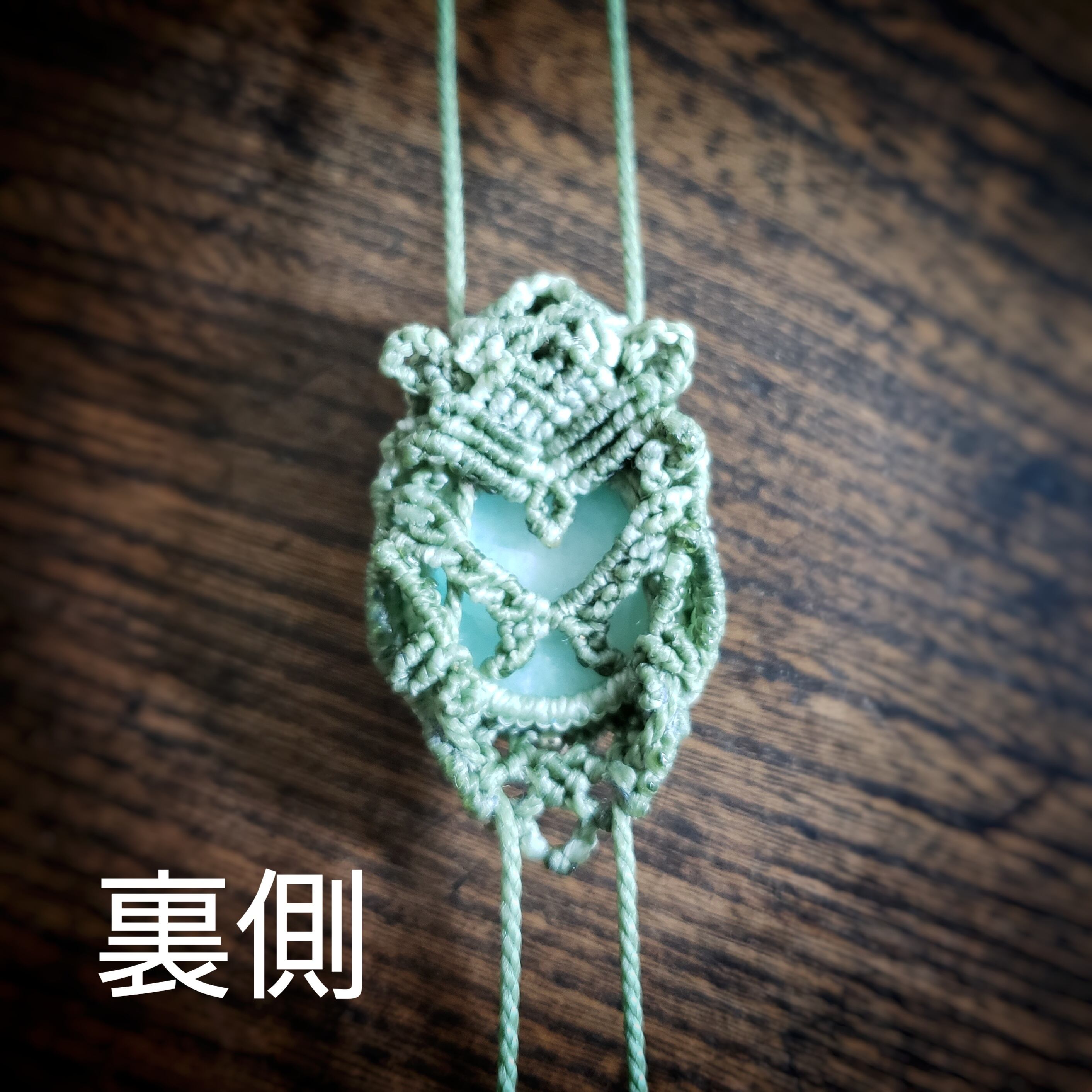 こちらは、「アマゾナイト」のカボションをワックスコード(ロウビキ紐)で編み「ループタイ タイプ」のネックレスを作りました。