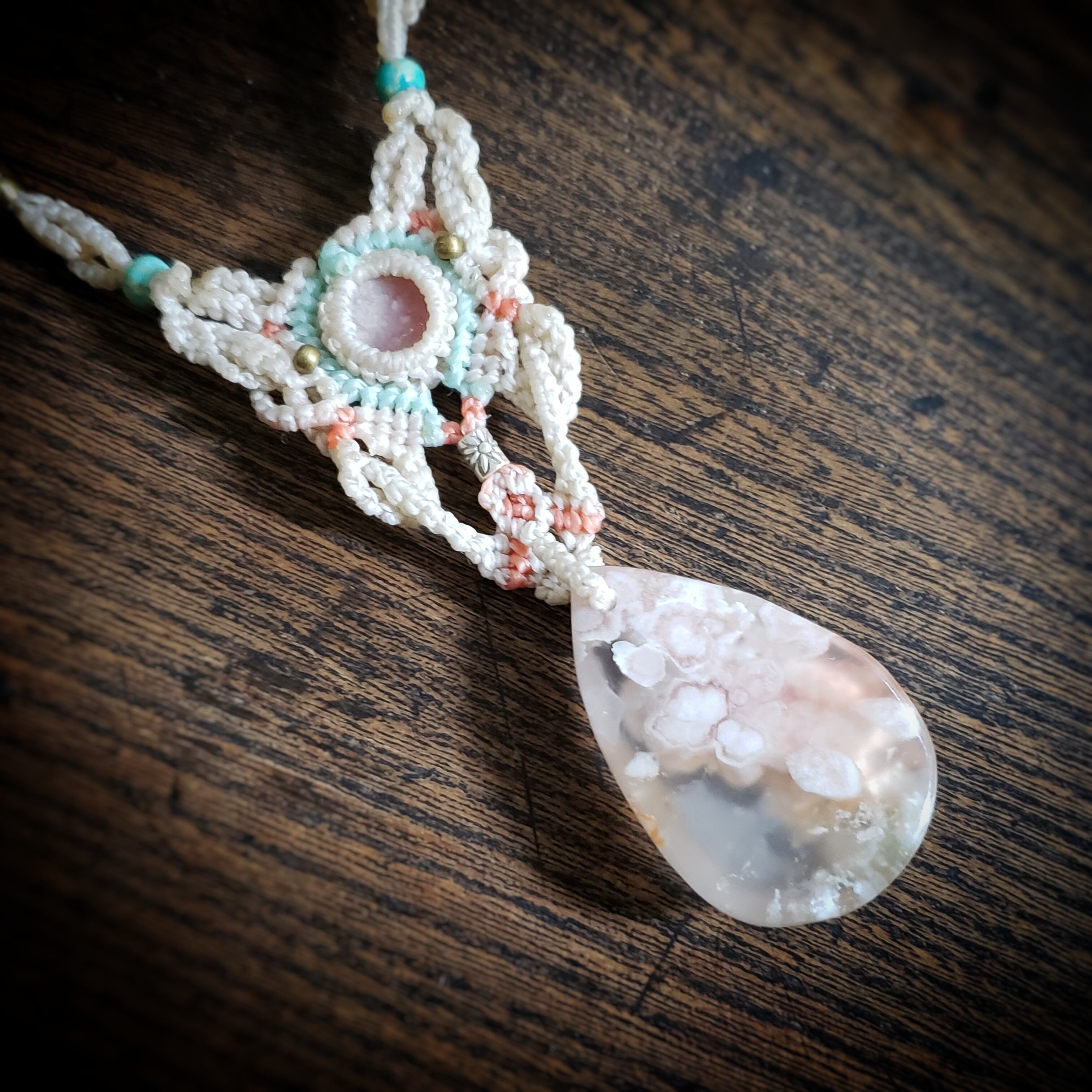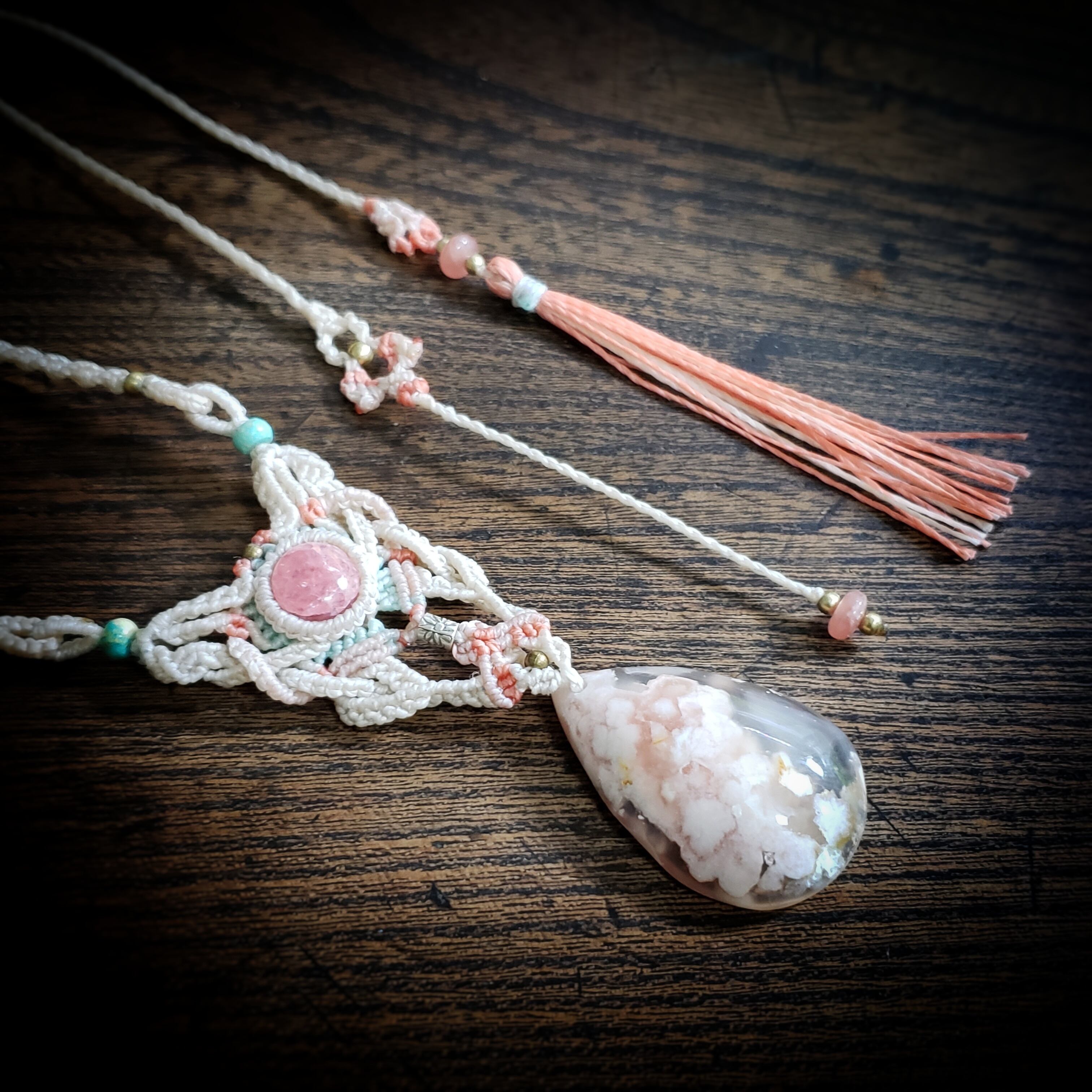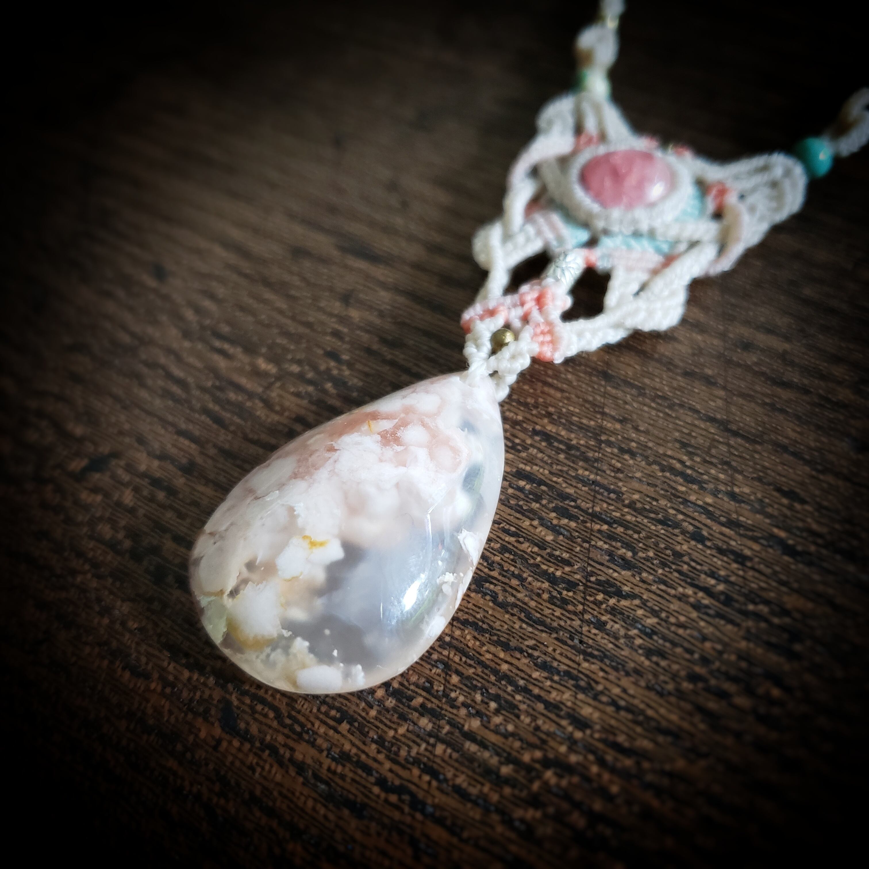 チェリーブロッサムアゲートとインカローズのマクラメ編みネックレス