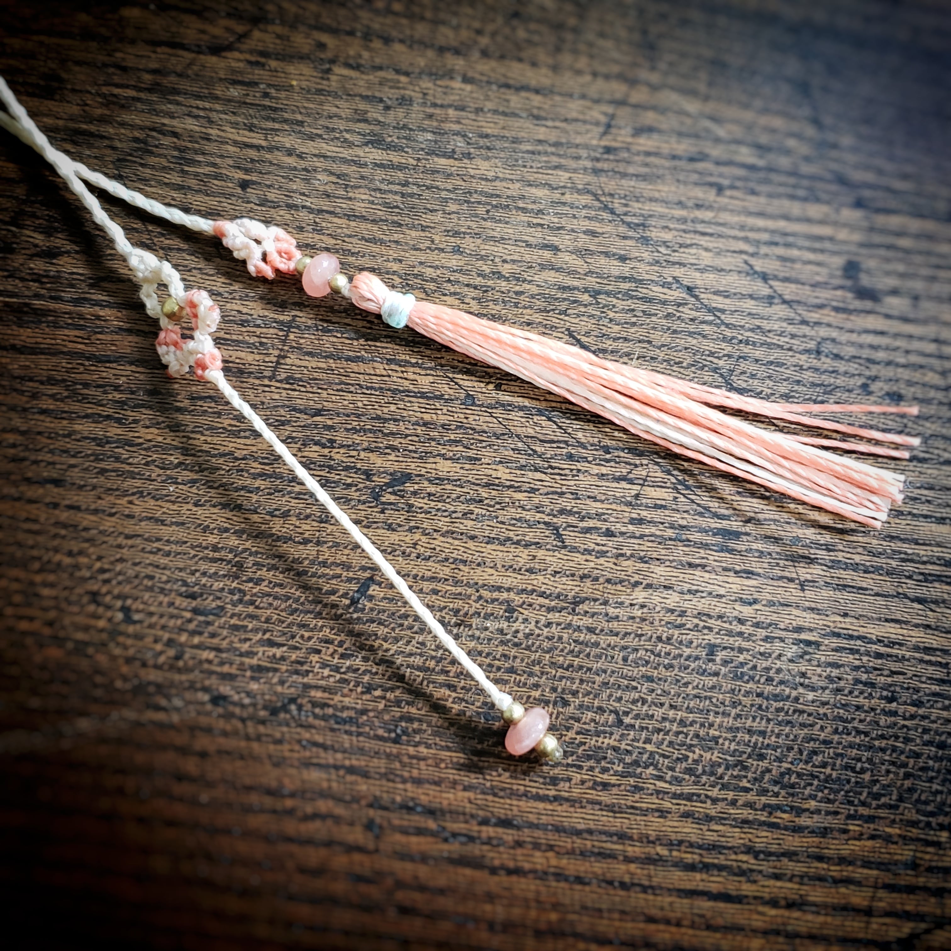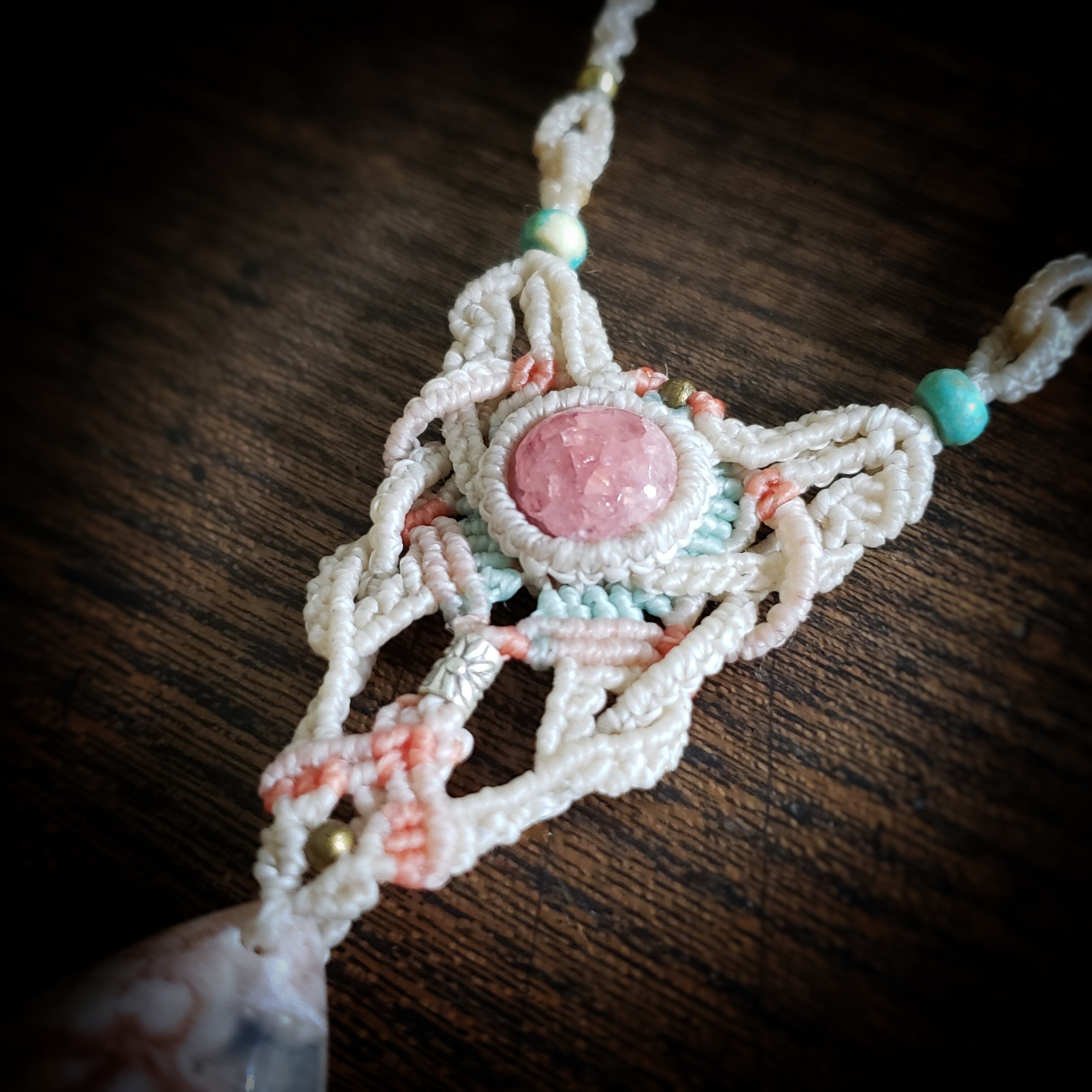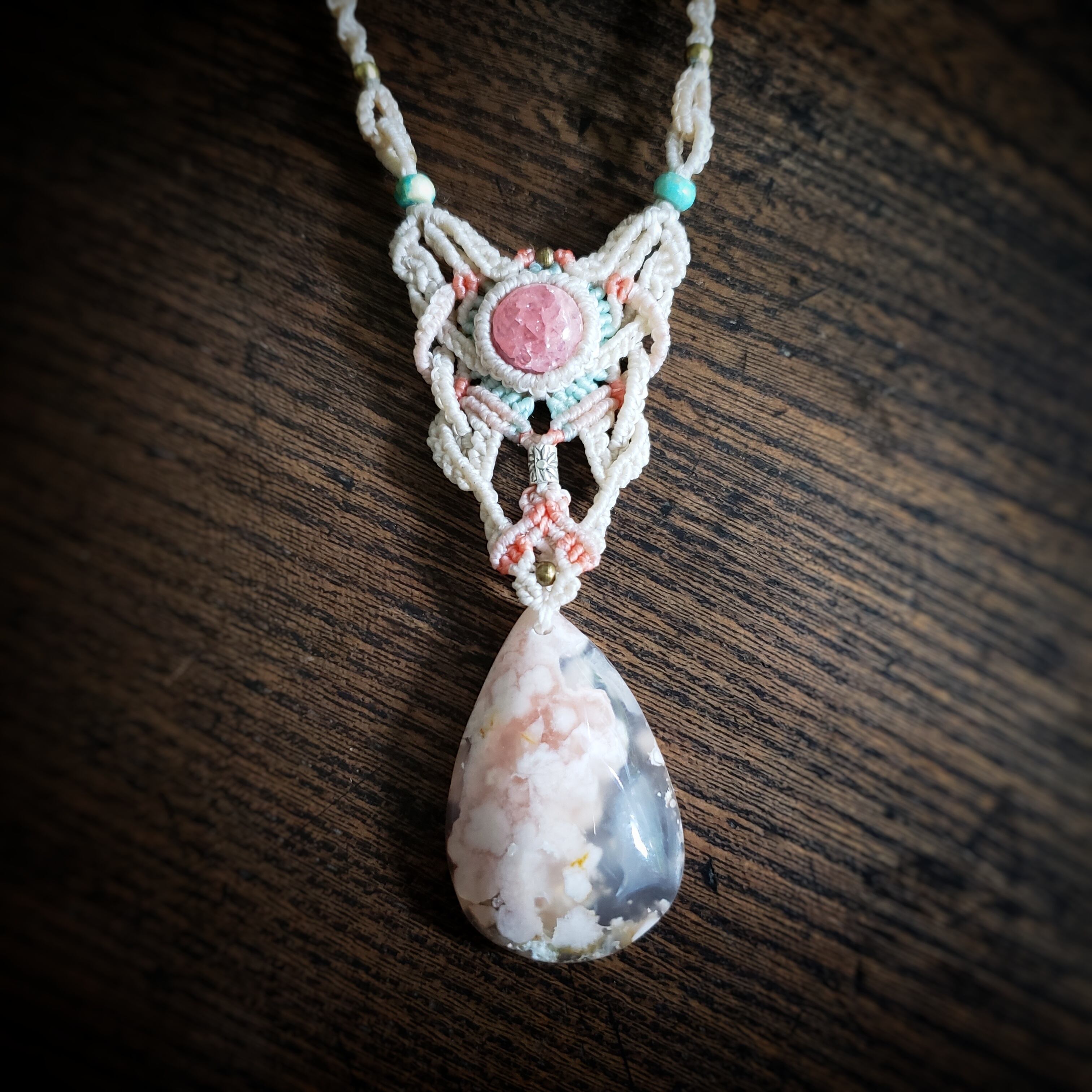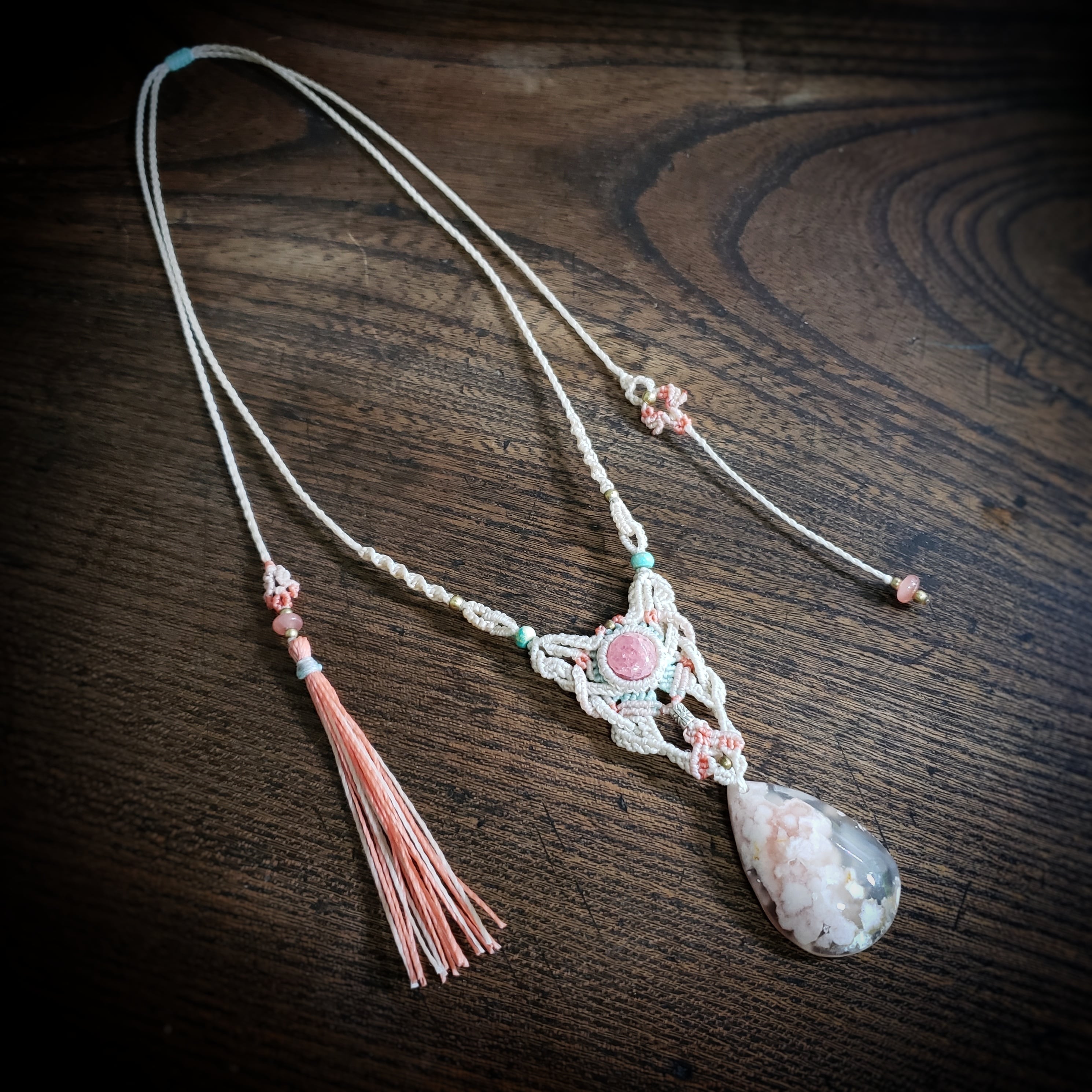 チェリーブロッサムアゲートとインカローズのマクラメ編みネックレス