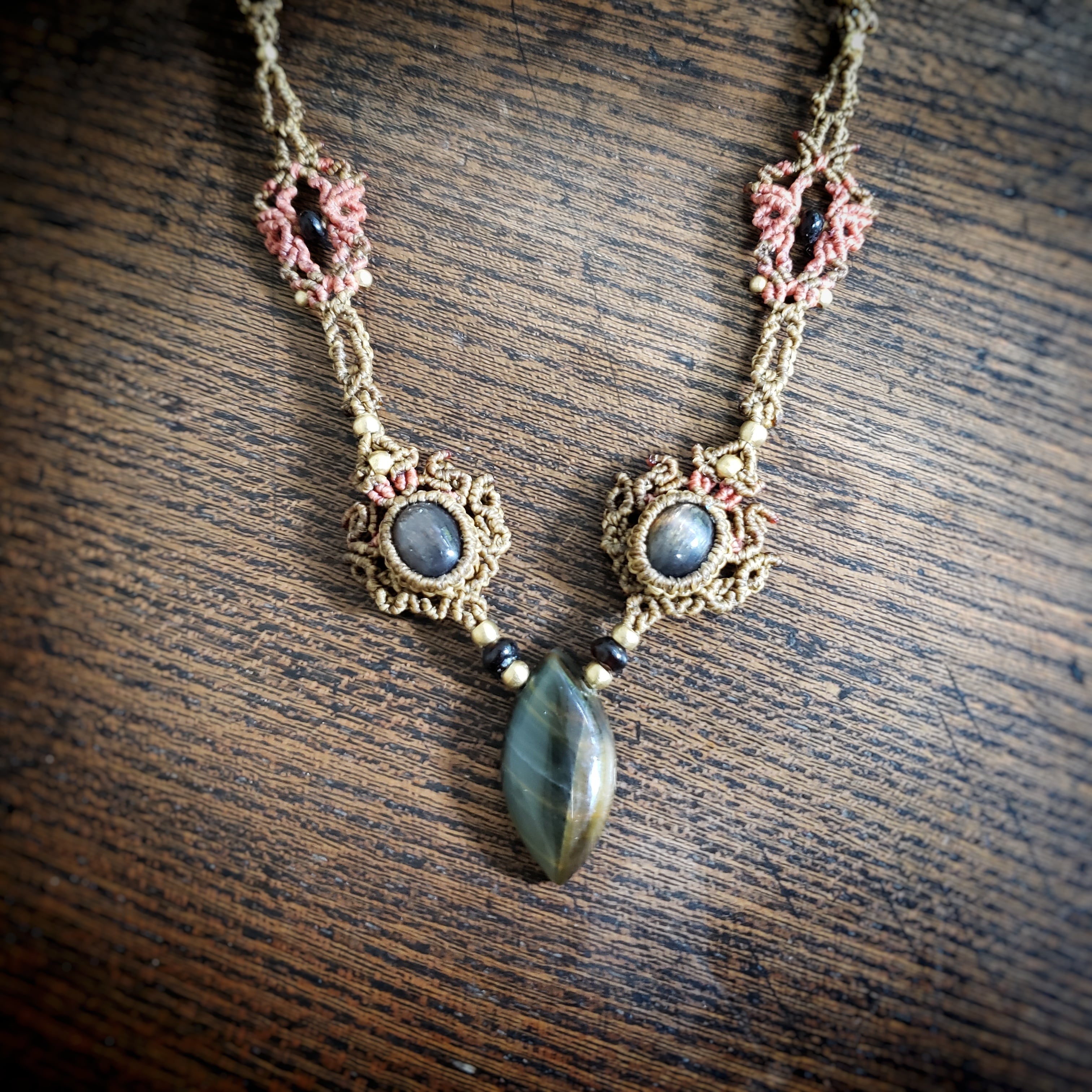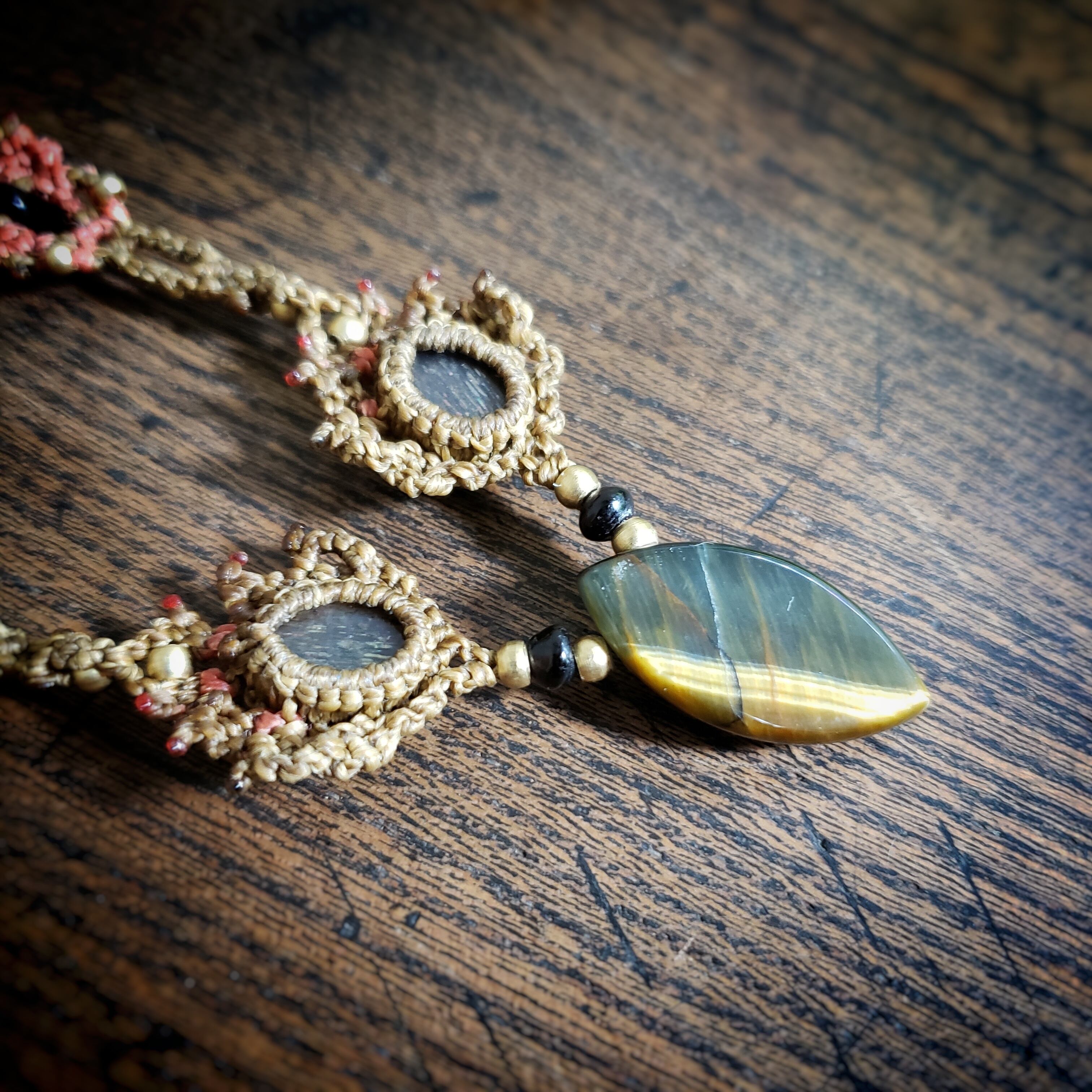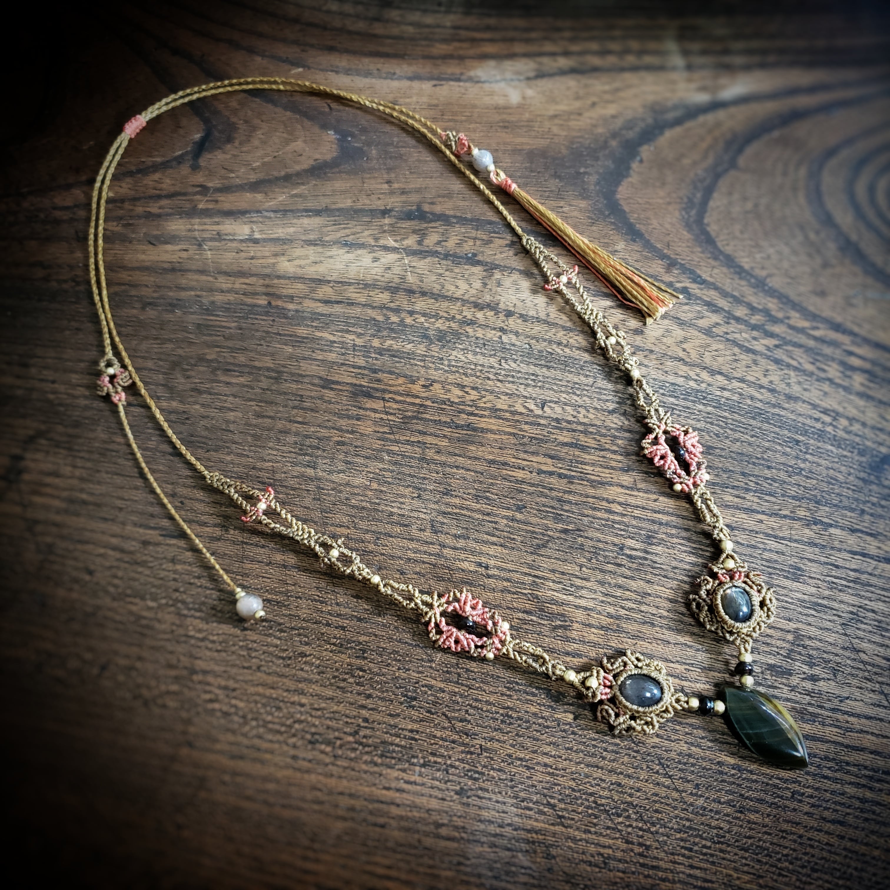 「タイガーアイ」と「サンムーンストーン」のマクラメ編みネックレス