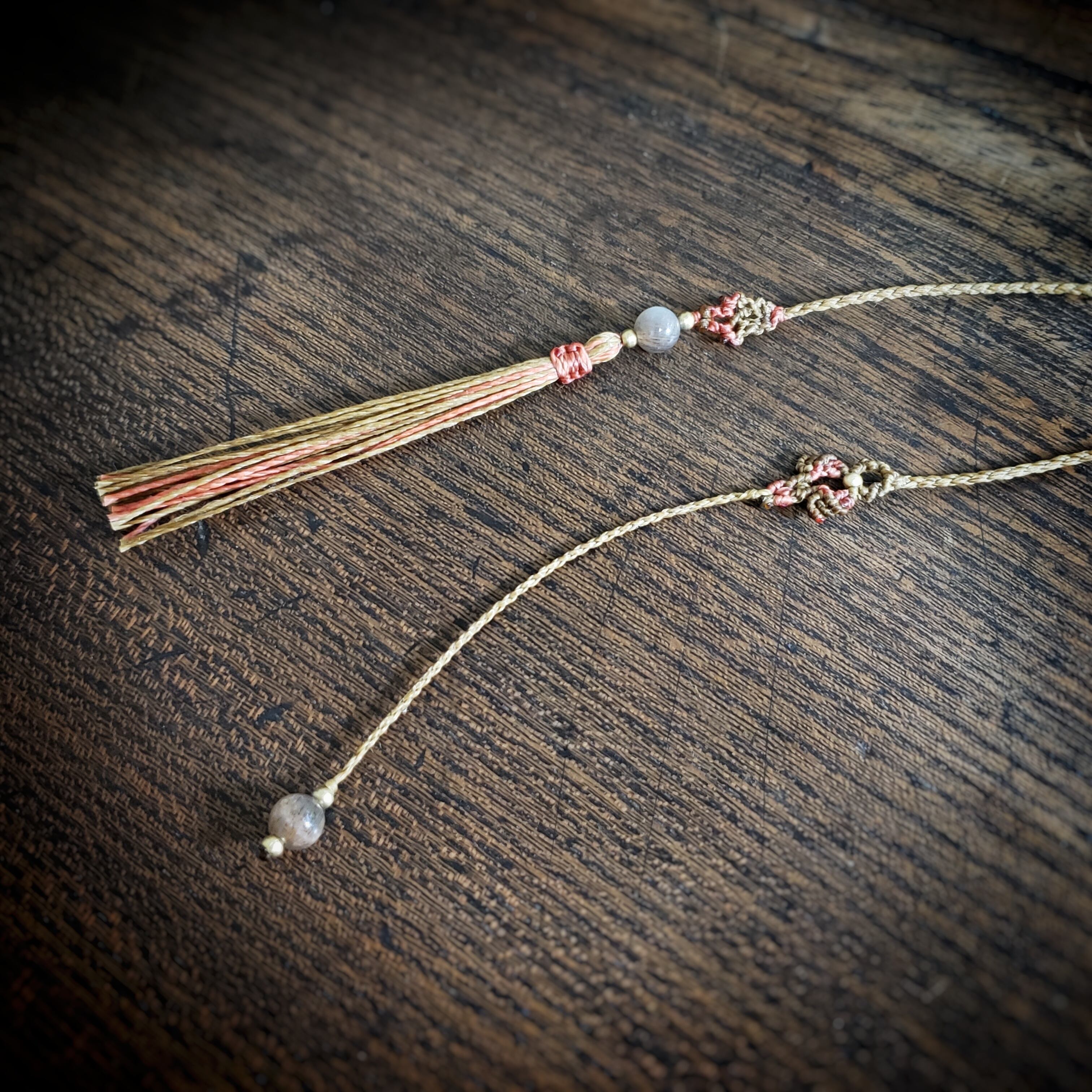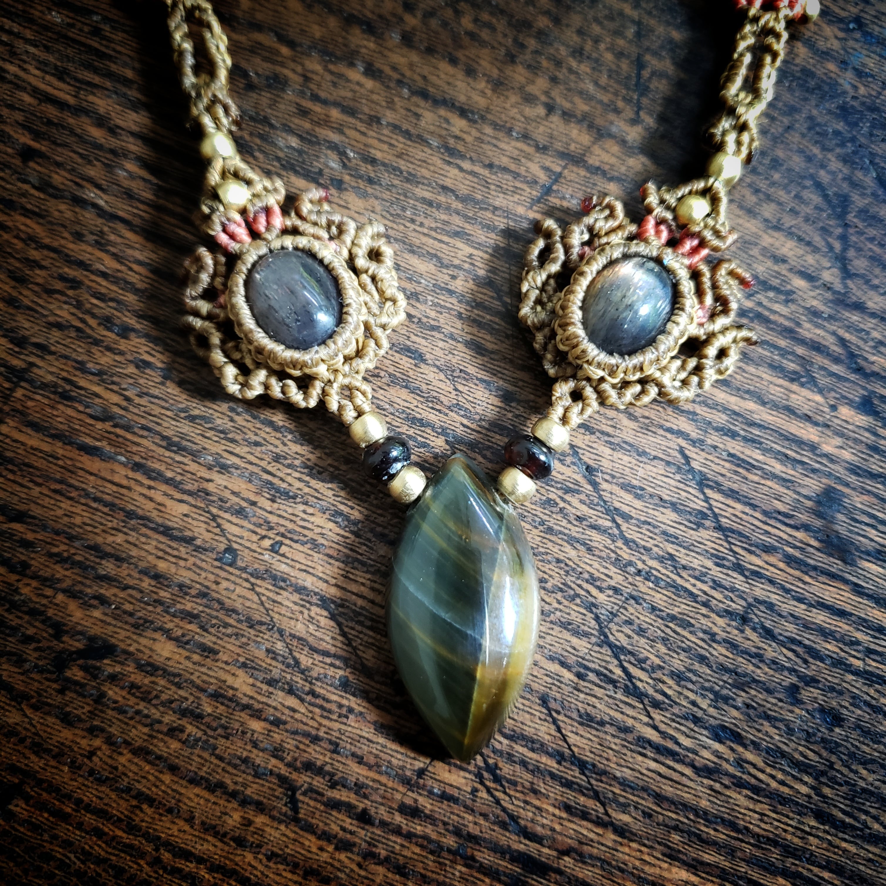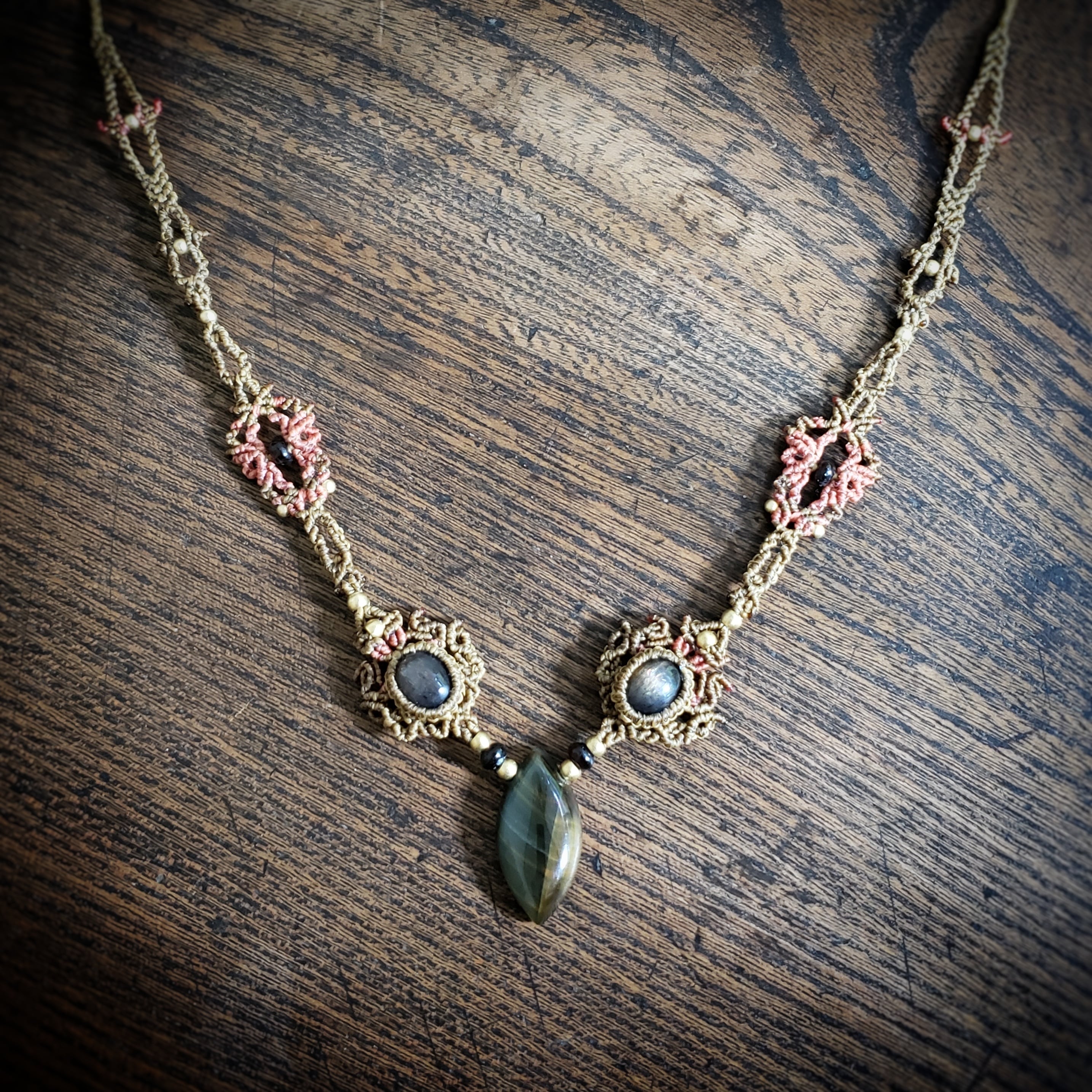 「タイガーアイ」と「サンムーンストーン」のマクラメ編みネックレス
