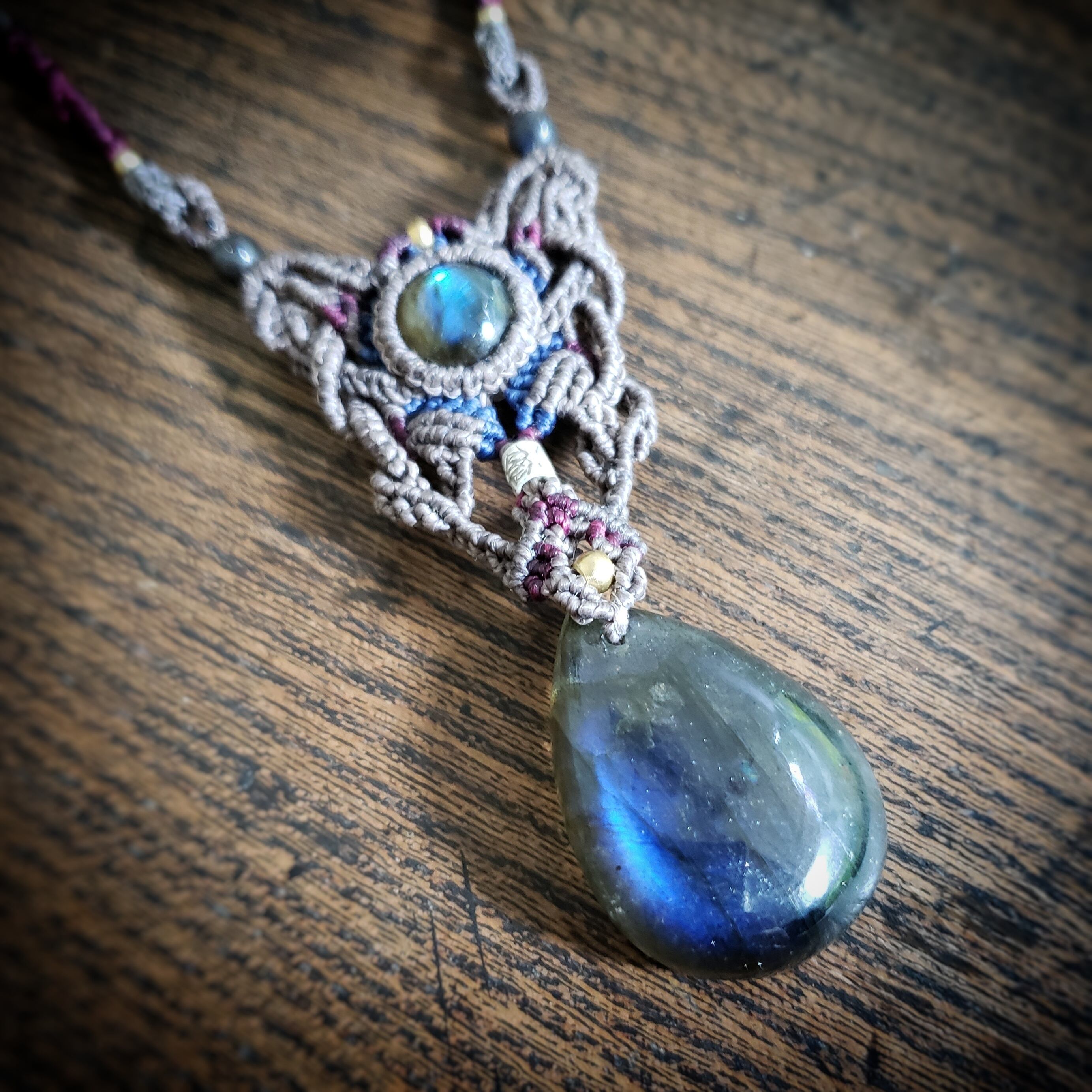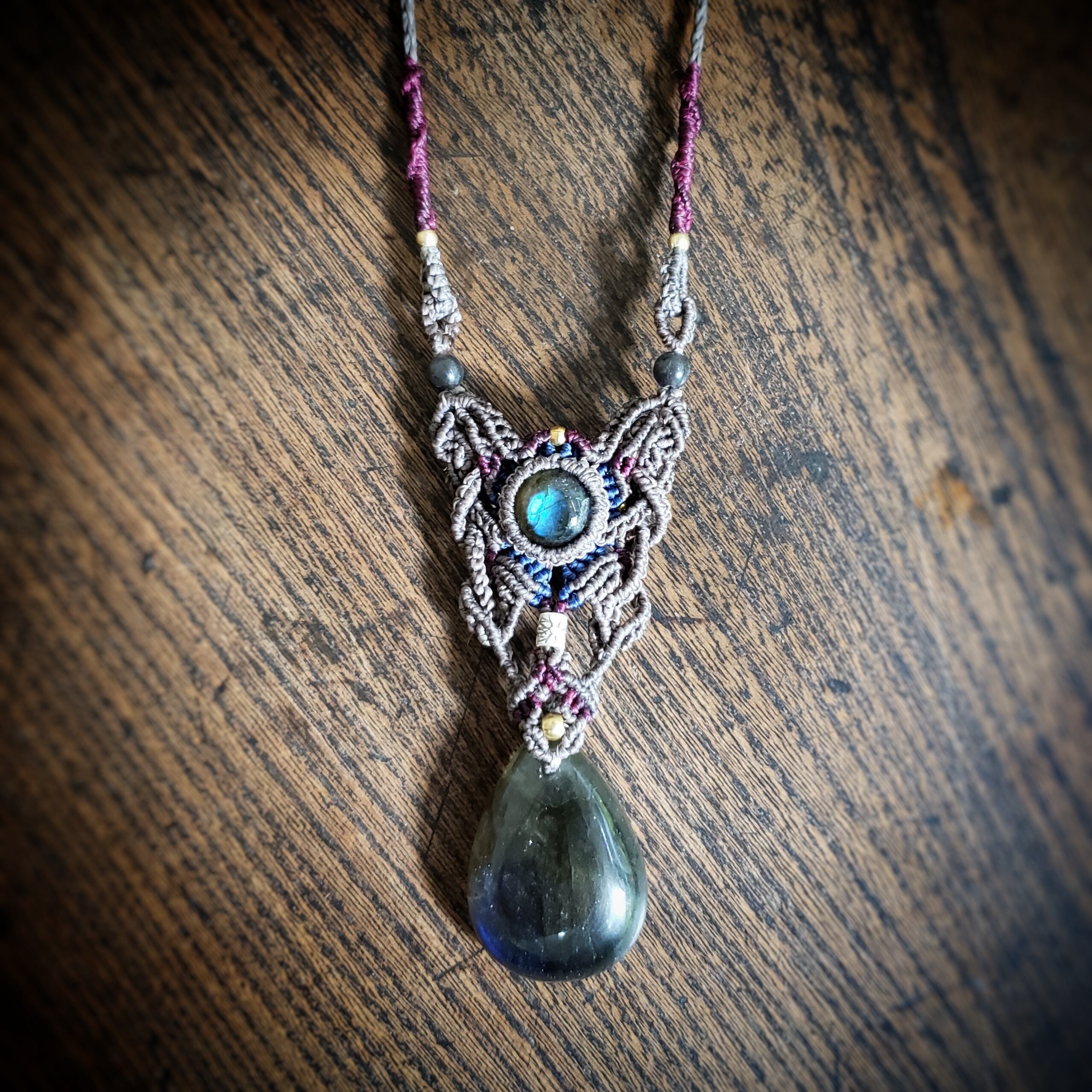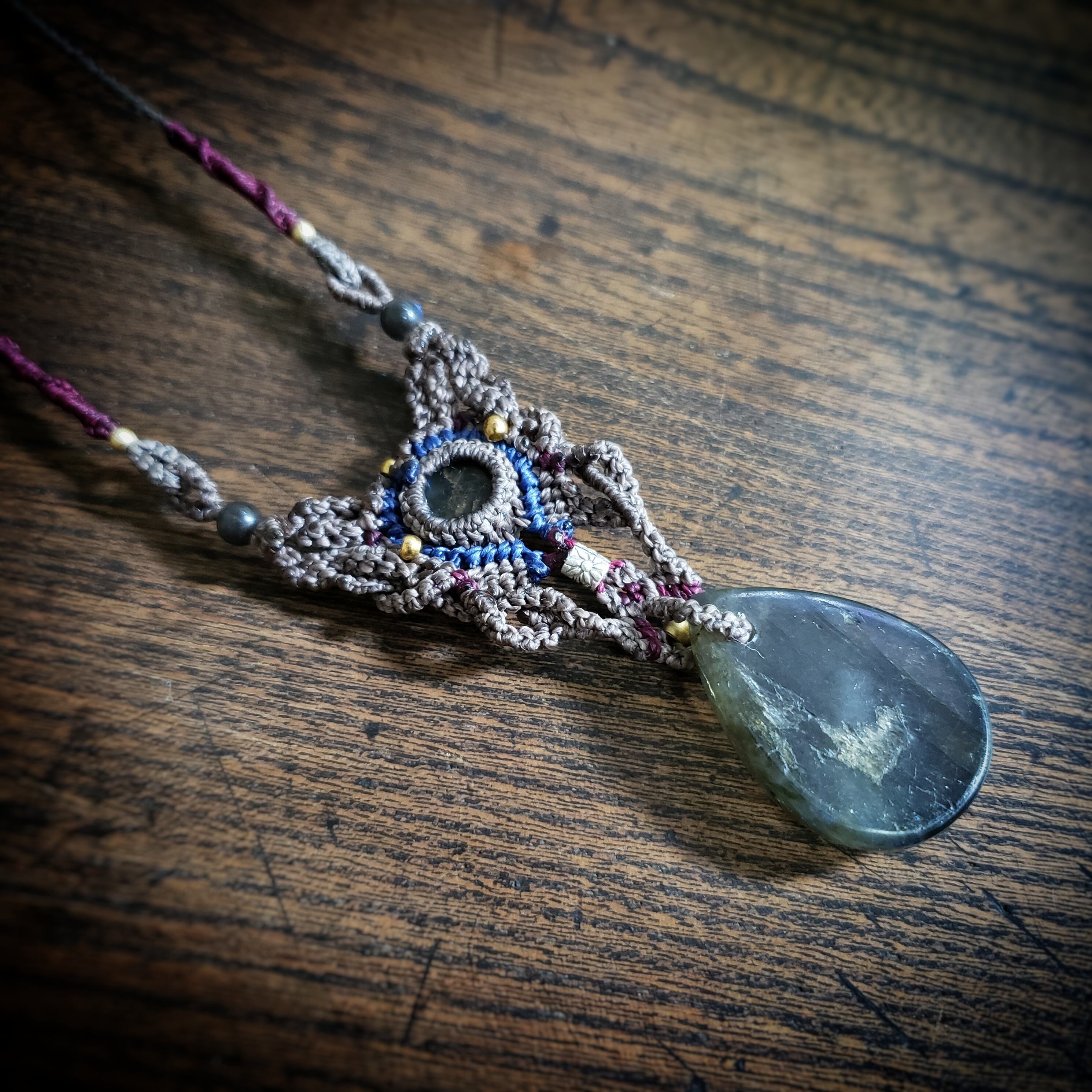 ラブラドライトとオーラライト23のマクラメ編みネックレス