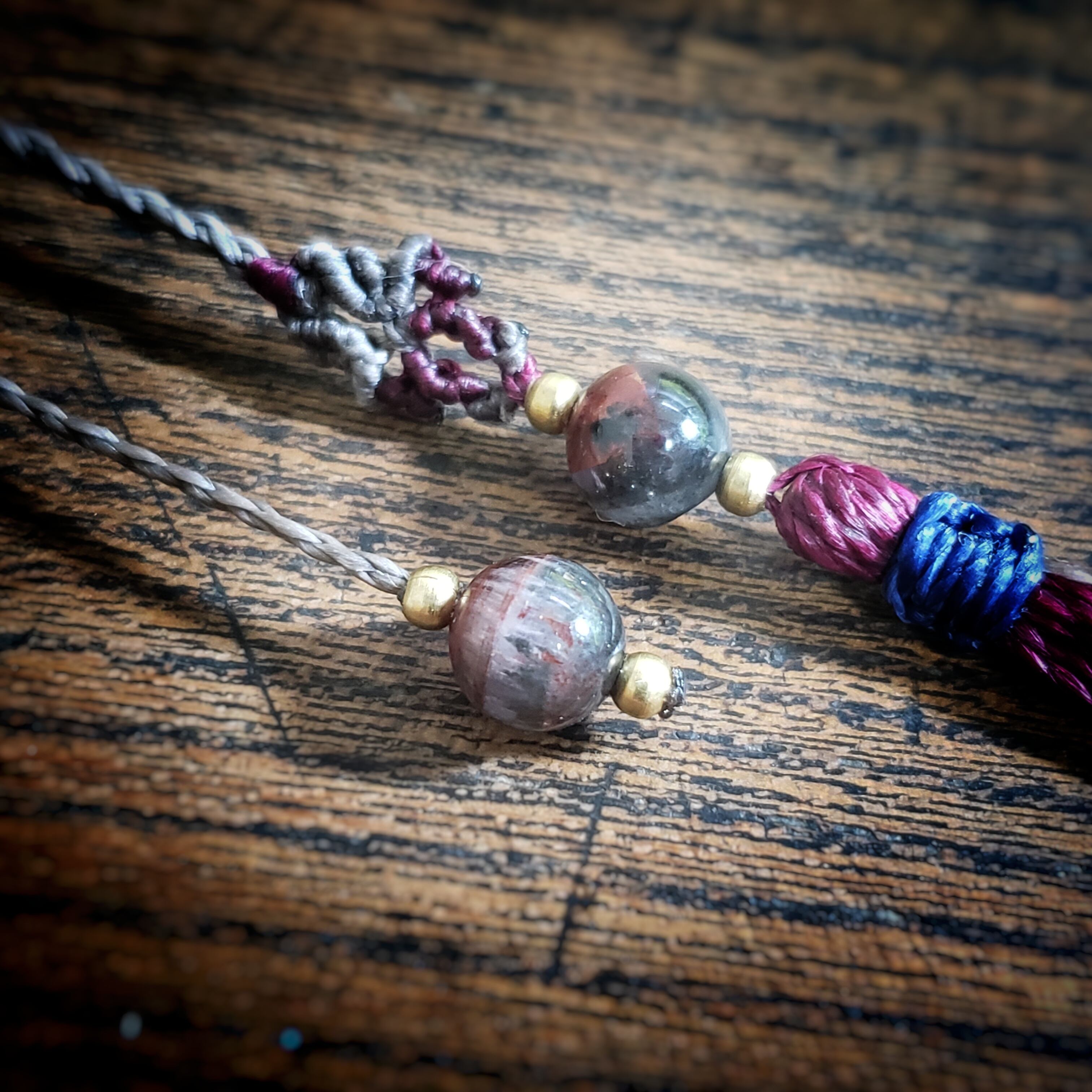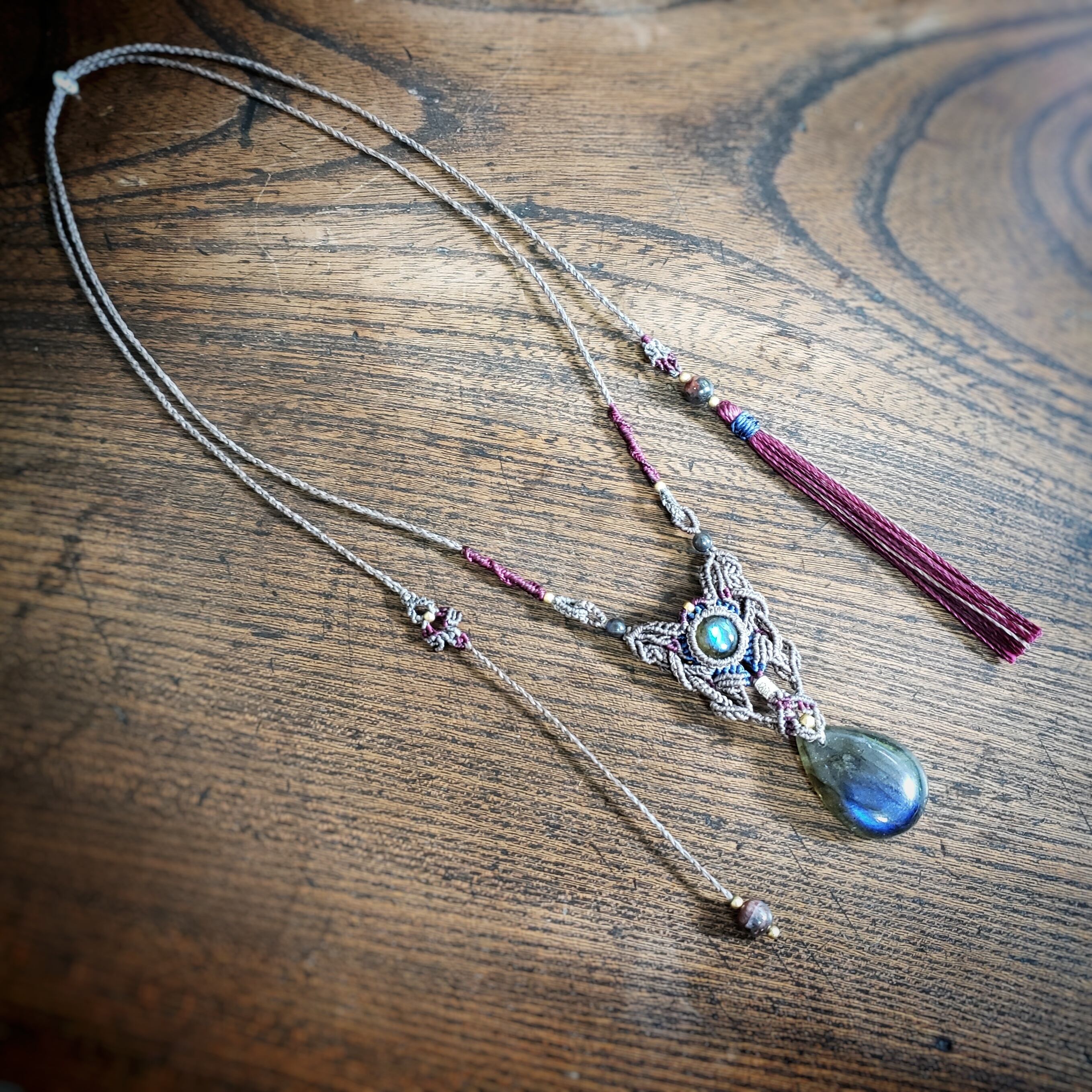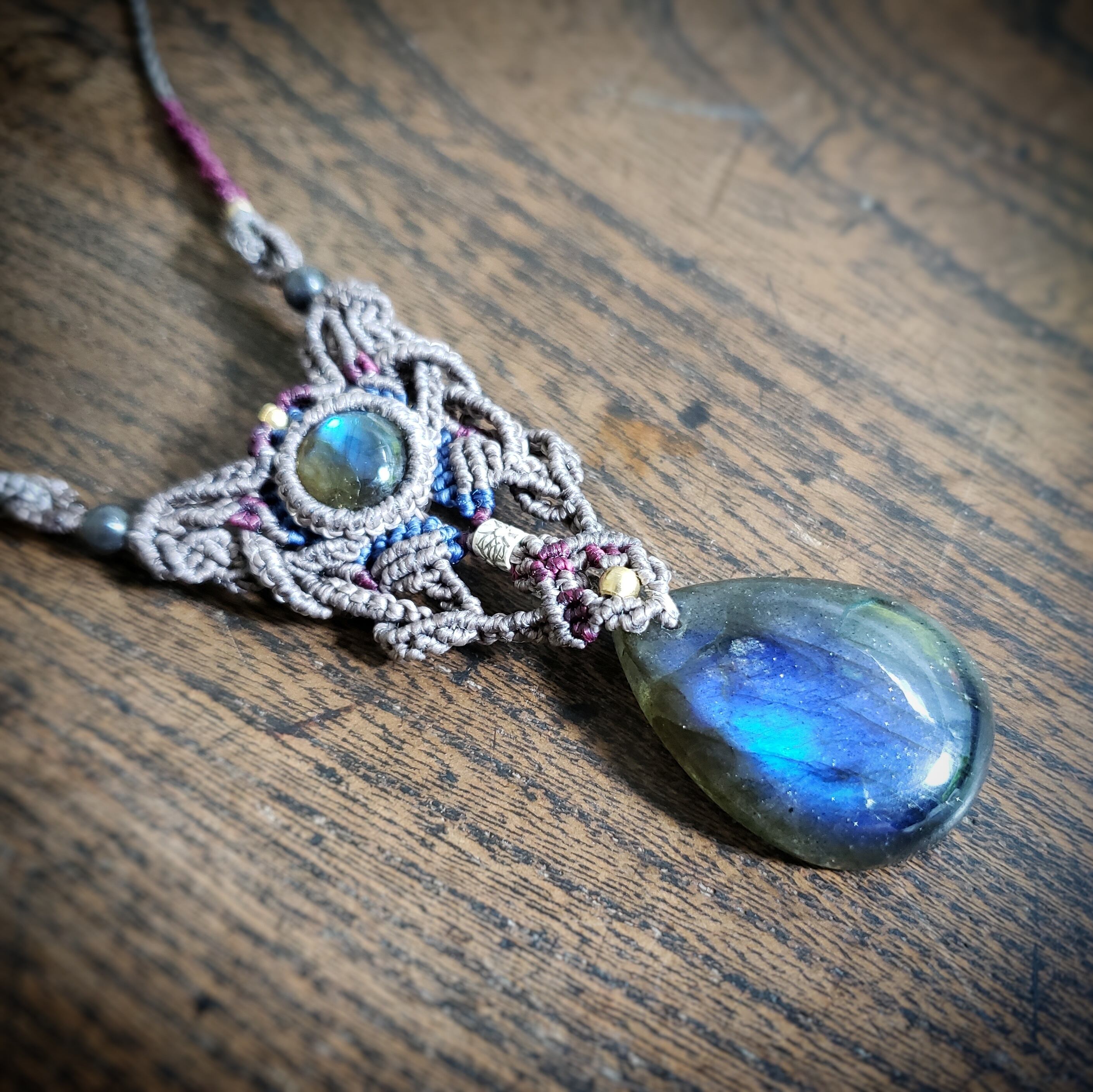 ラブラドライトとオーラライト23のマクラメ編みネックレス
