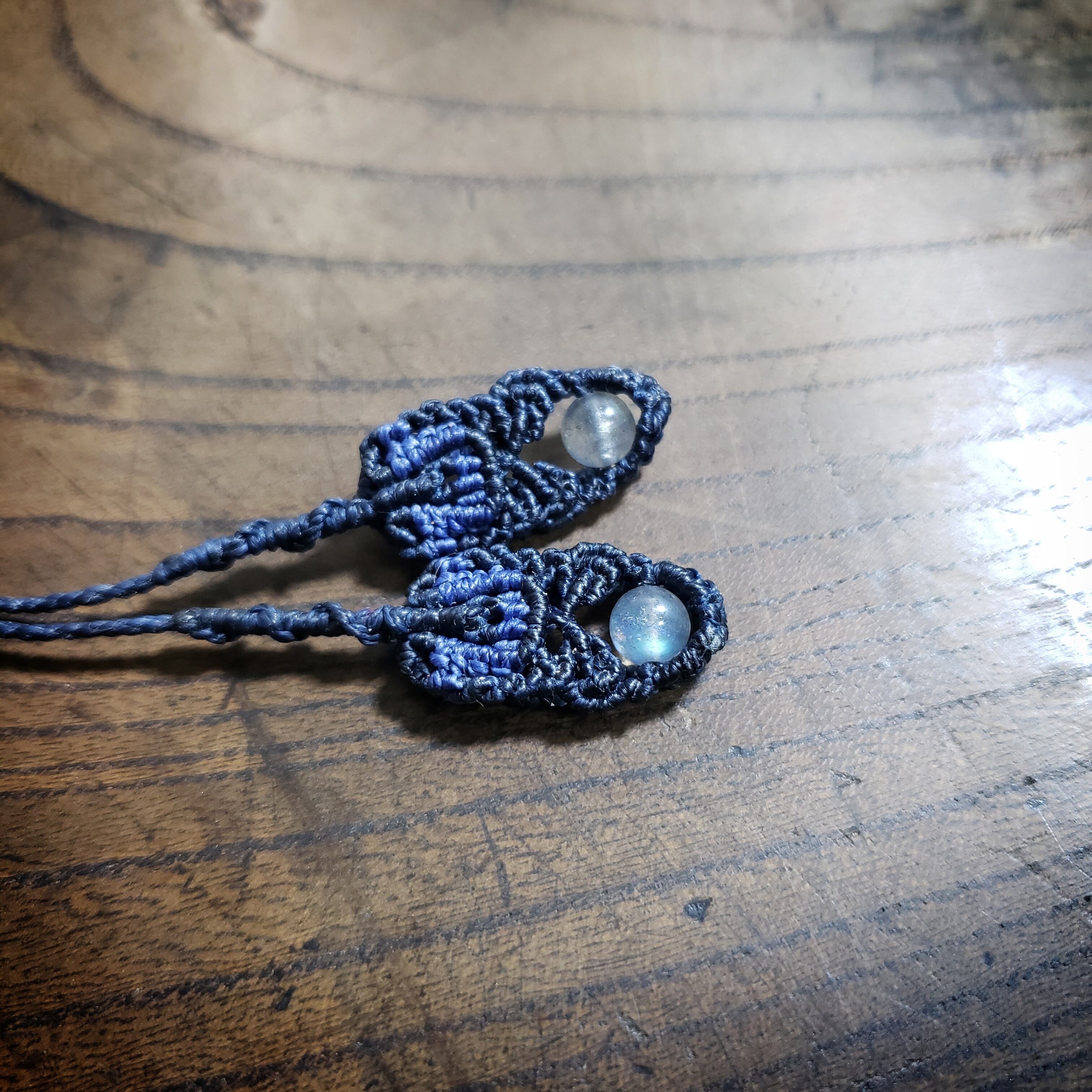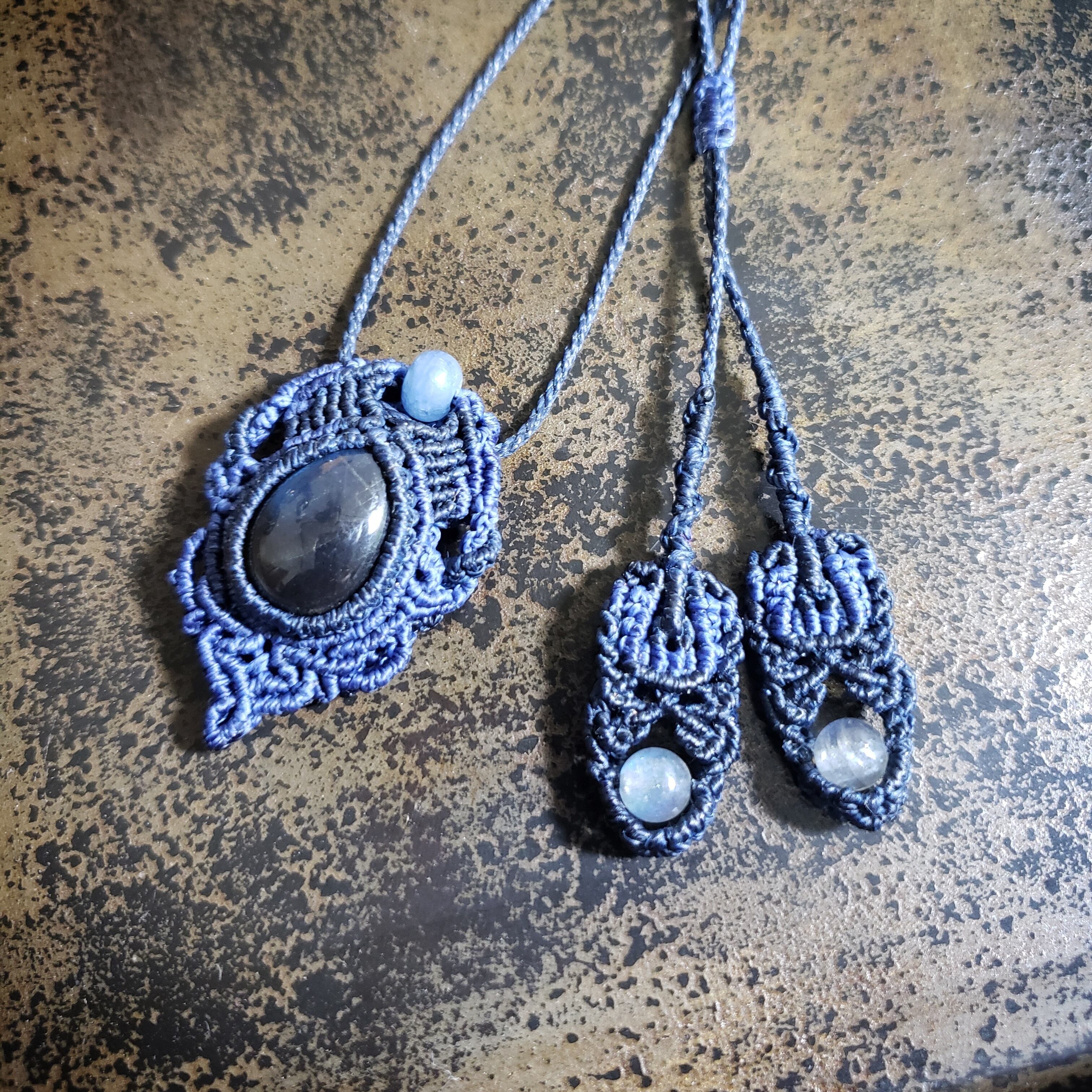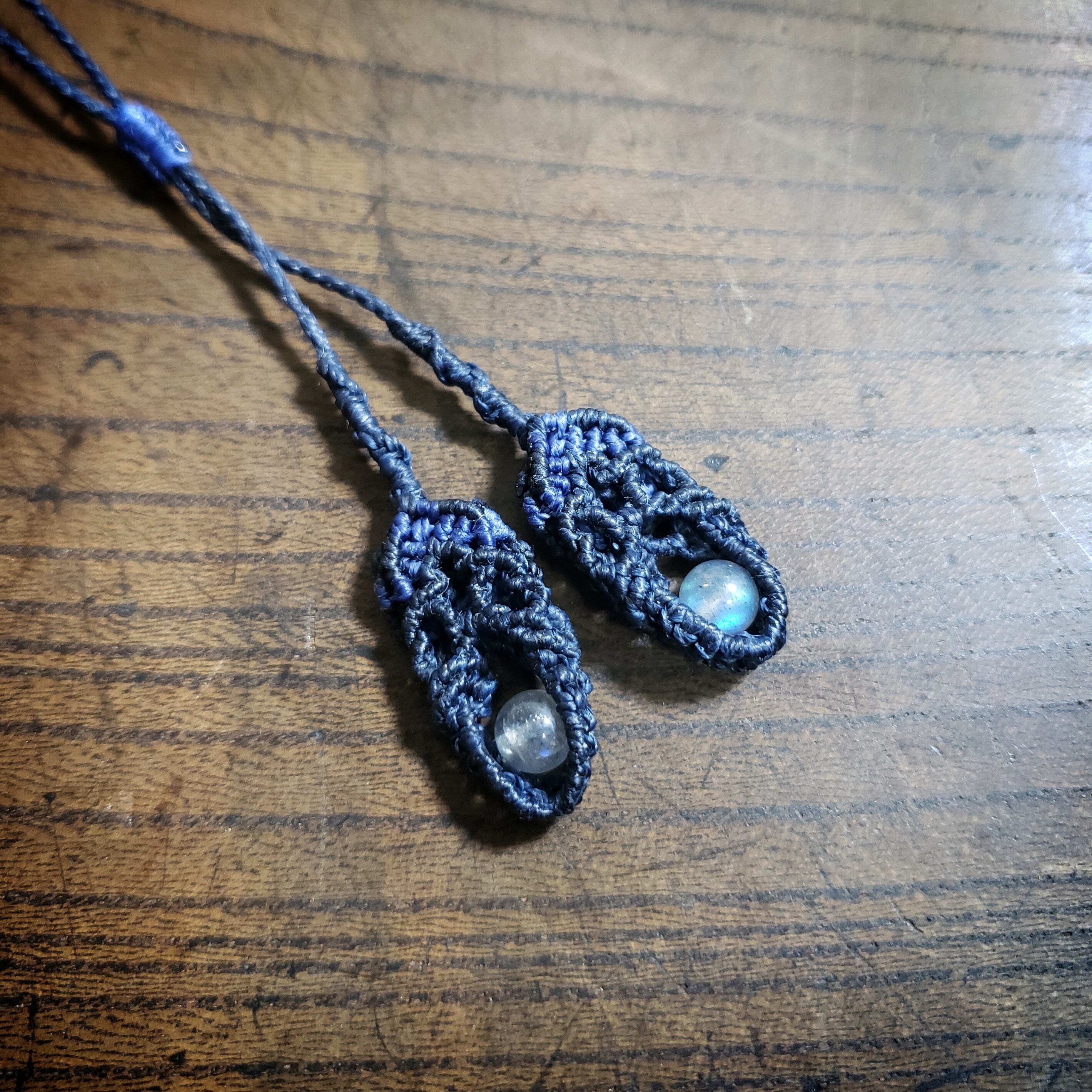 こちらは、ラブラドライトのマクラメ編みネックレスです。