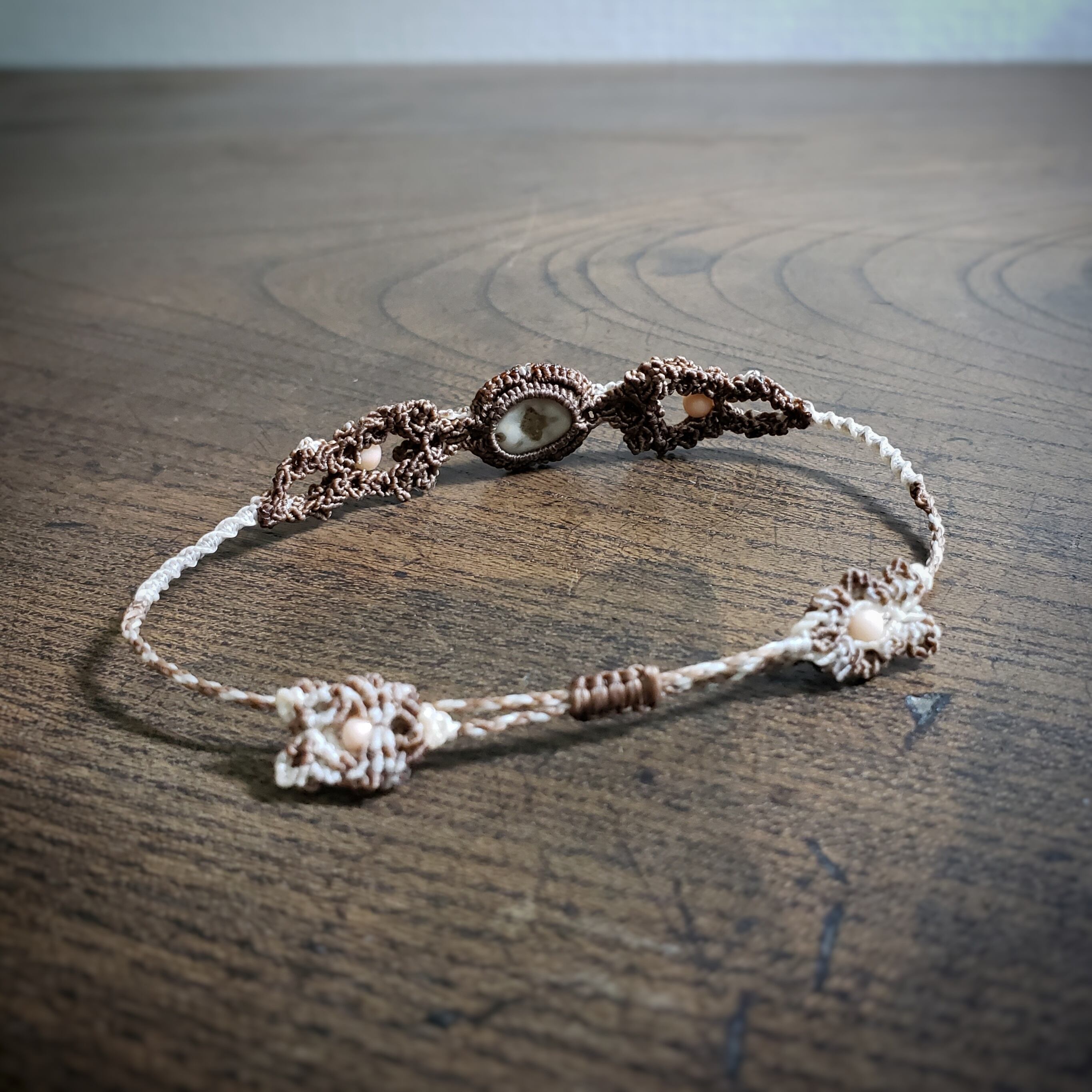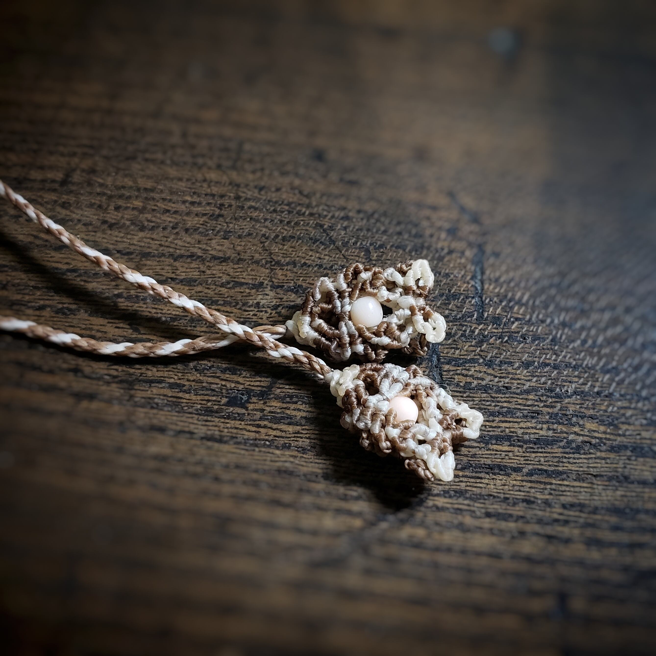 ワックスコード(蝋引き紐)細い0.5ミリを更に割いて、極細の0.25㎜にして編みました。