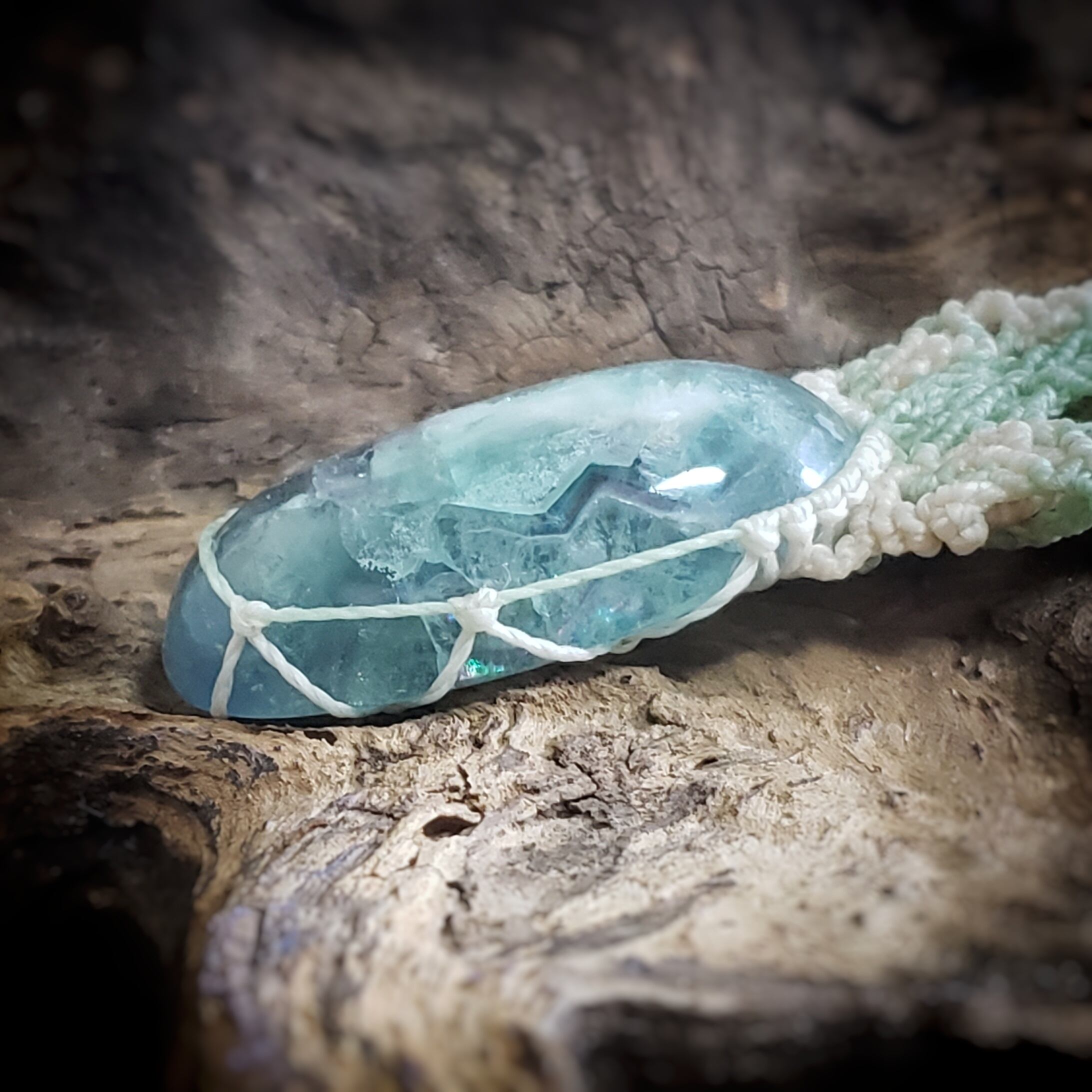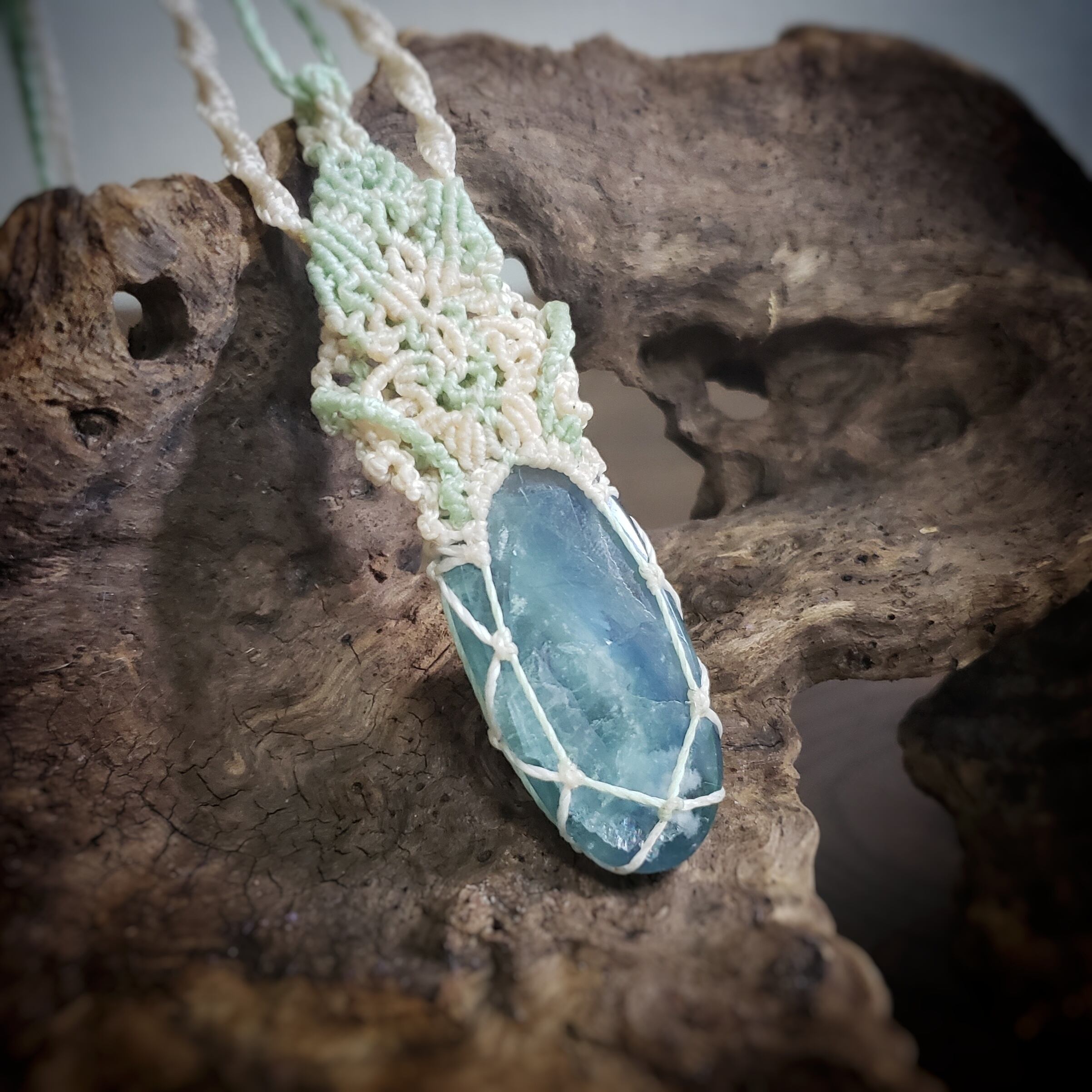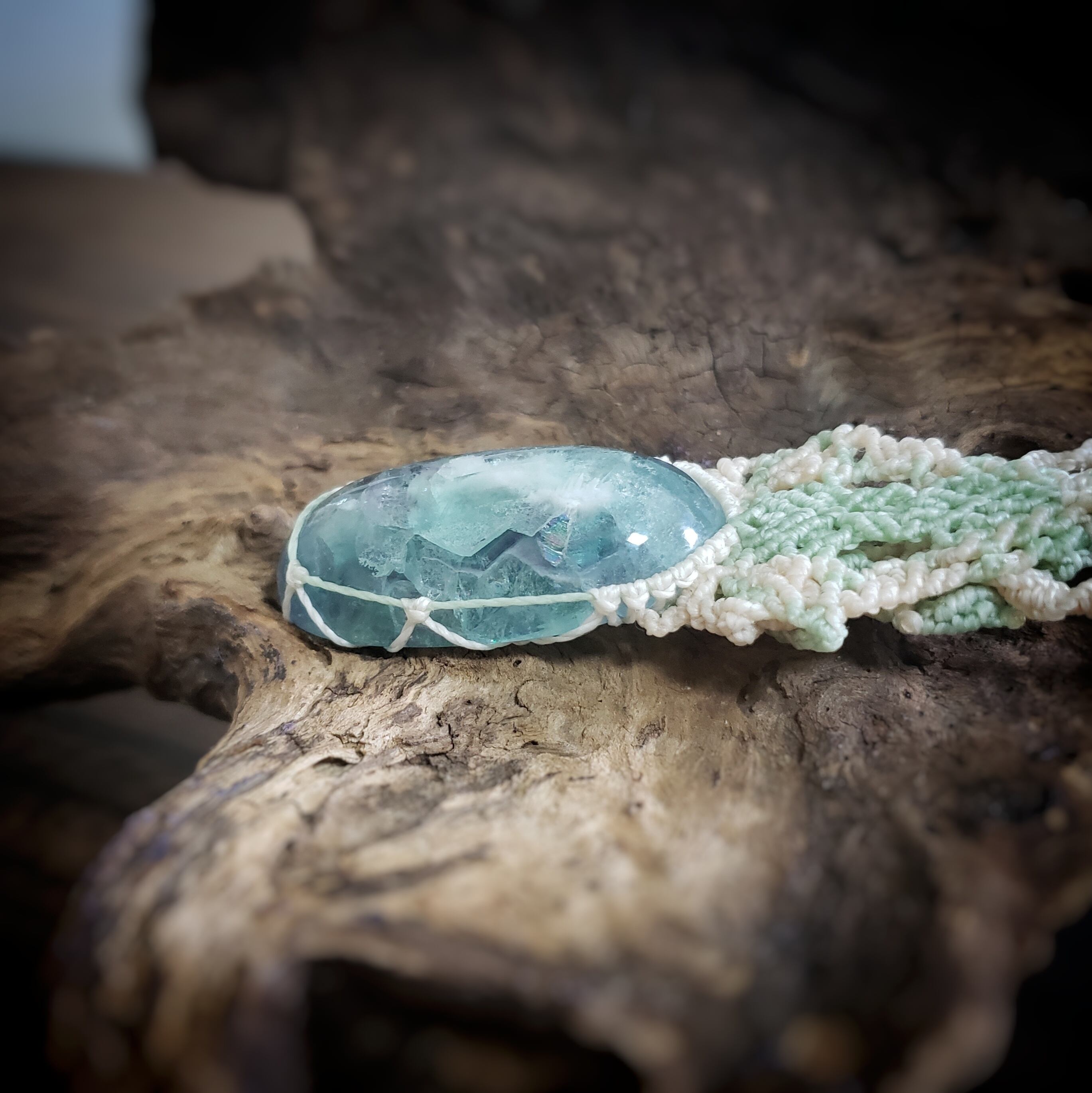 こちらは、「エンジェルフェザーフローライト 」のマクラメ編みネックレスです。