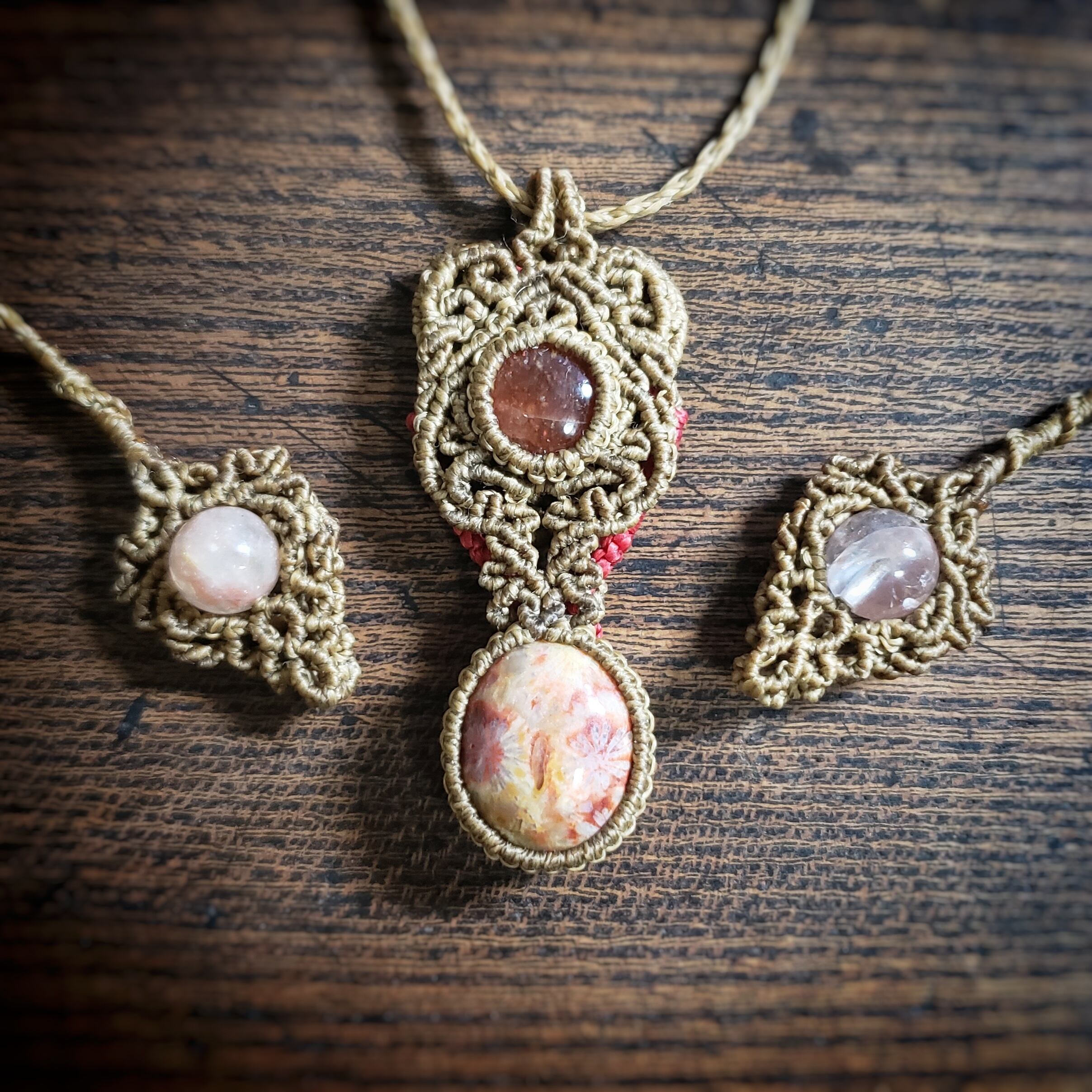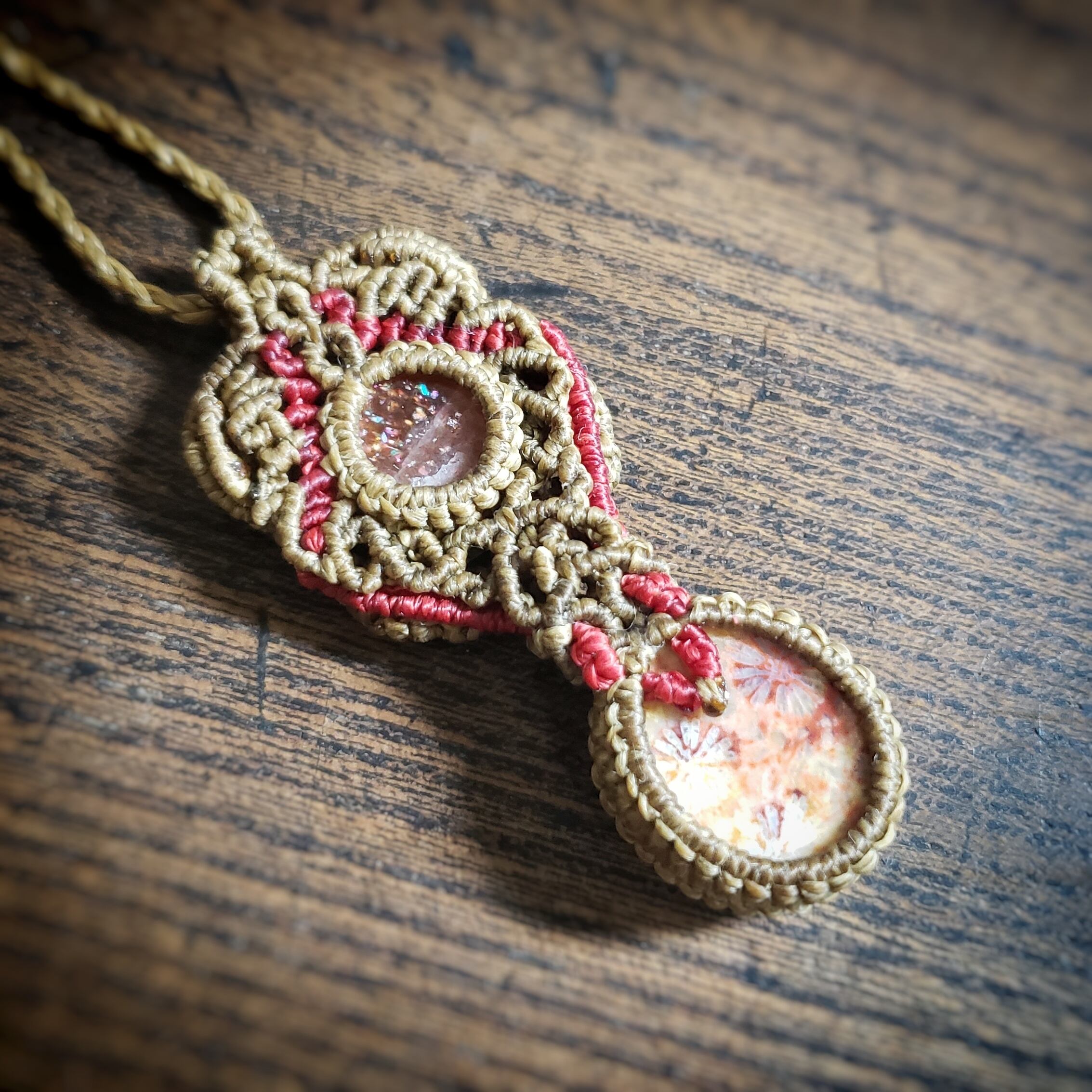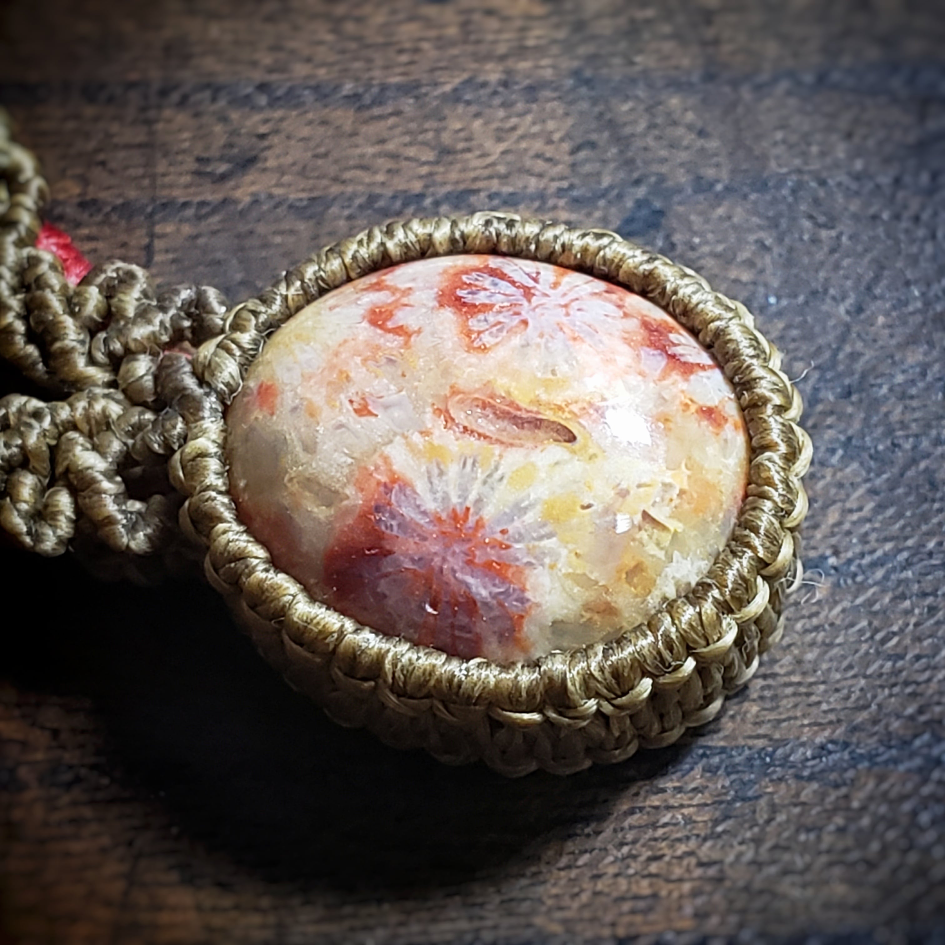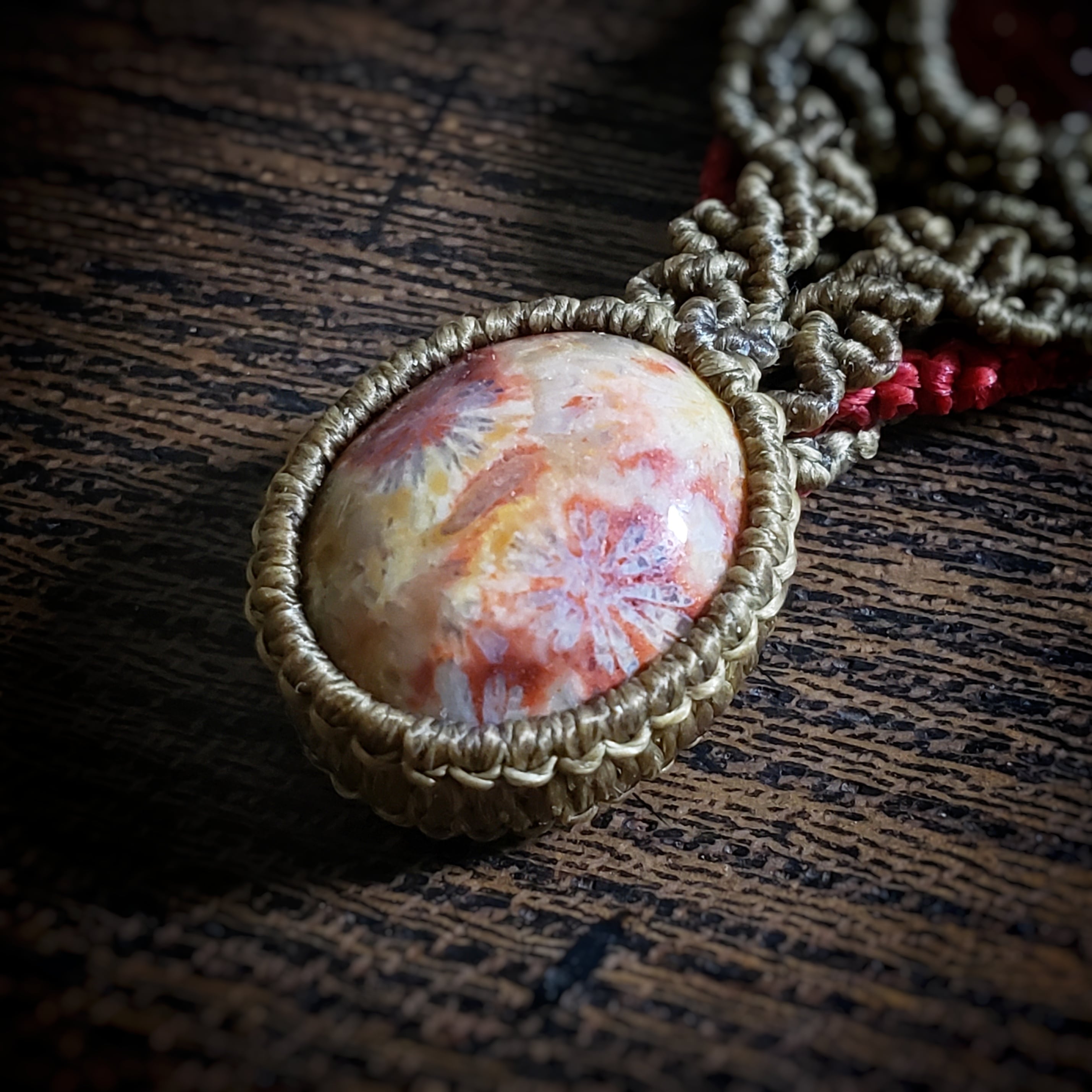 こちらは、「サンストーン 」と「フォッシルコーラル 」のマクラメ編み首飾りのご紹介です。