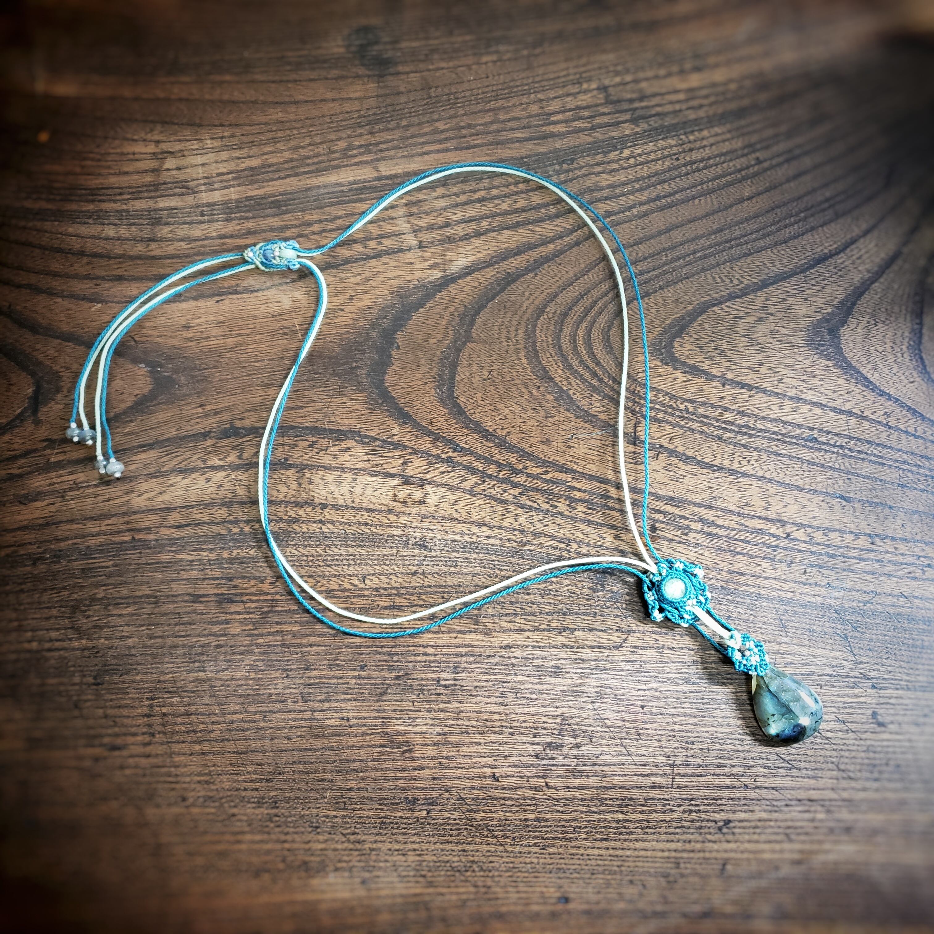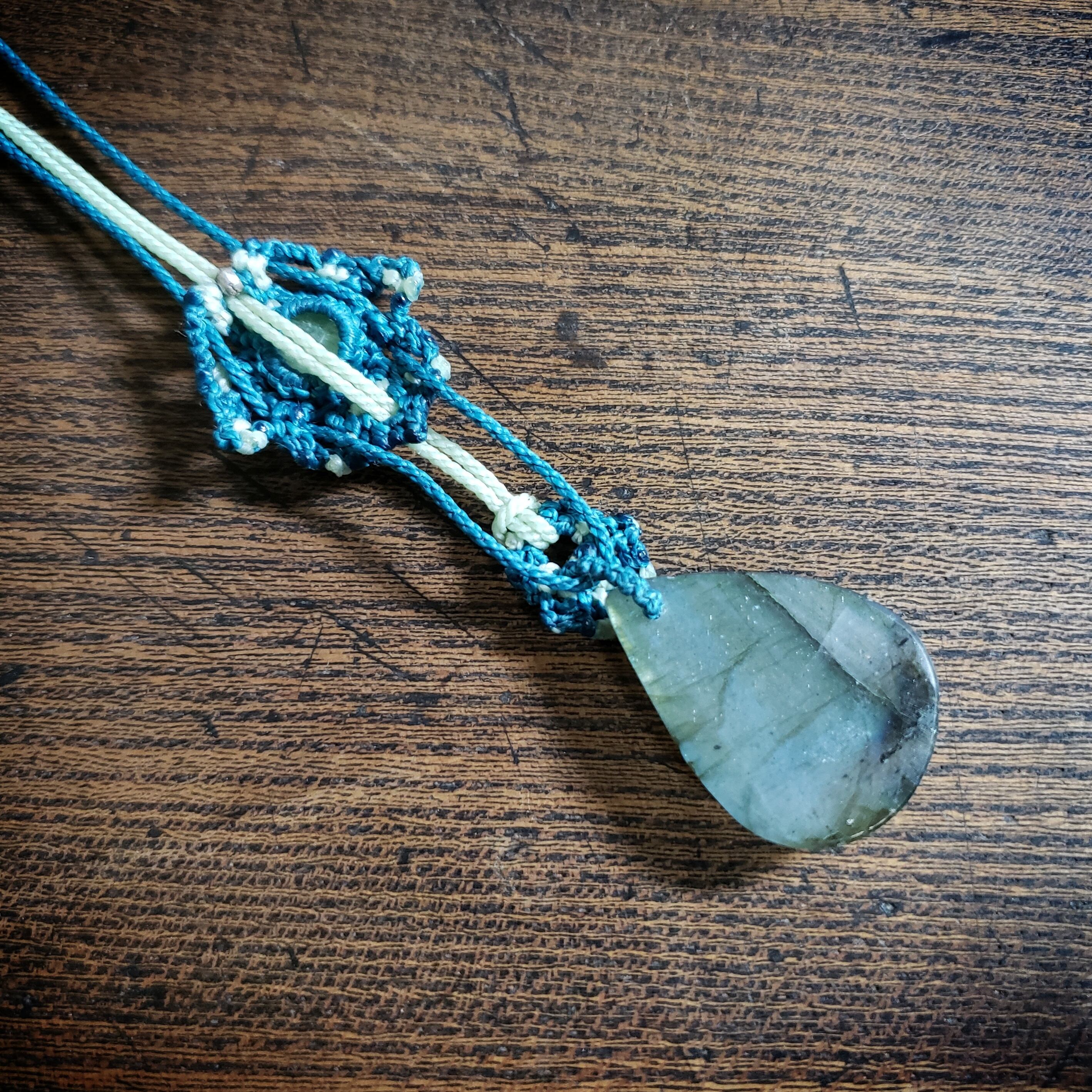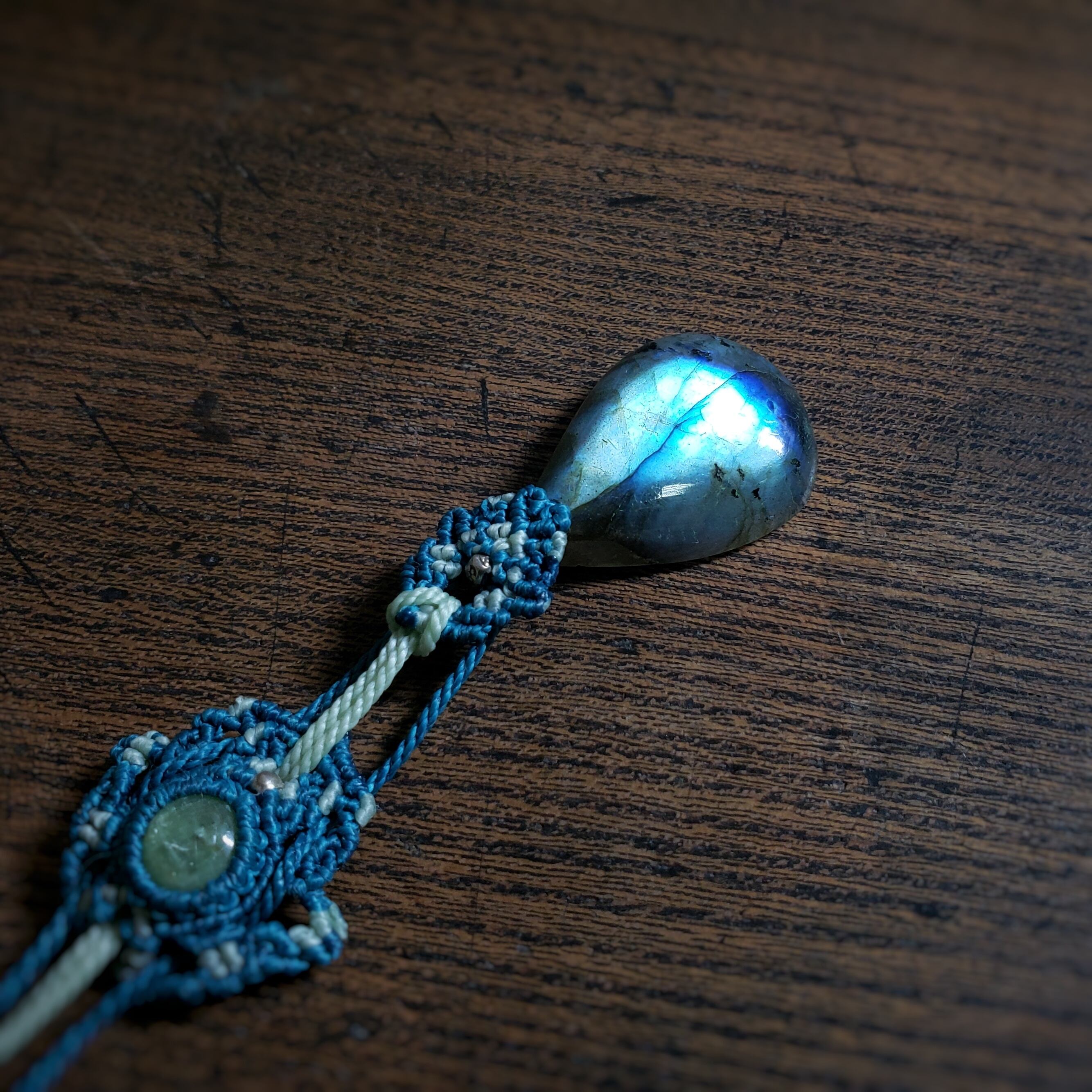「ラブラドライト」と「グリーンカイヤナイト」のマクラメ編みネックレス