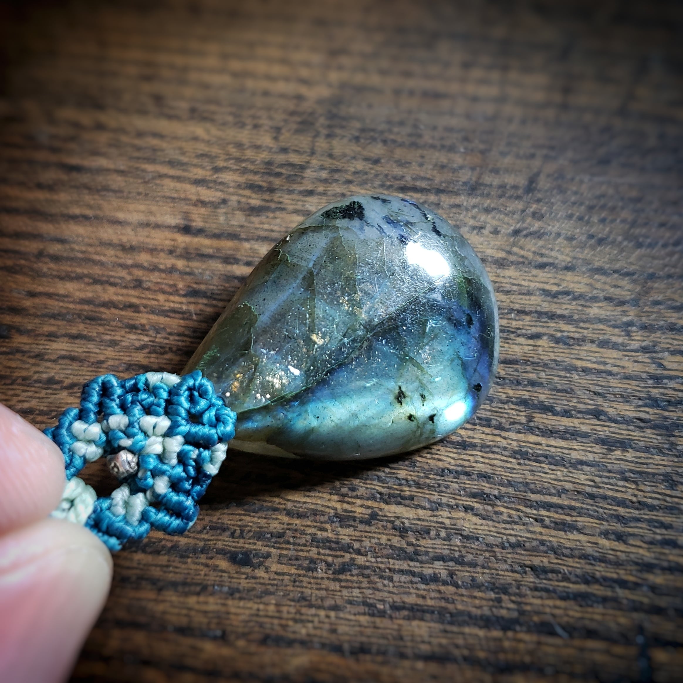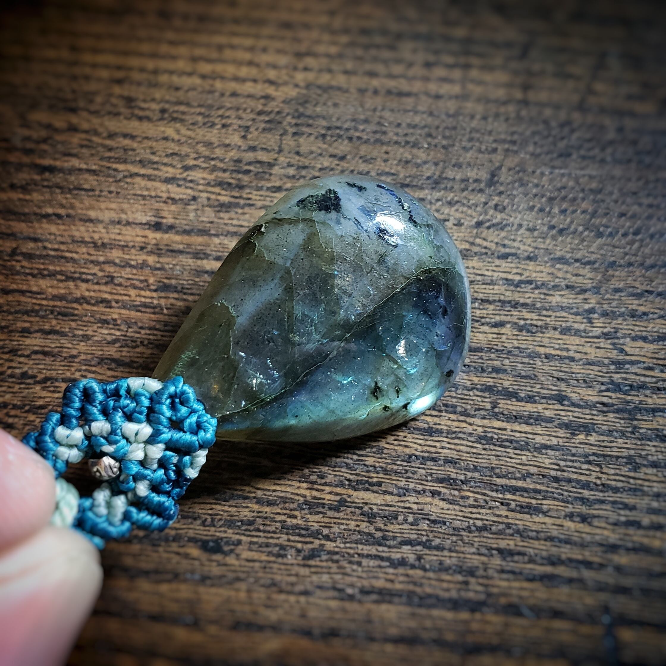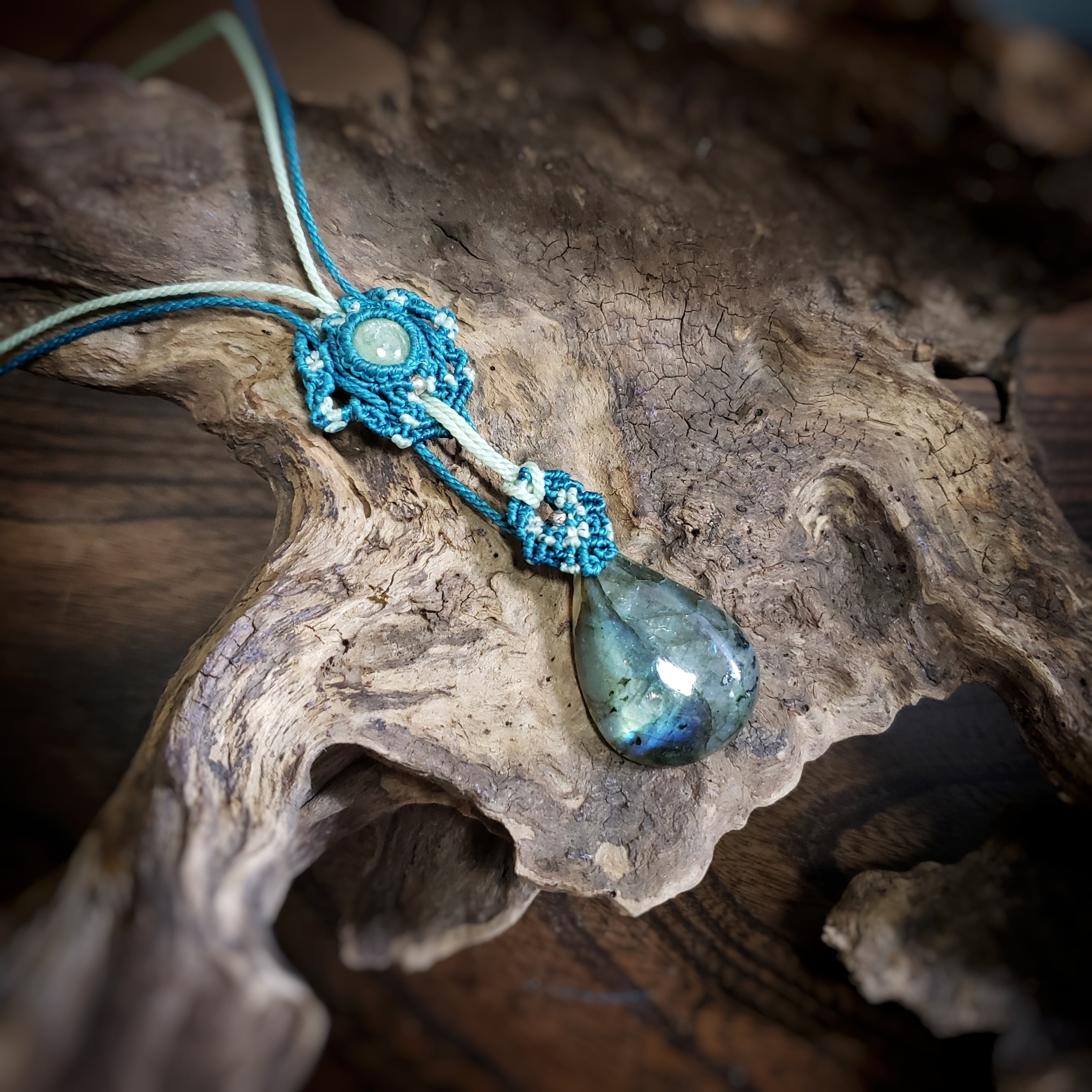 「ラブラドライト」と「グリーンカイヤナイト」のマクラメ編みネックレス