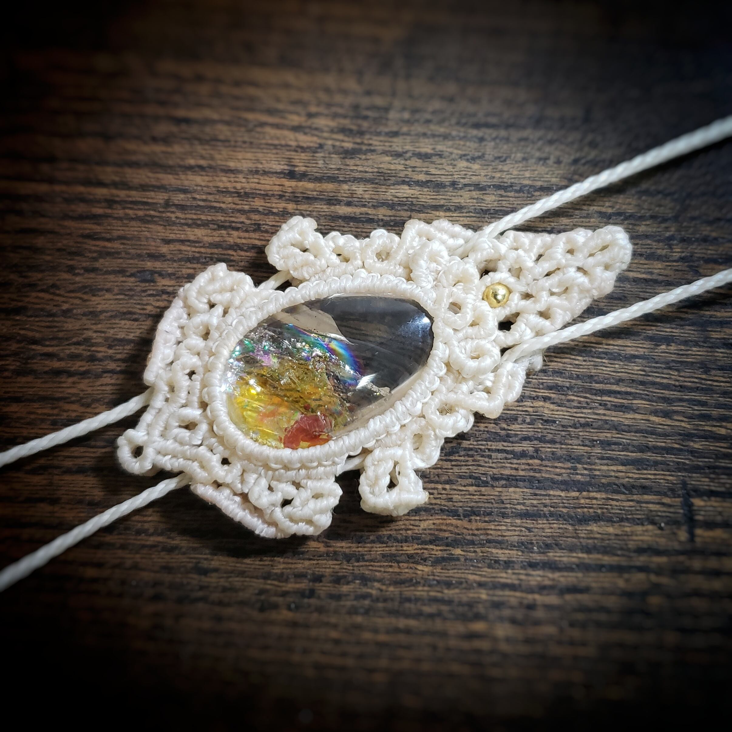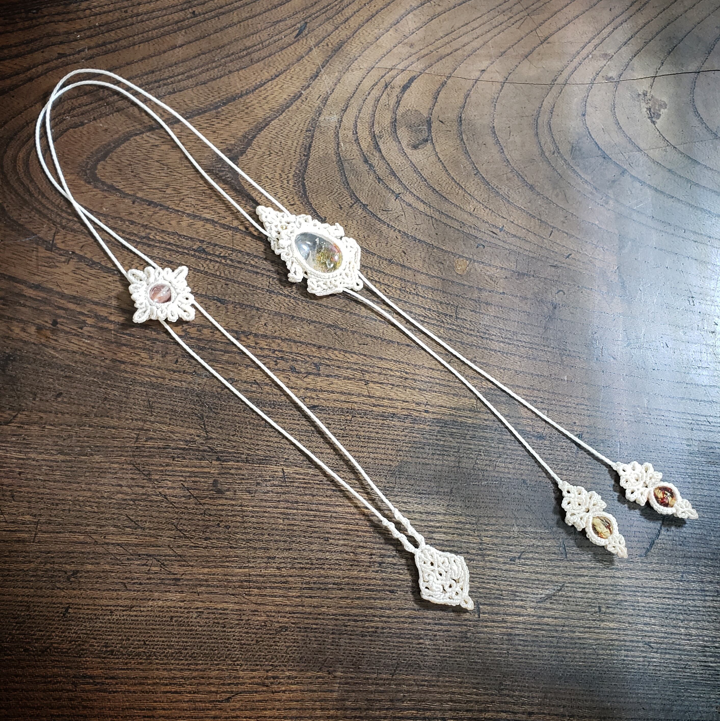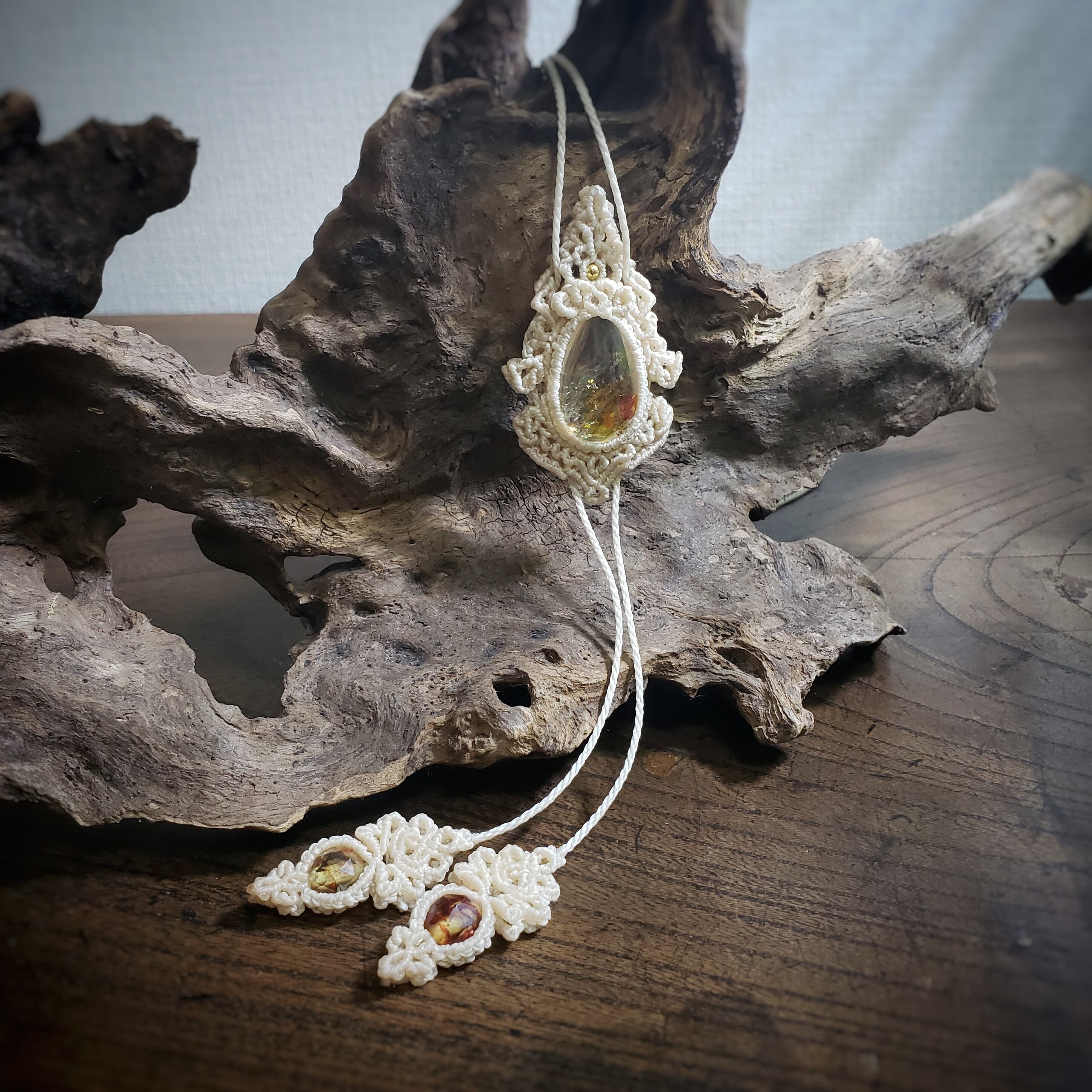 こちらは、「ライモナイトinクォーツ」マクラメ編みのループタイ風ネックレスです。
