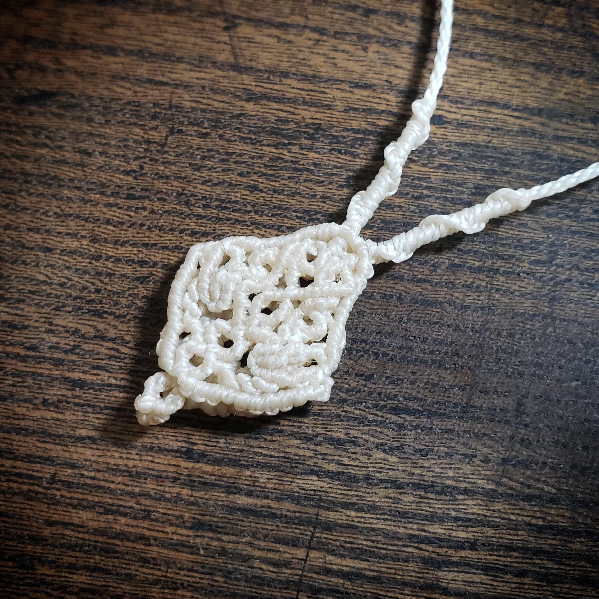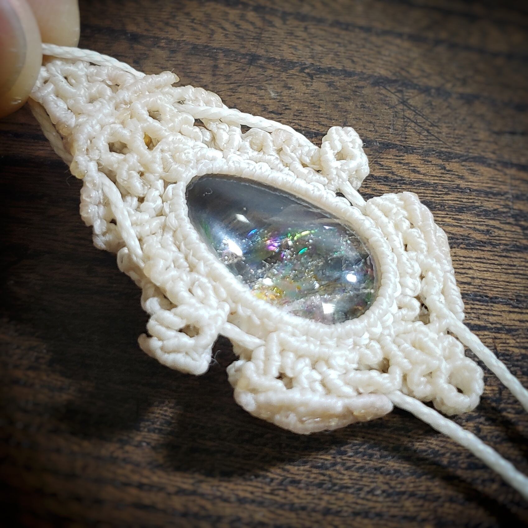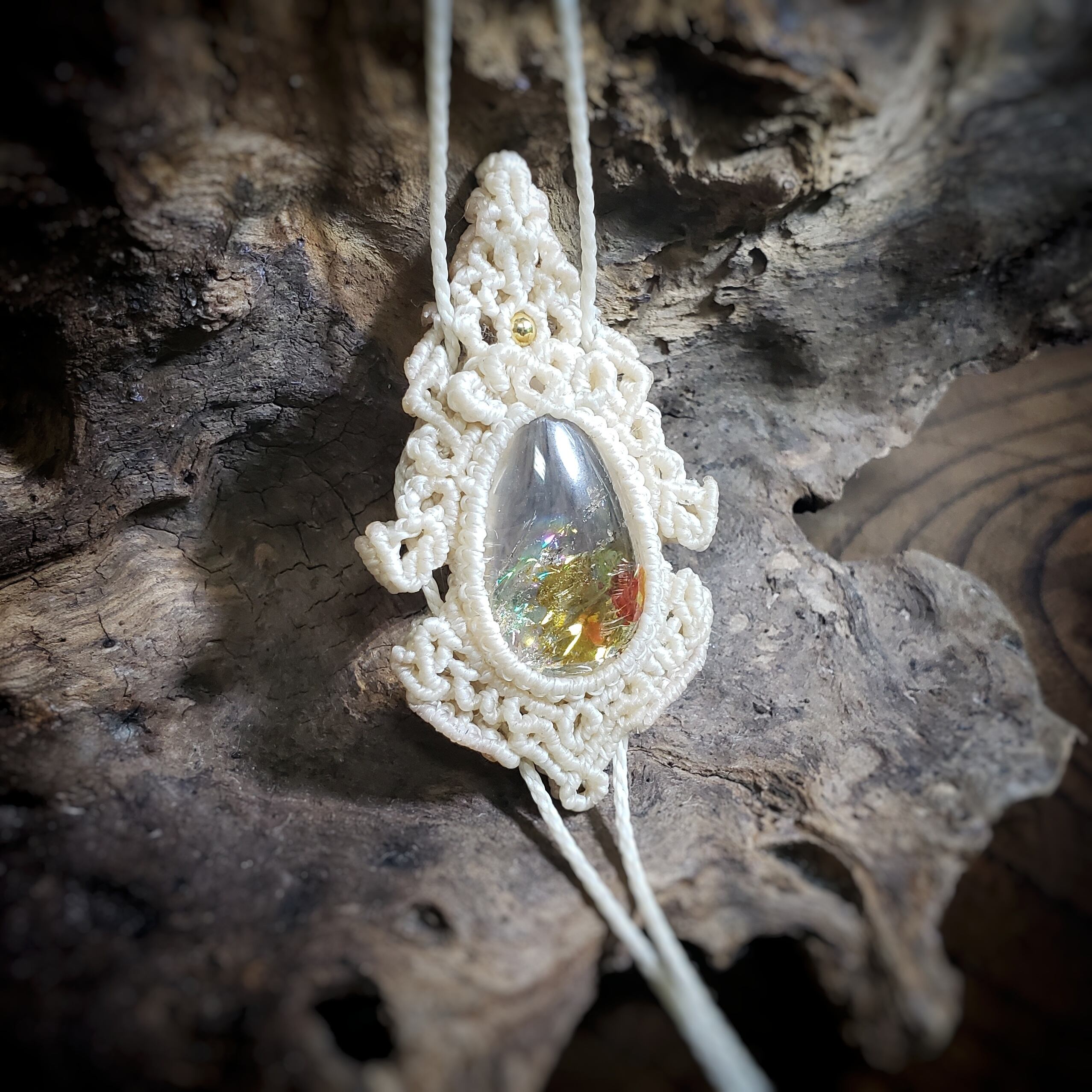 こちらは、「ライモナイトinクォーツ」マクラメ編みのループタイ風ネックレスです。
