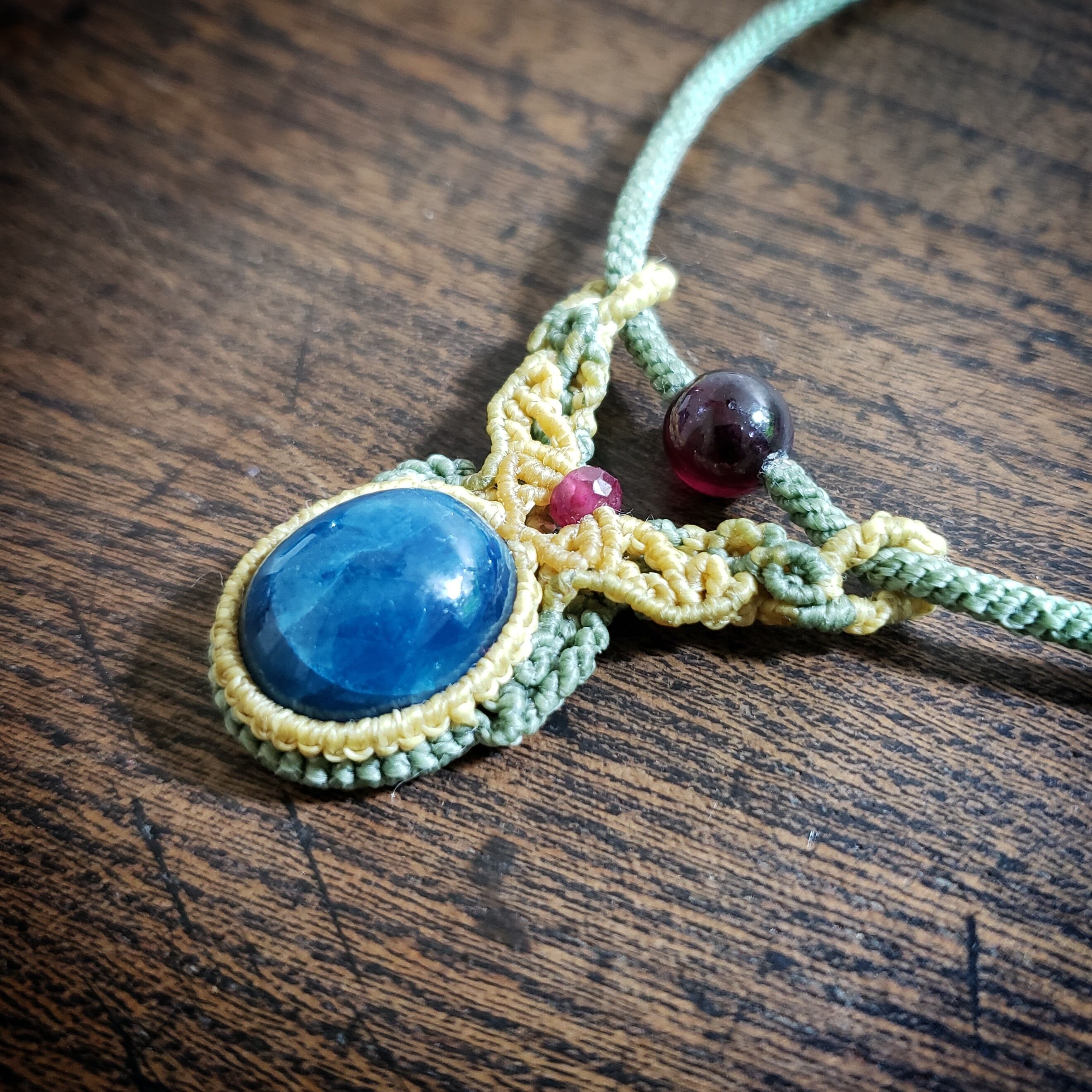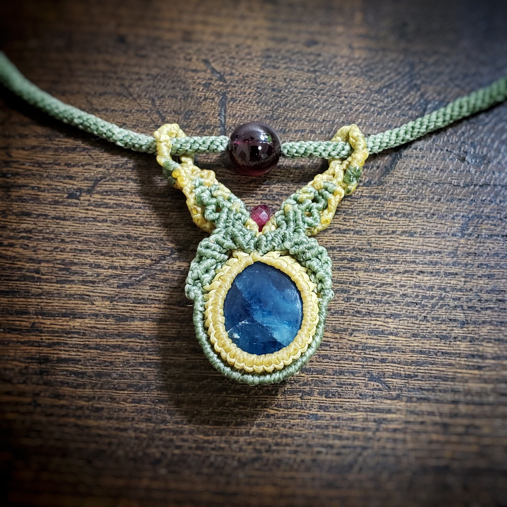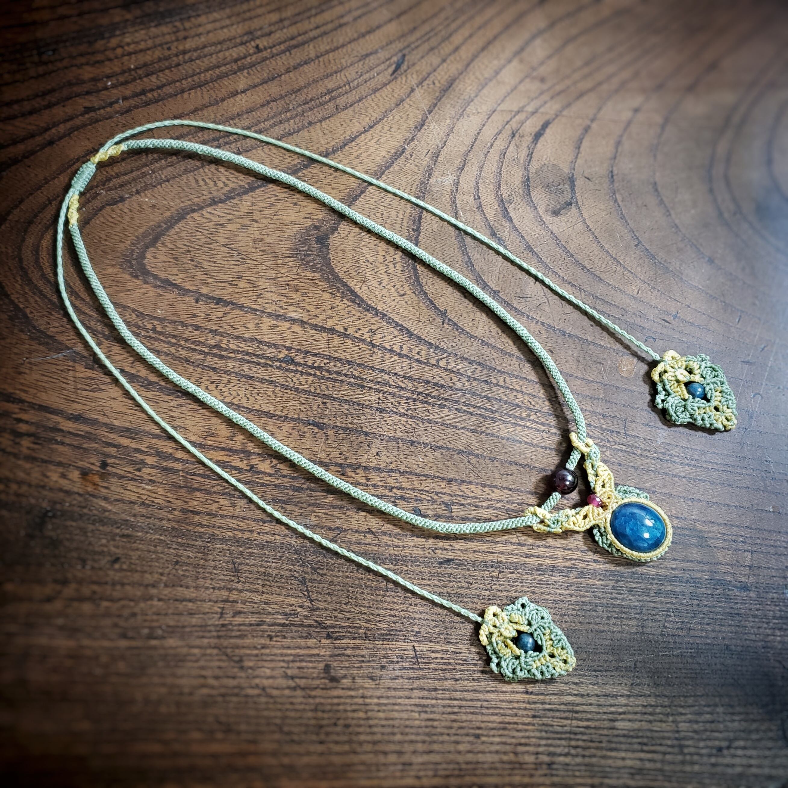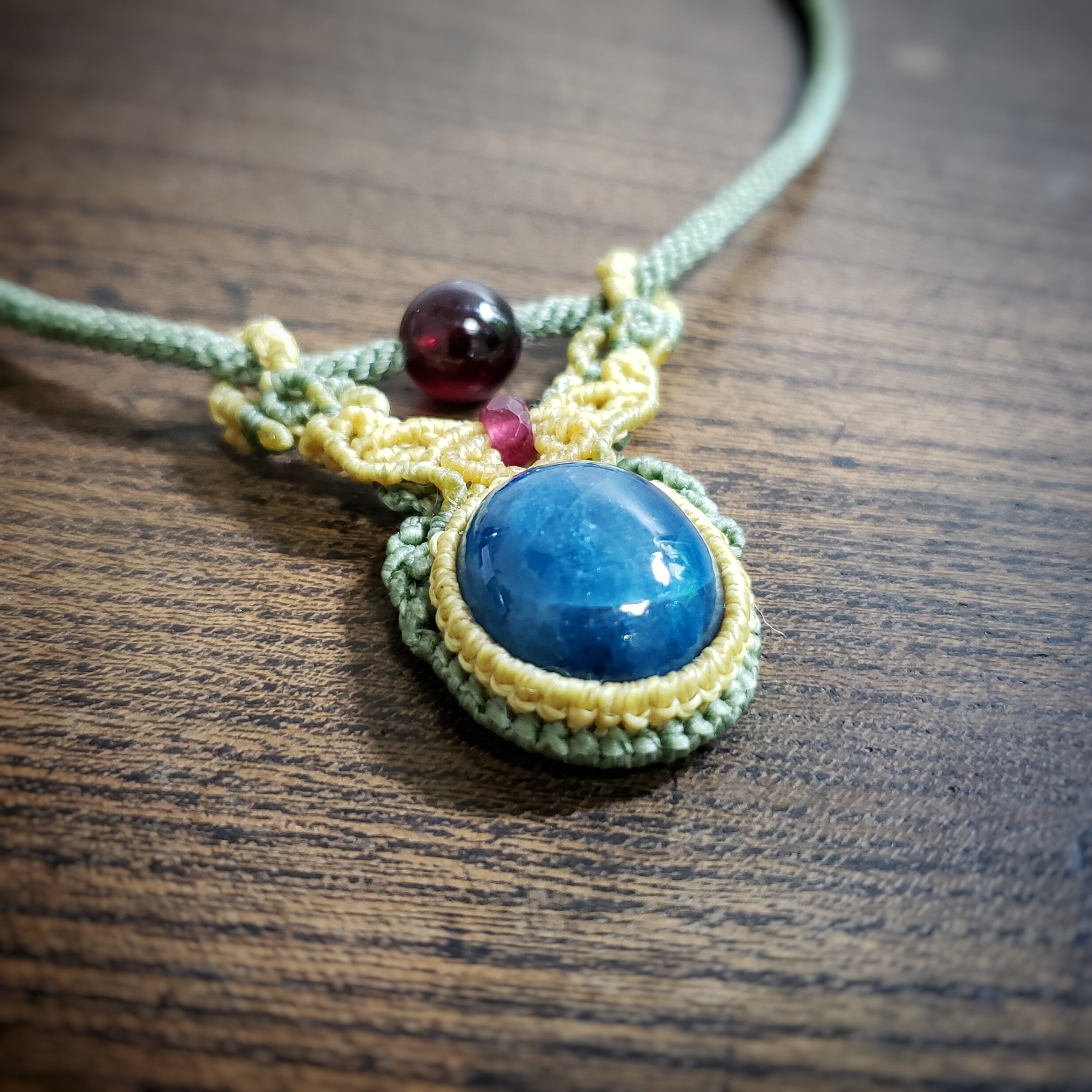 こちらは「ブルーアパタイト」と「ロードライトガーネット」のマクラメ編みネックレスをご紹介致します。