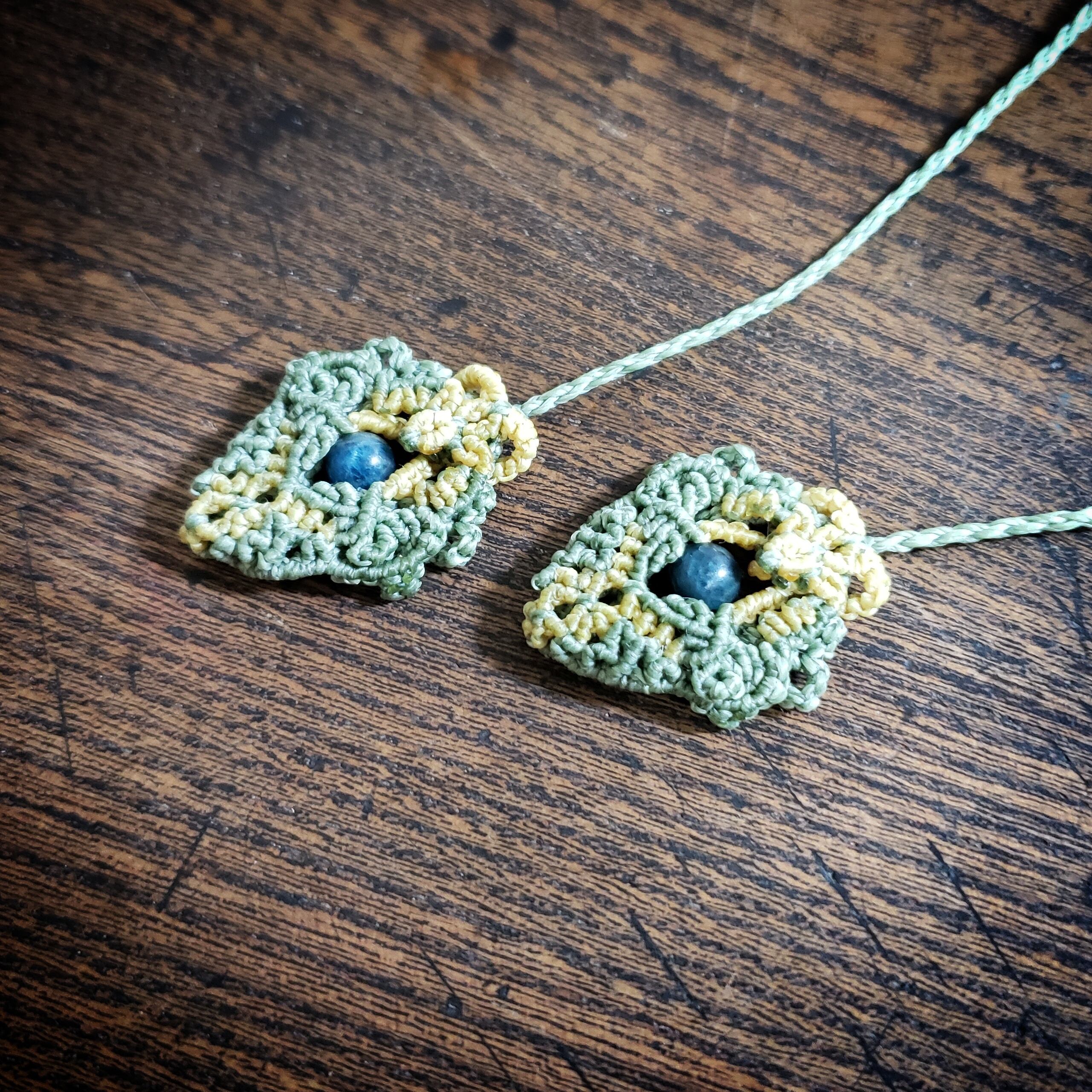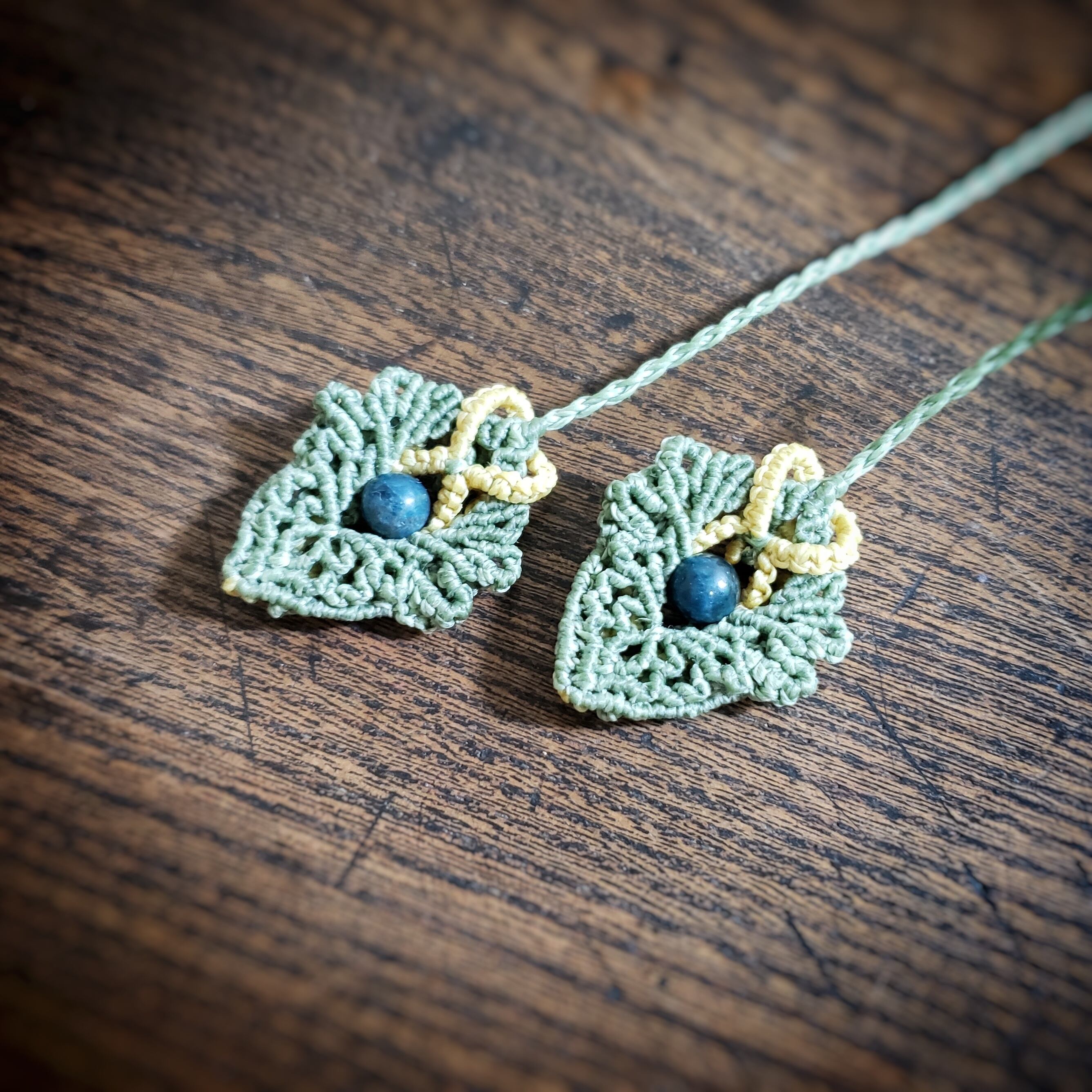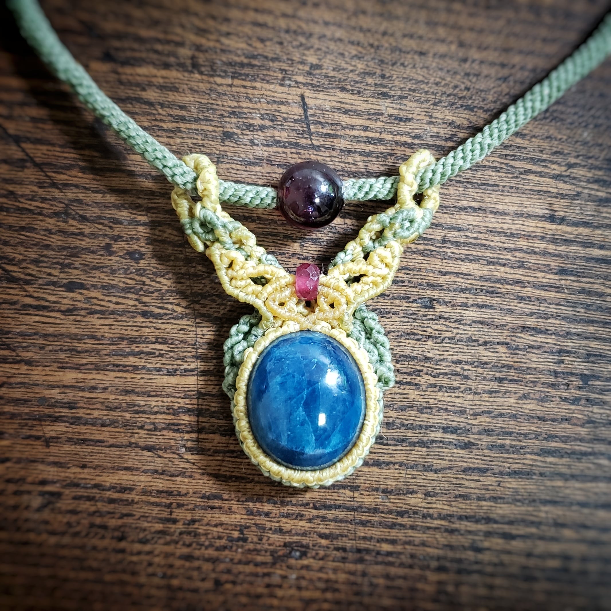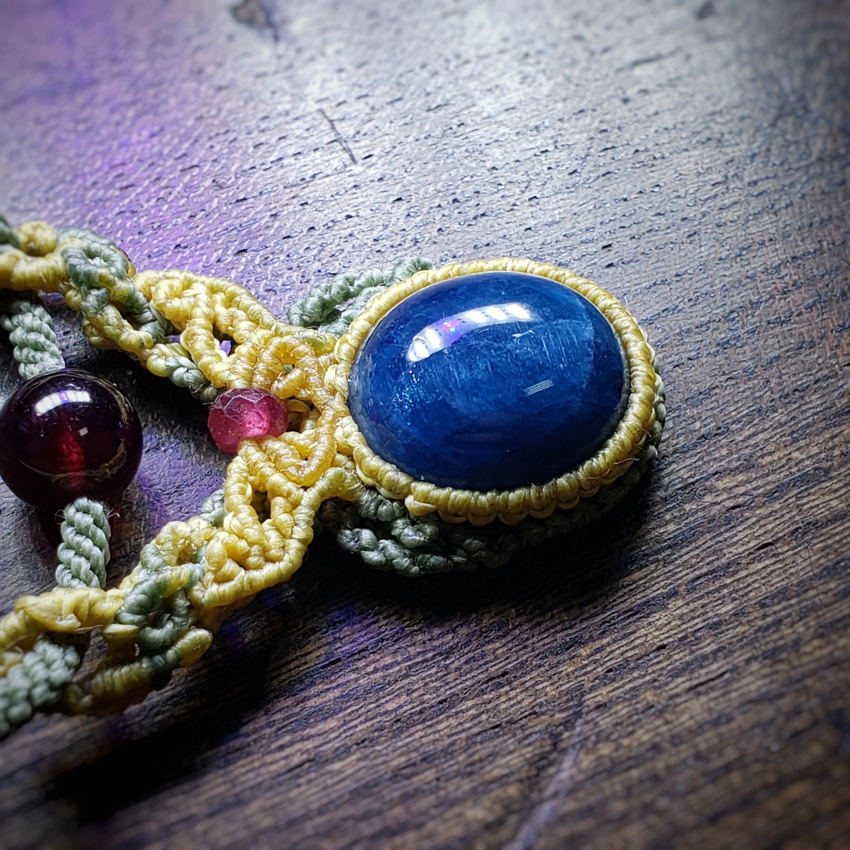 こちらは「ブルーアパタイト」と「ロードライトガーネット」のマクラメ編みネックレスをご紹介致します。