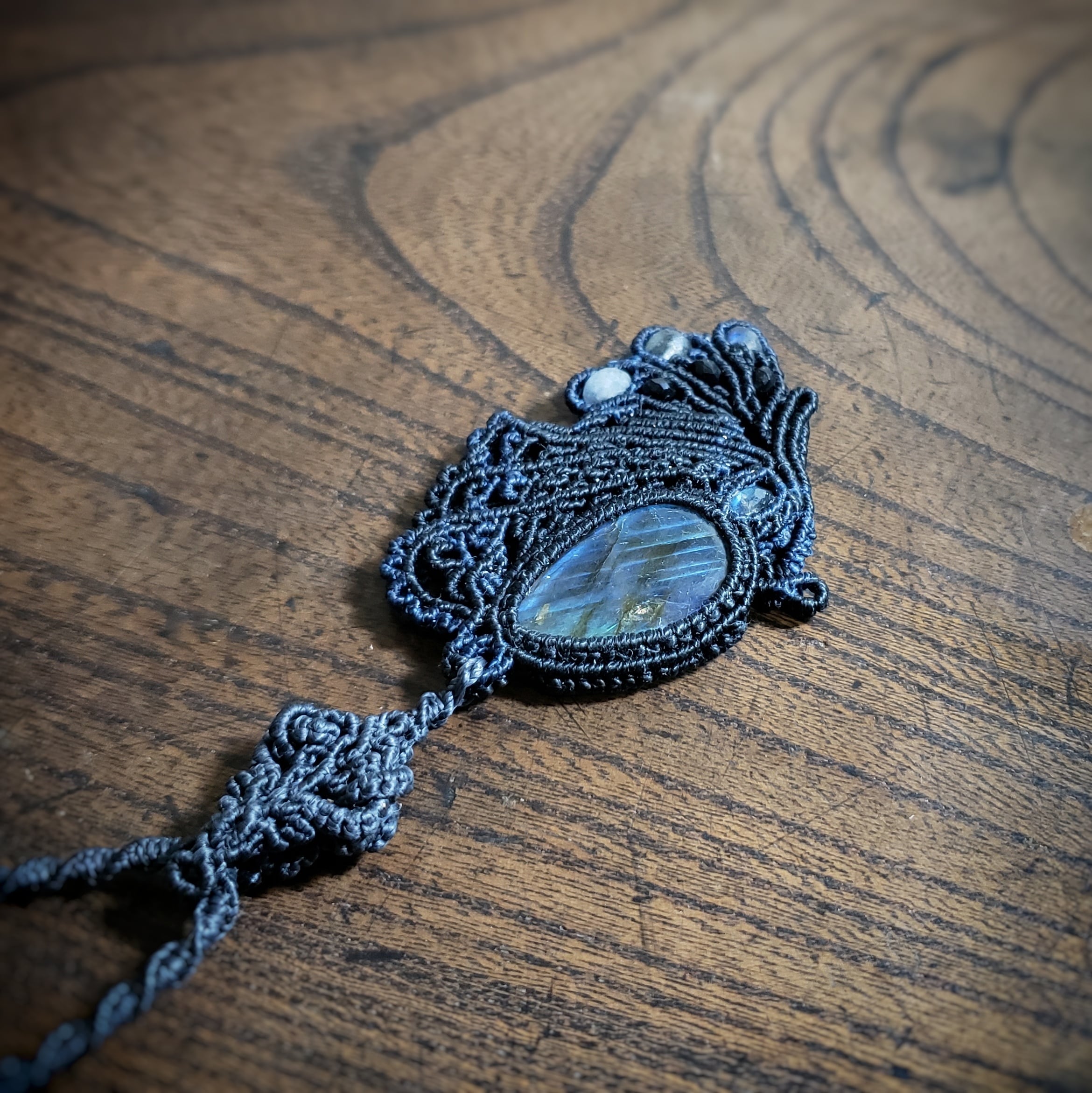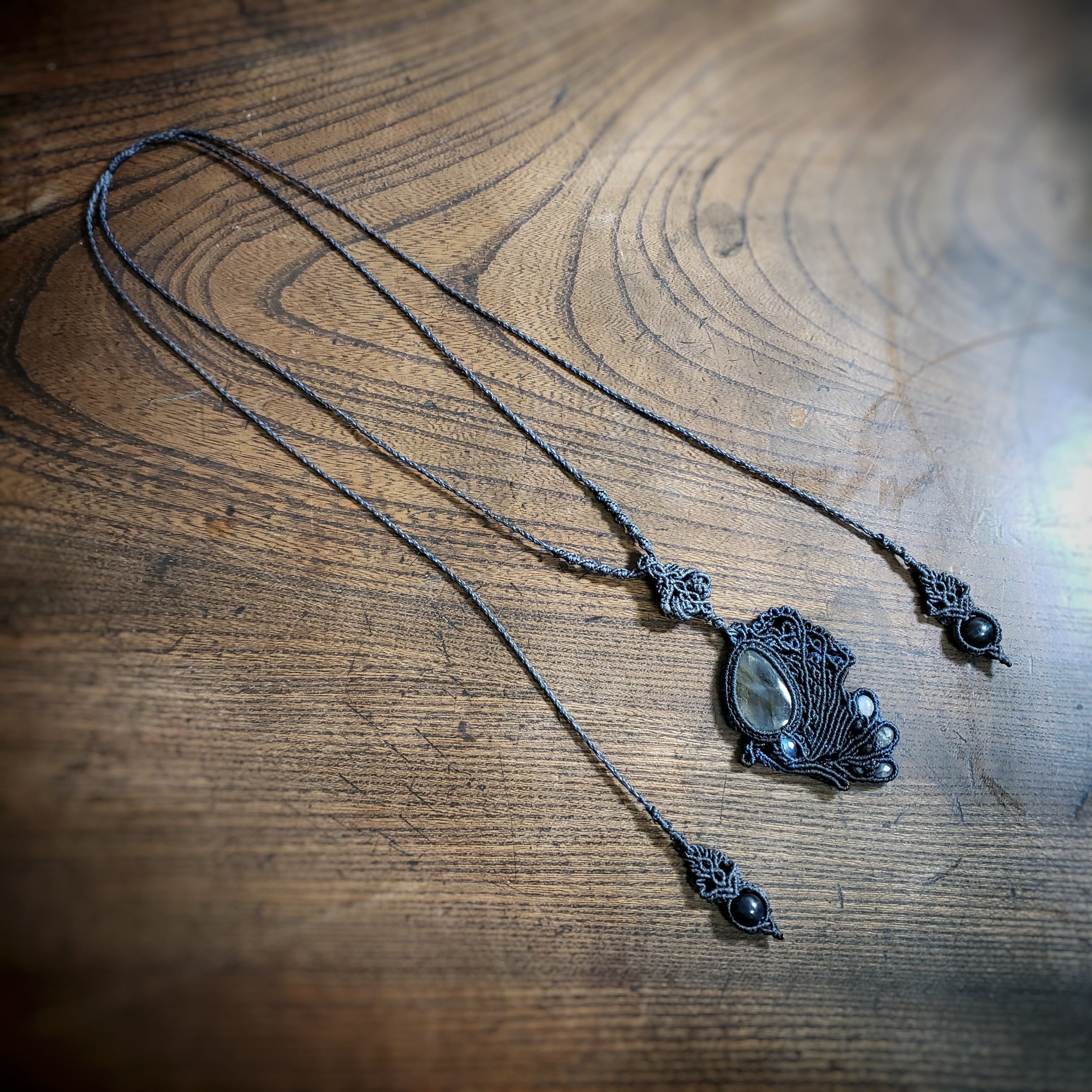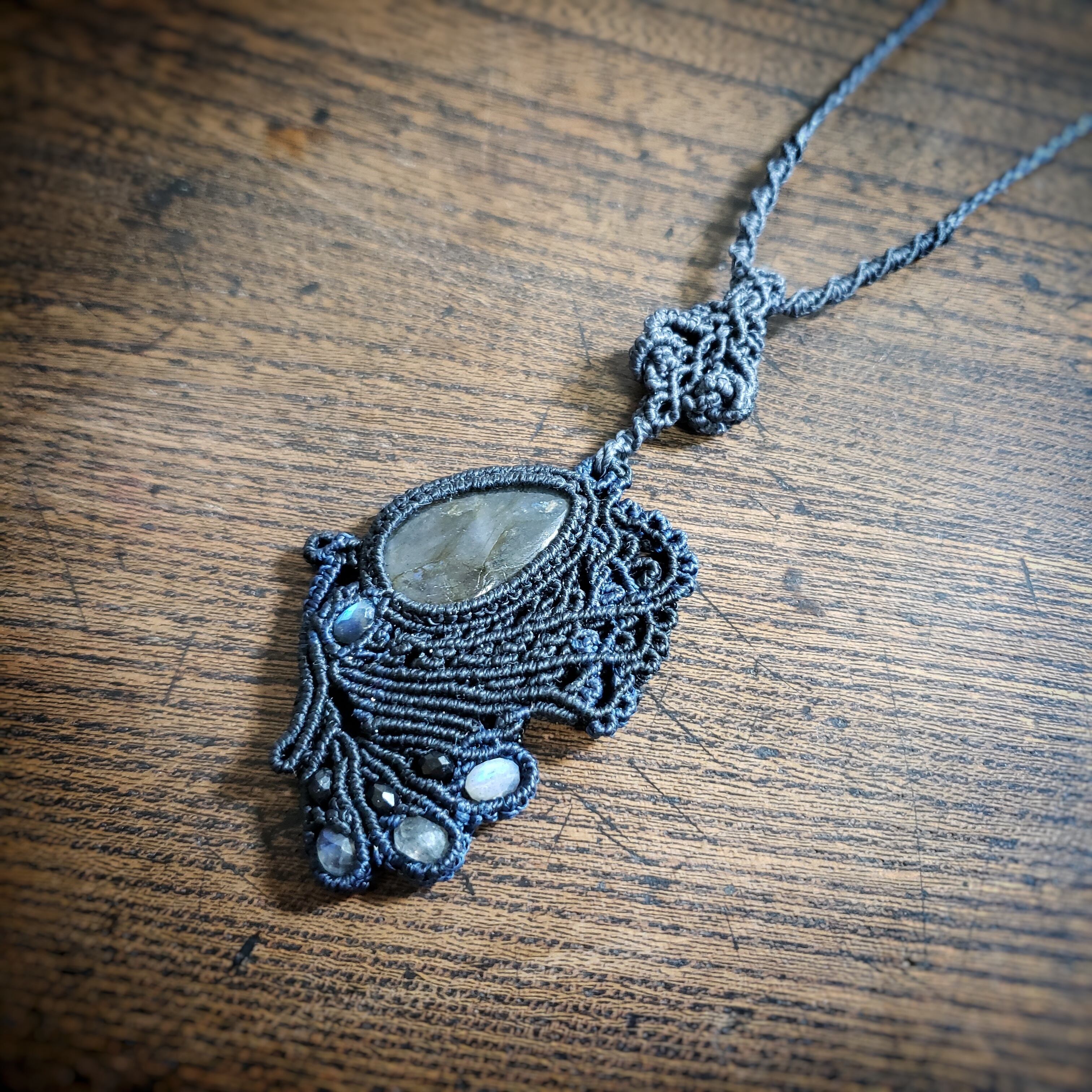 こちらは、ラブラドライトのマクラメ編みネックレスです。