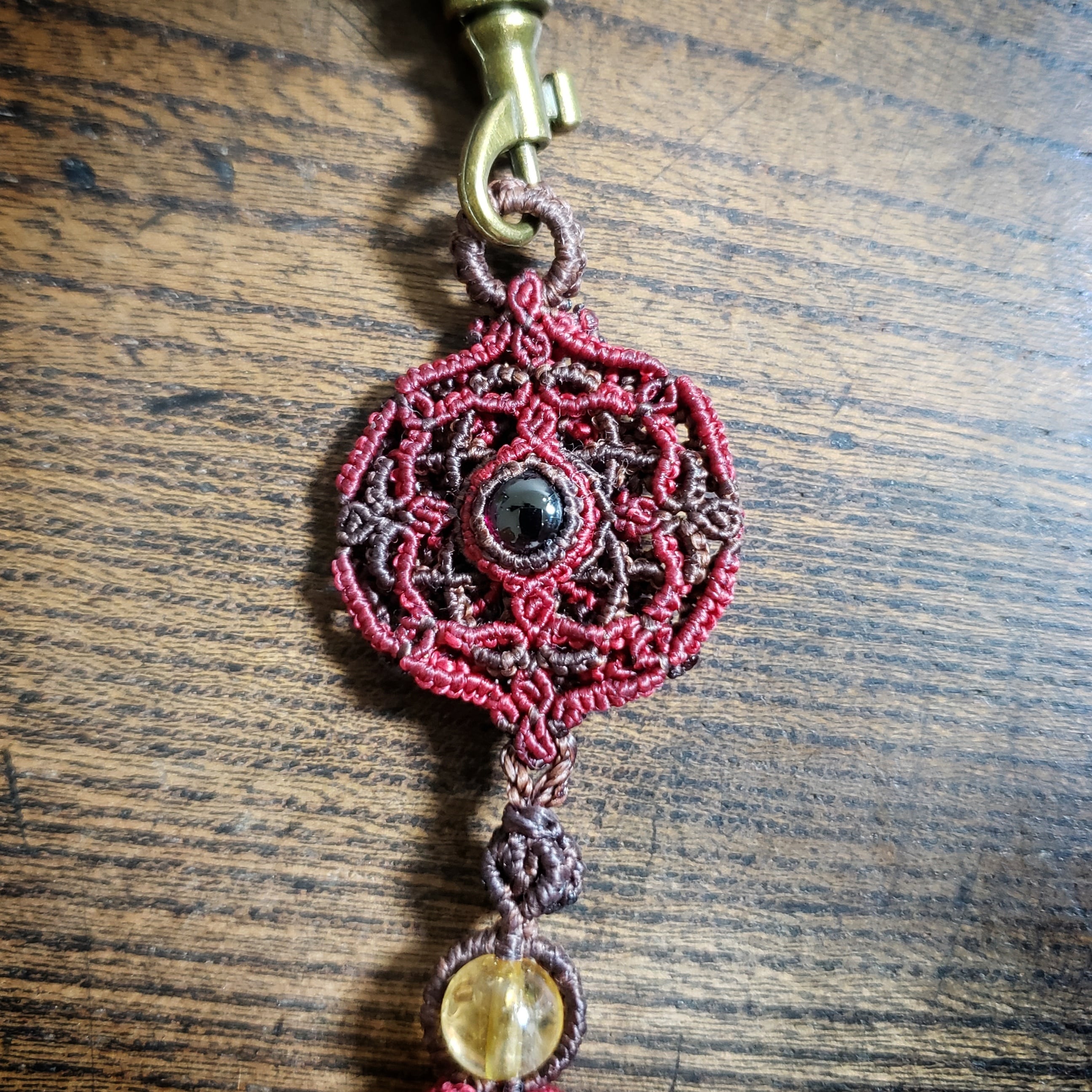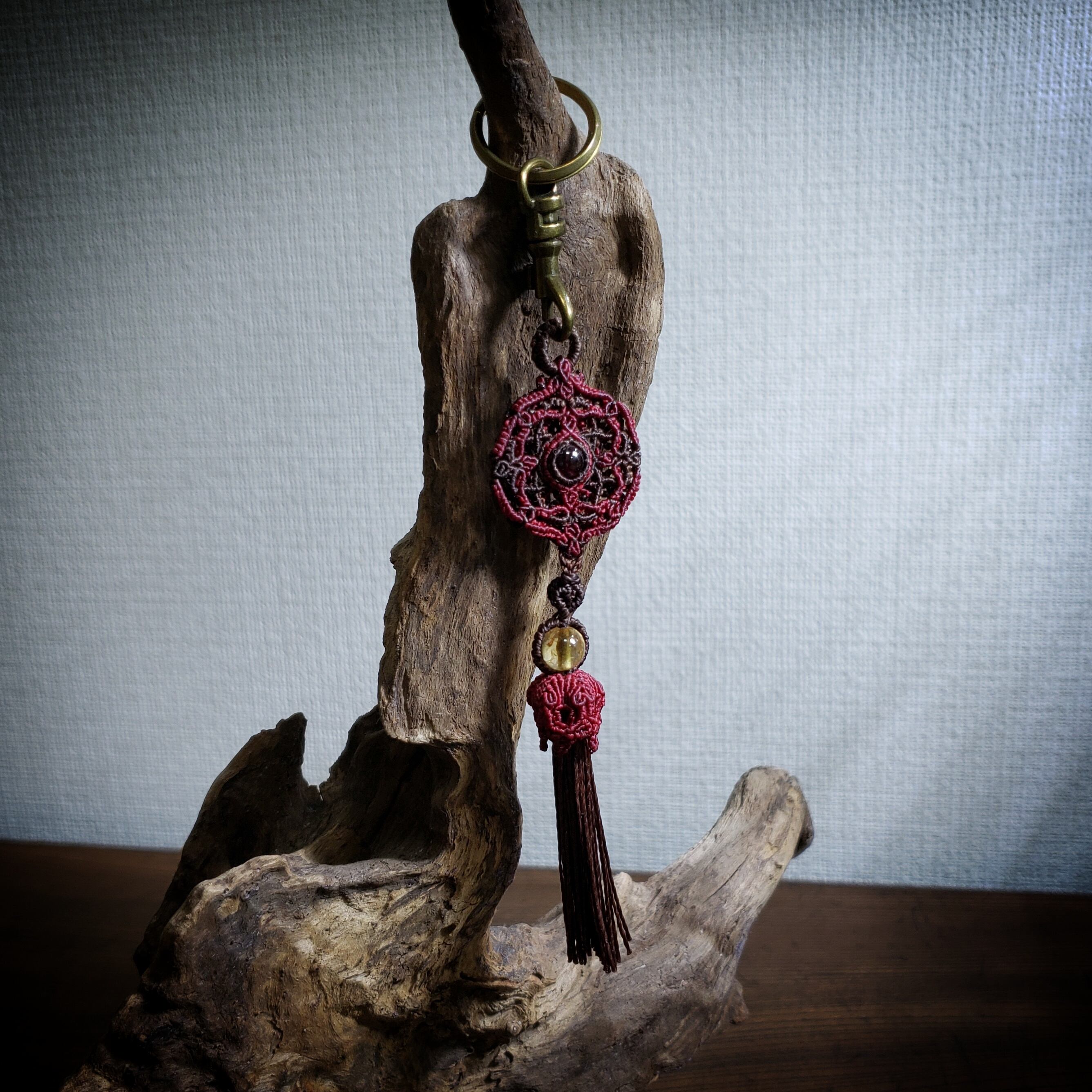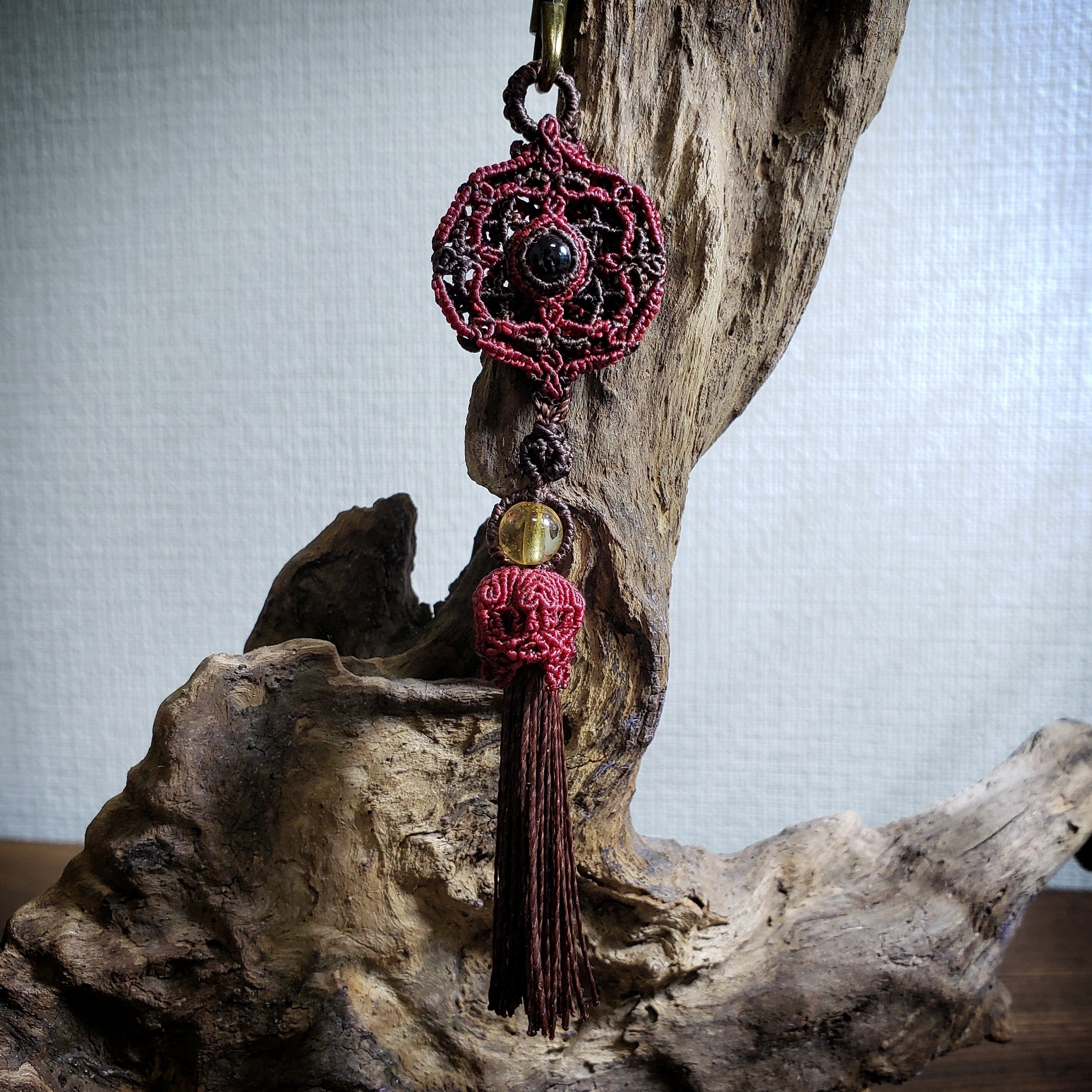 「ロードライトガーネット」のマクラメ編み曼荼羅 バックチャーム キーリング