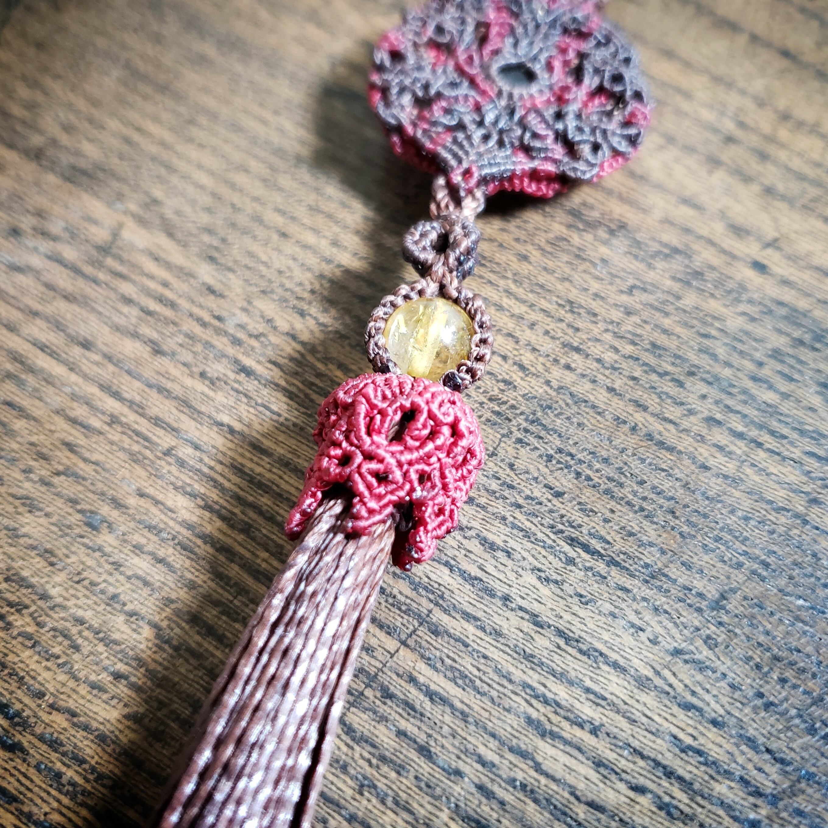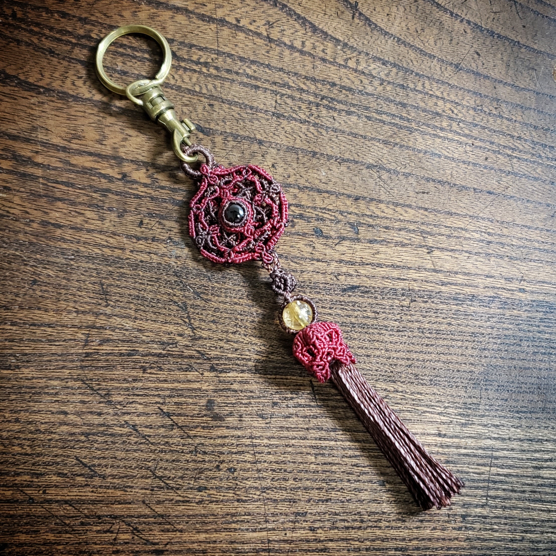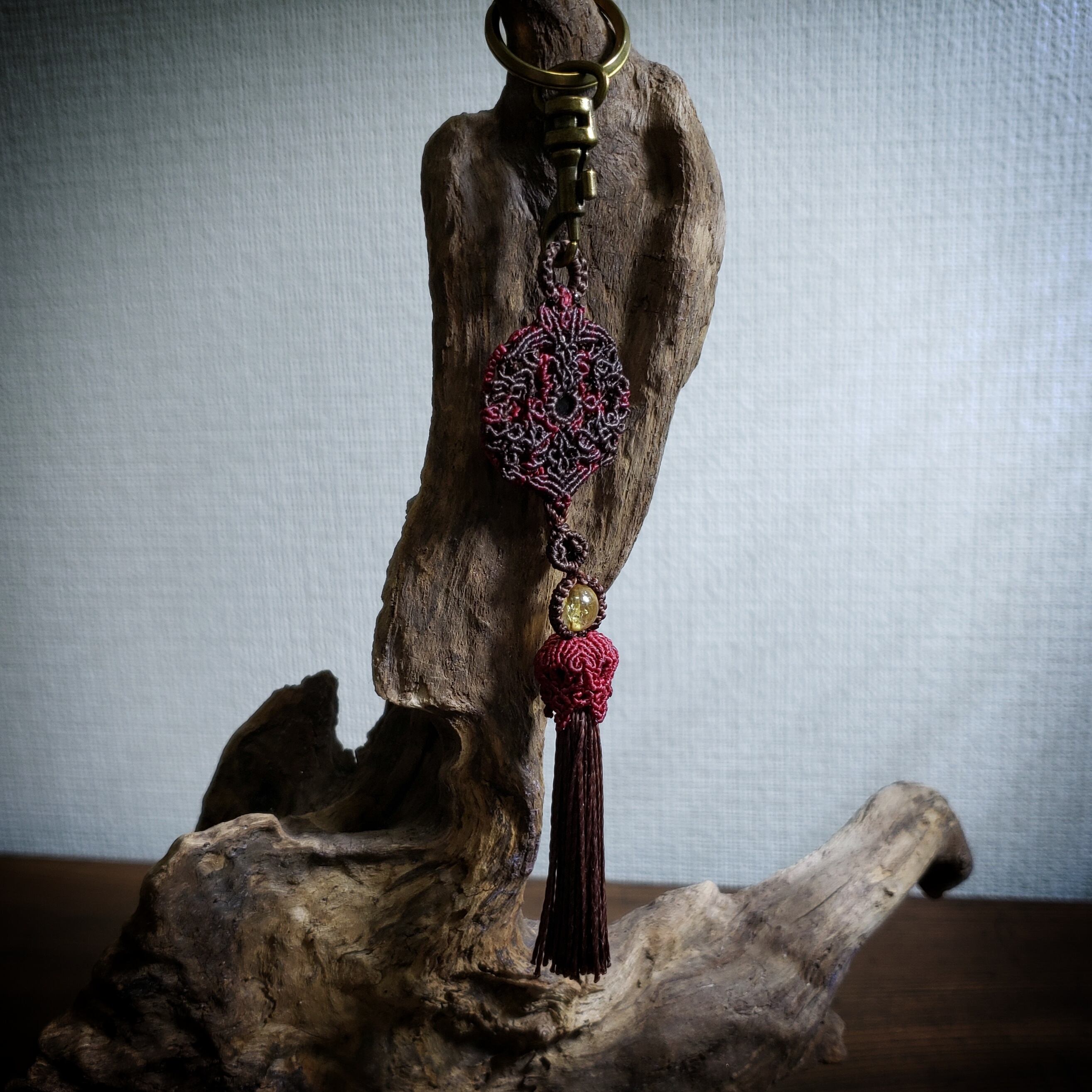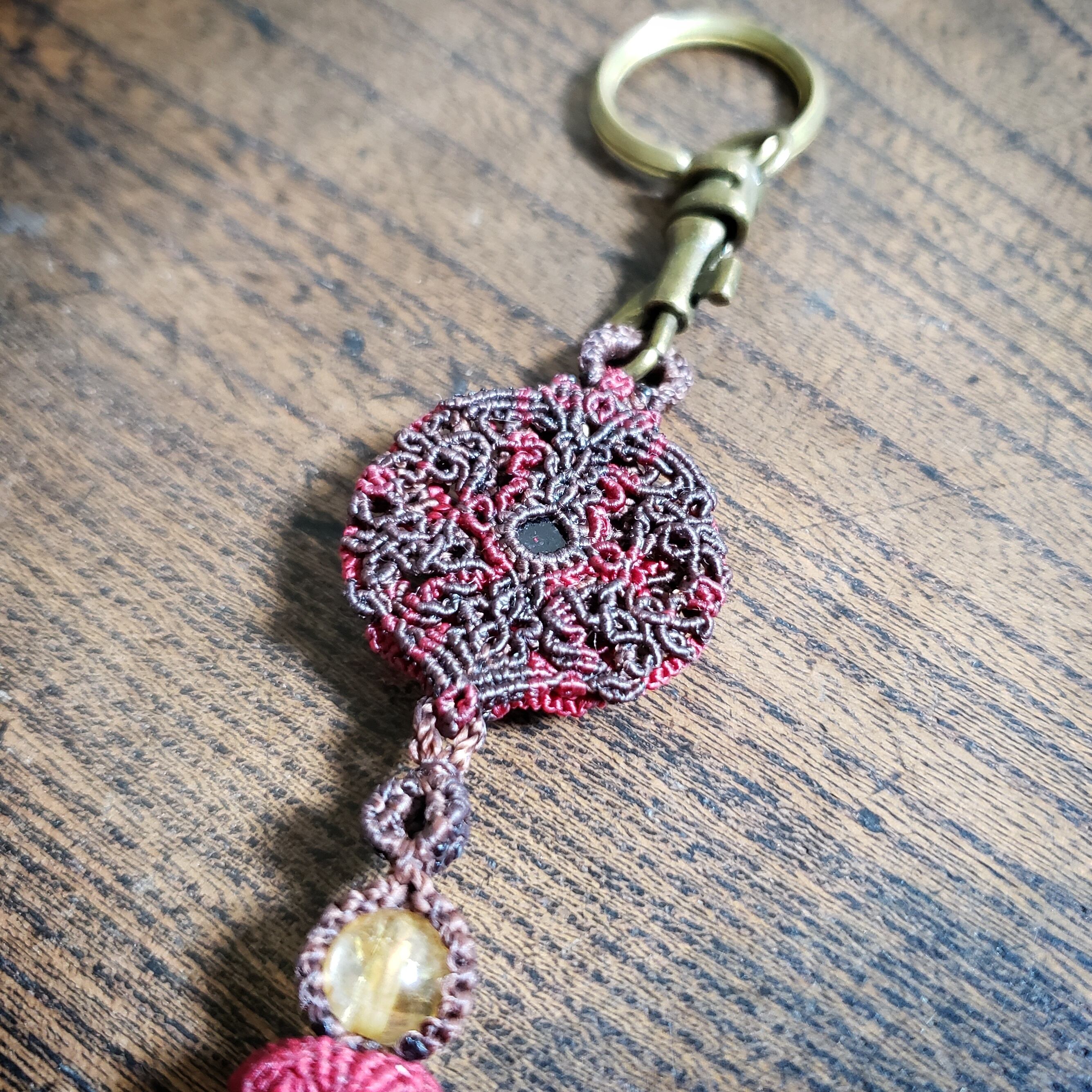 「ロードライトガーネット」のマクラメ編み曼荼羅 バックチャーム キーリング