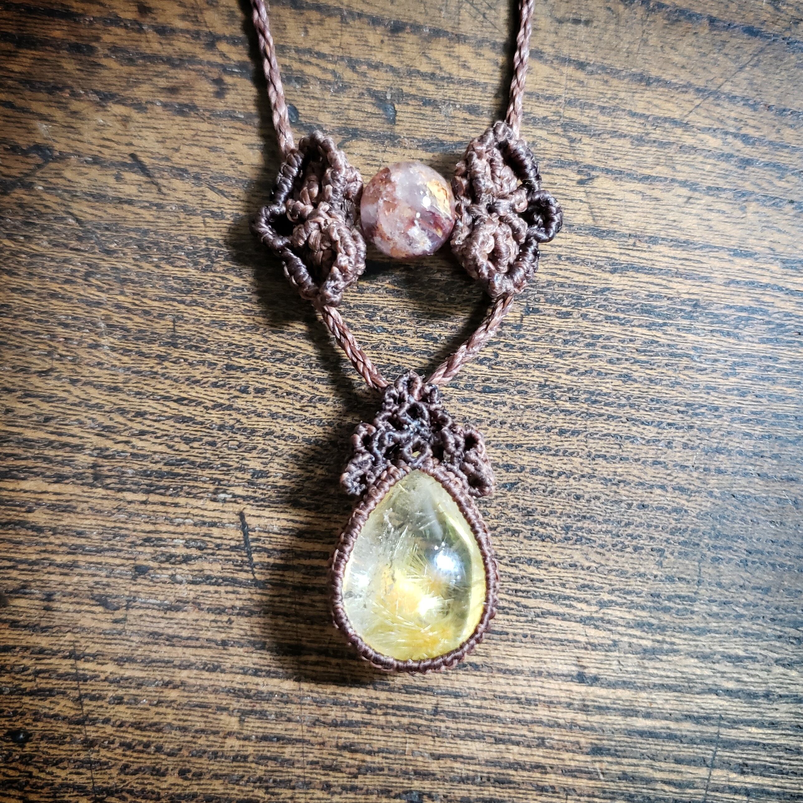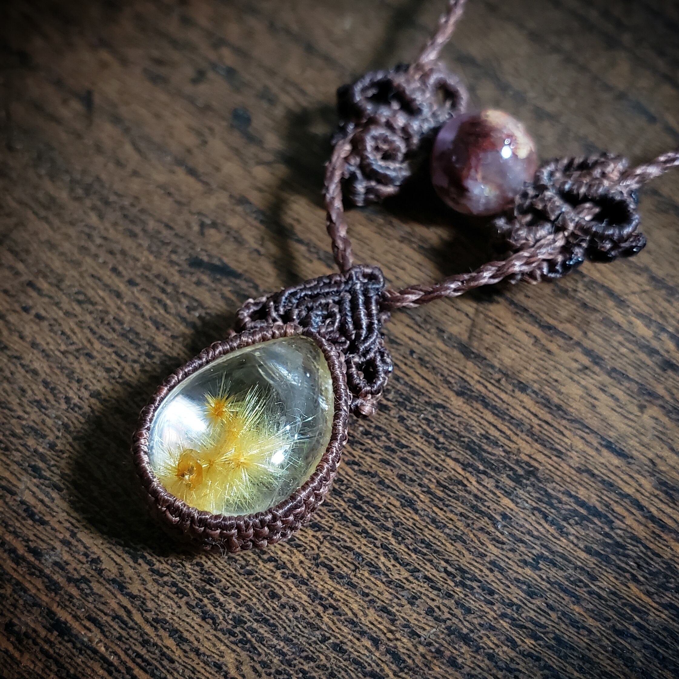 トップの「フラワールチルクォーツ」ルースのみ約0.25㎜のワックスコードで編んでます。