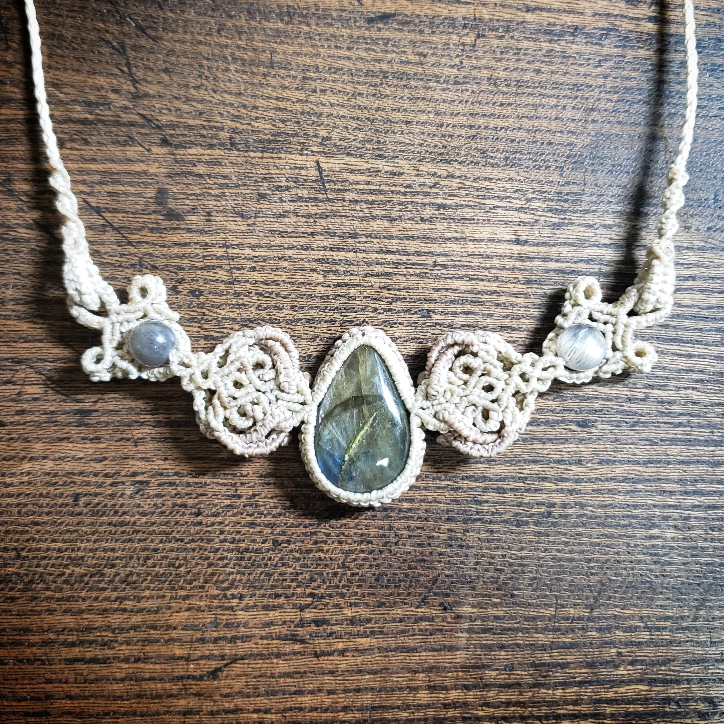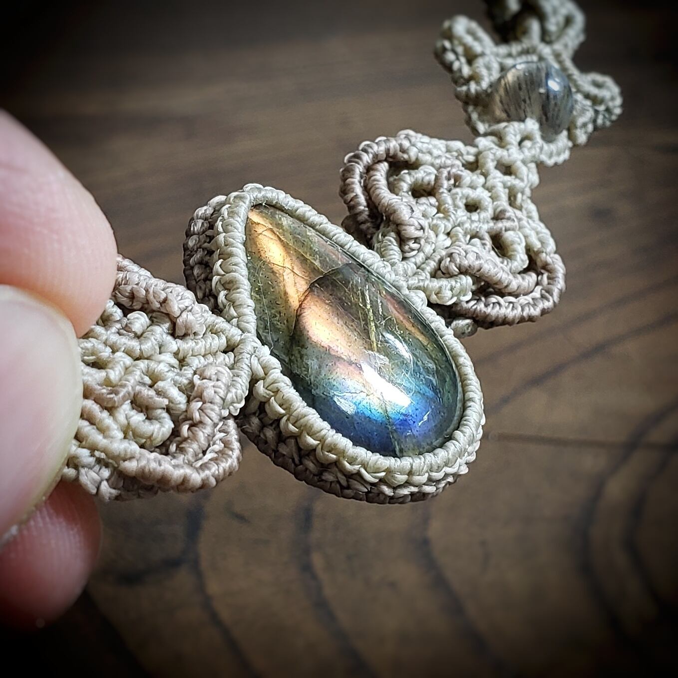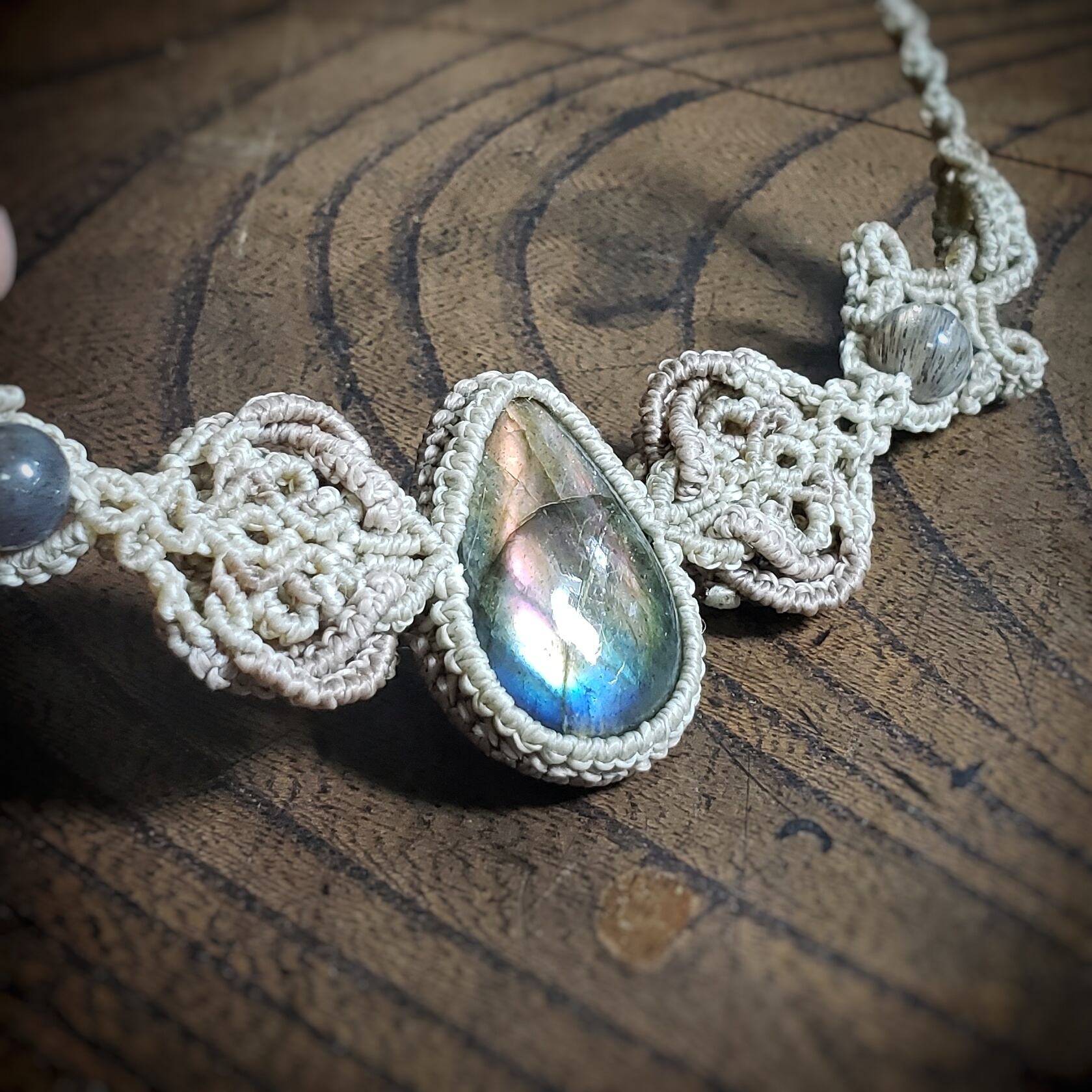 こちらは、ラブラドライトのマクラメ編みネックレスです。