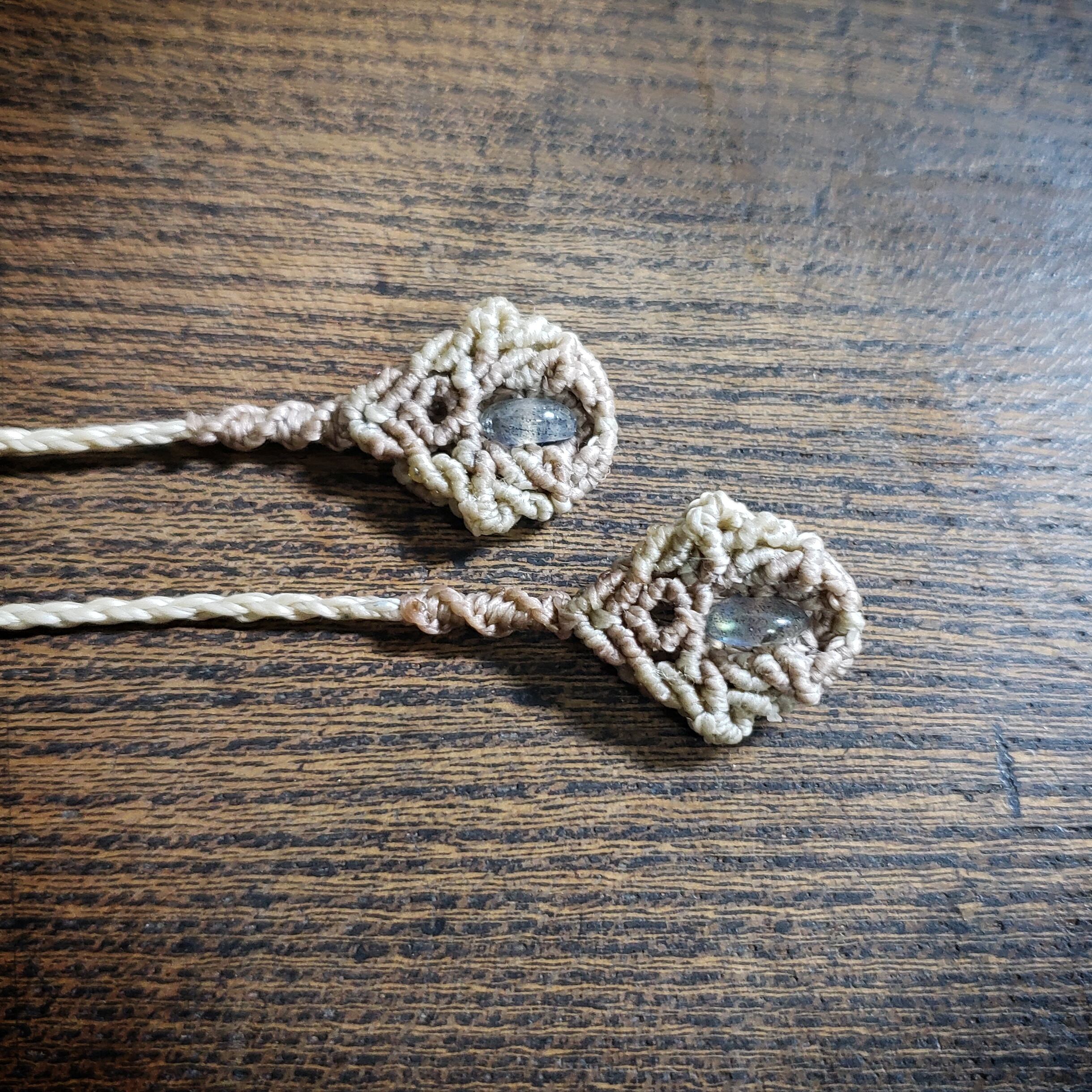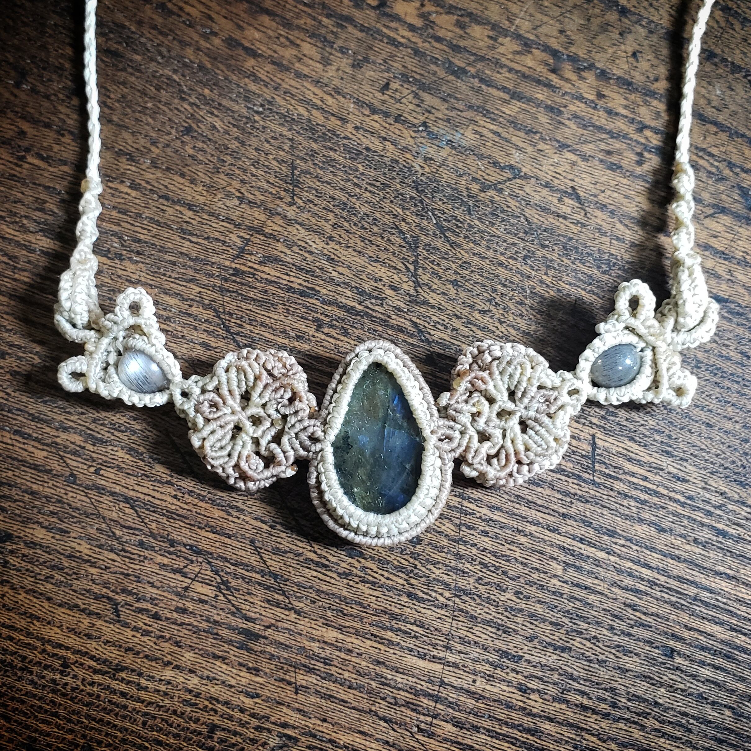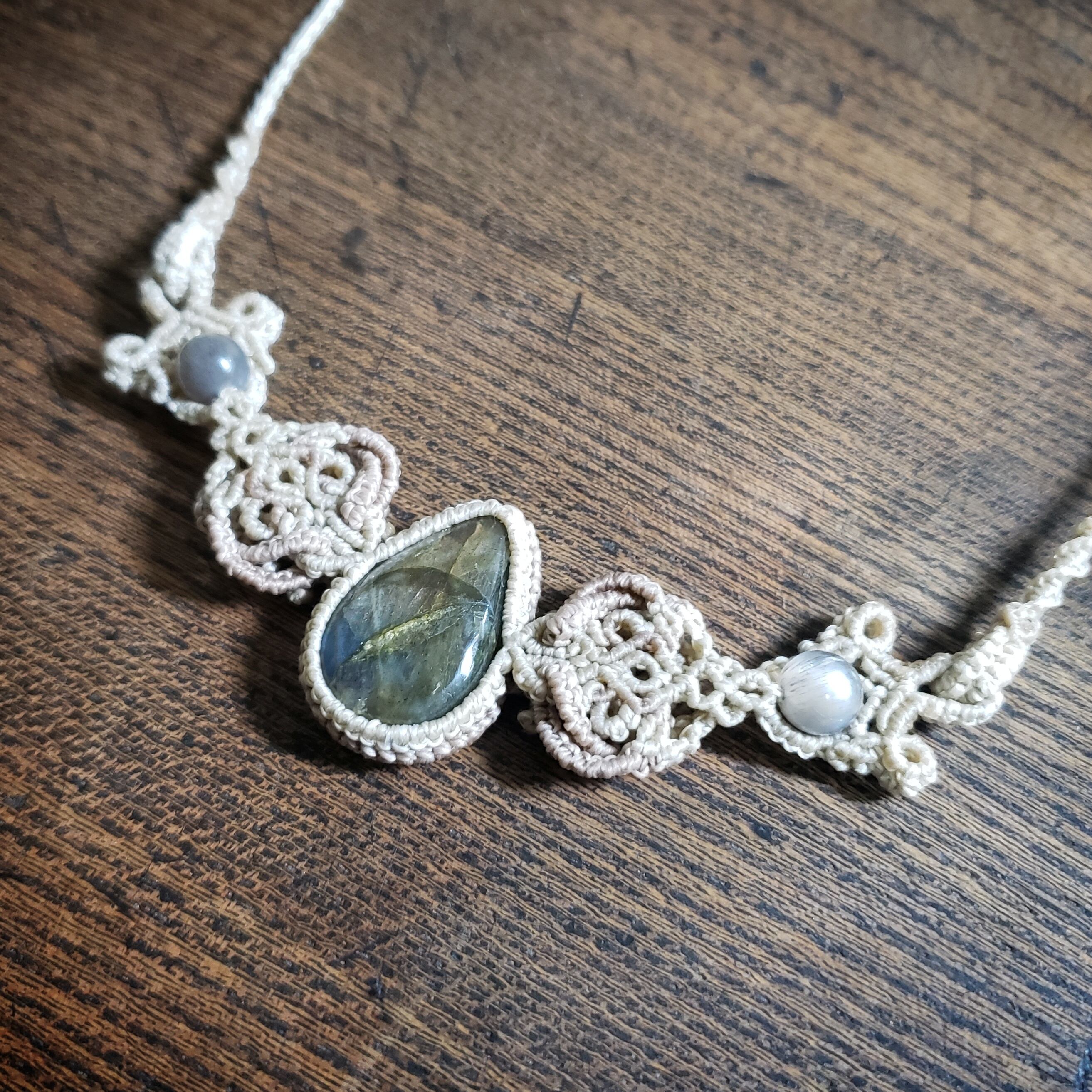 こちらは、ラブラドライトのマクラメ編みネックレスです。