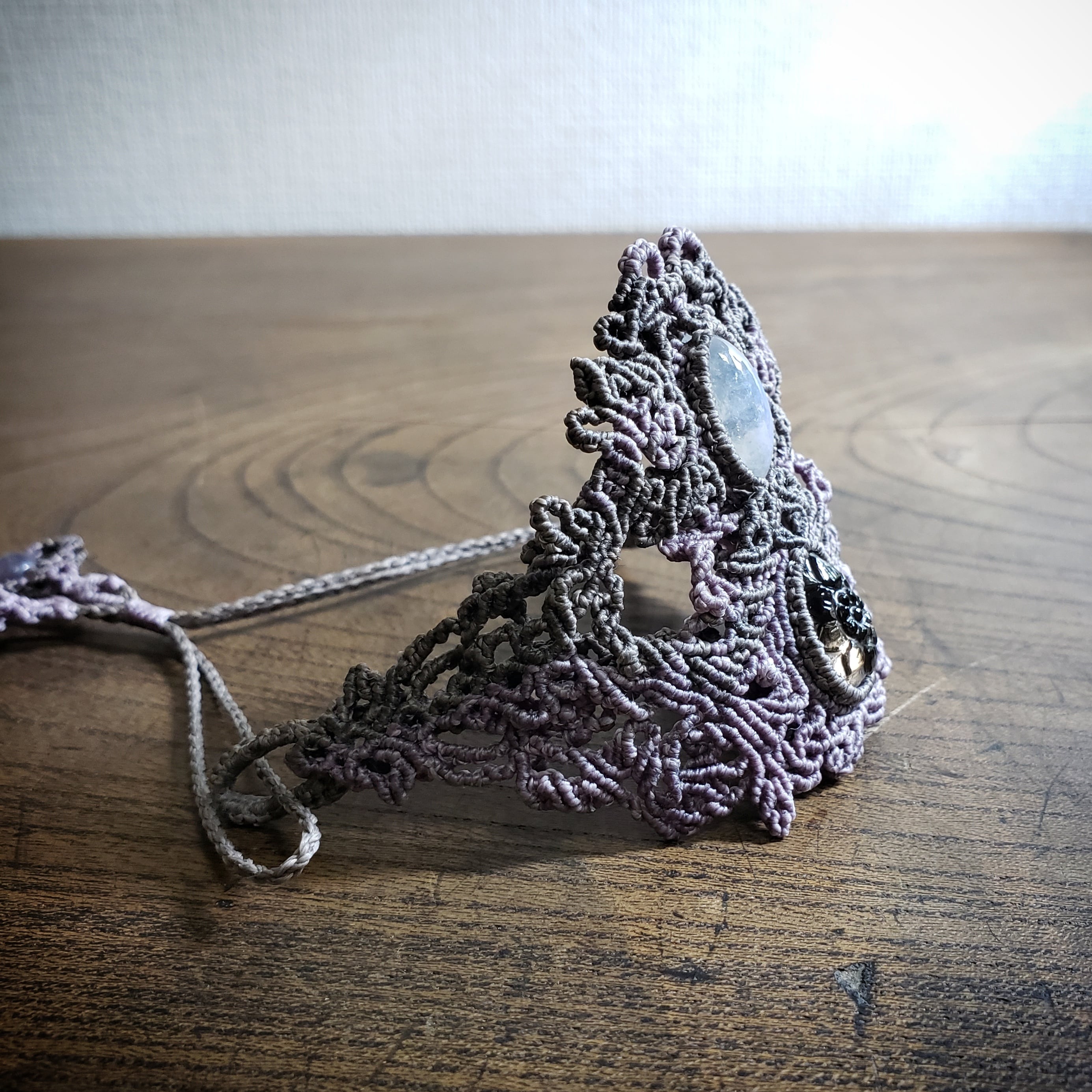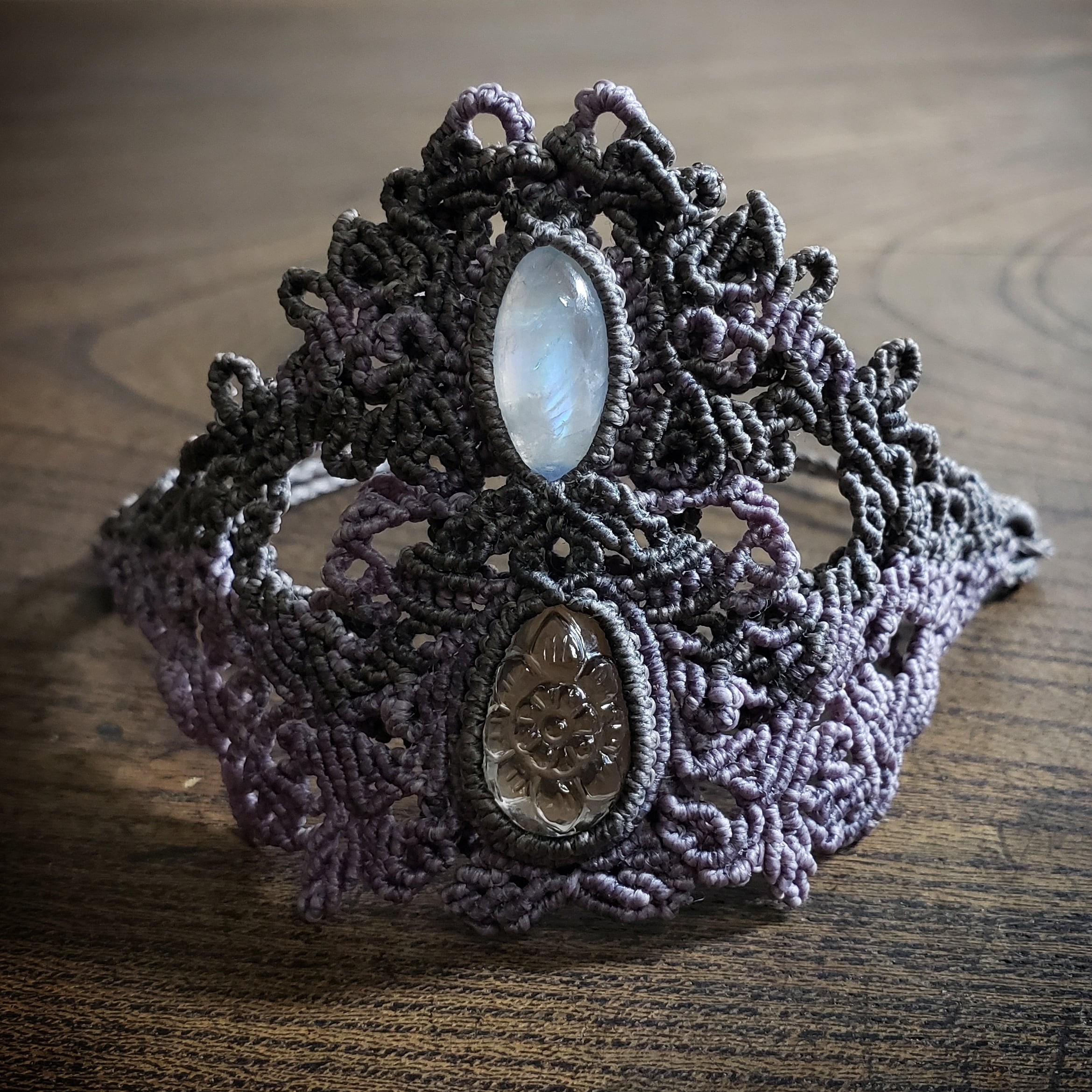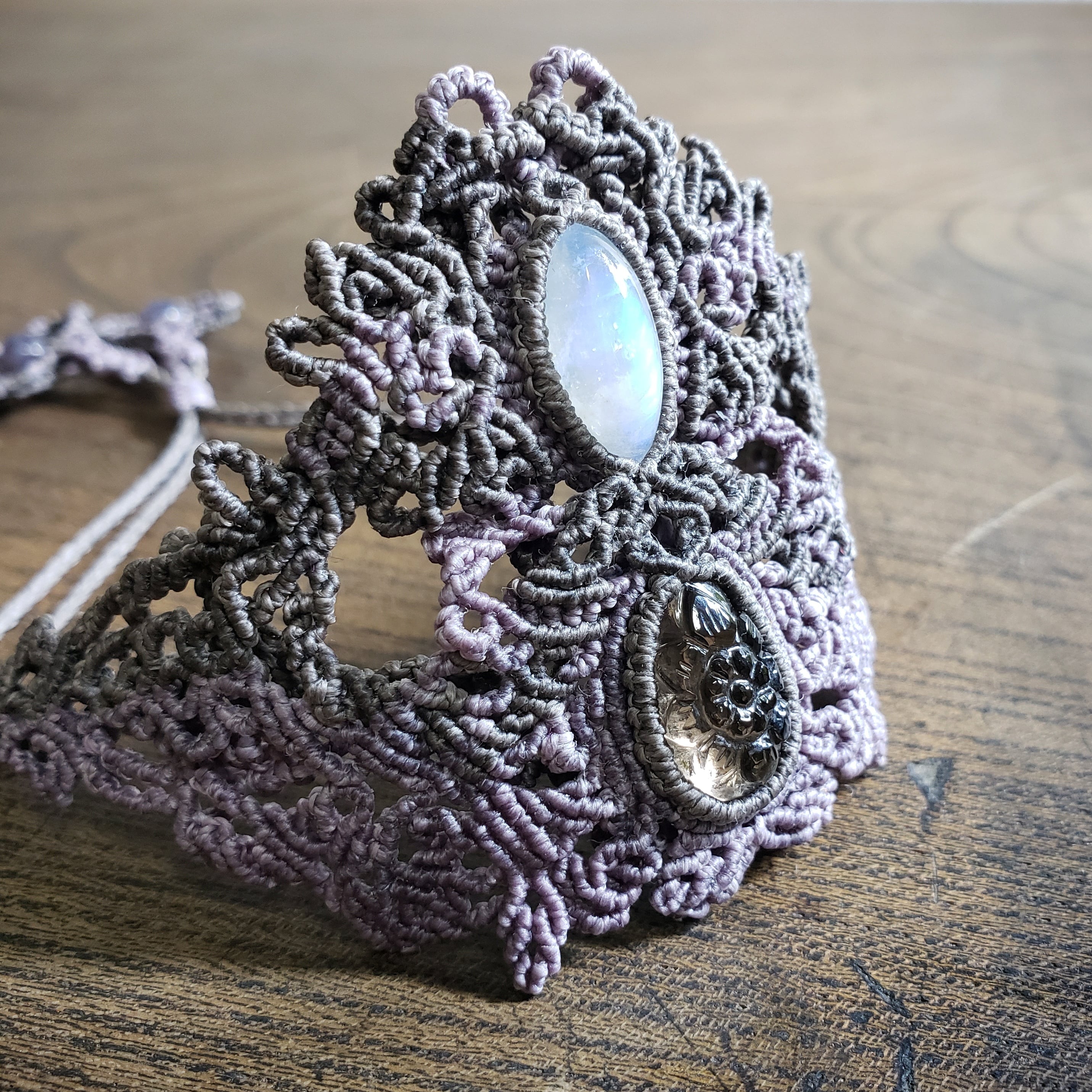 お花柄のカーヴィングが施された「スモーキークォーツ」と「レインボームーンストーン」の豪華で極太なマクラメ編みのブレスレットを作りました。