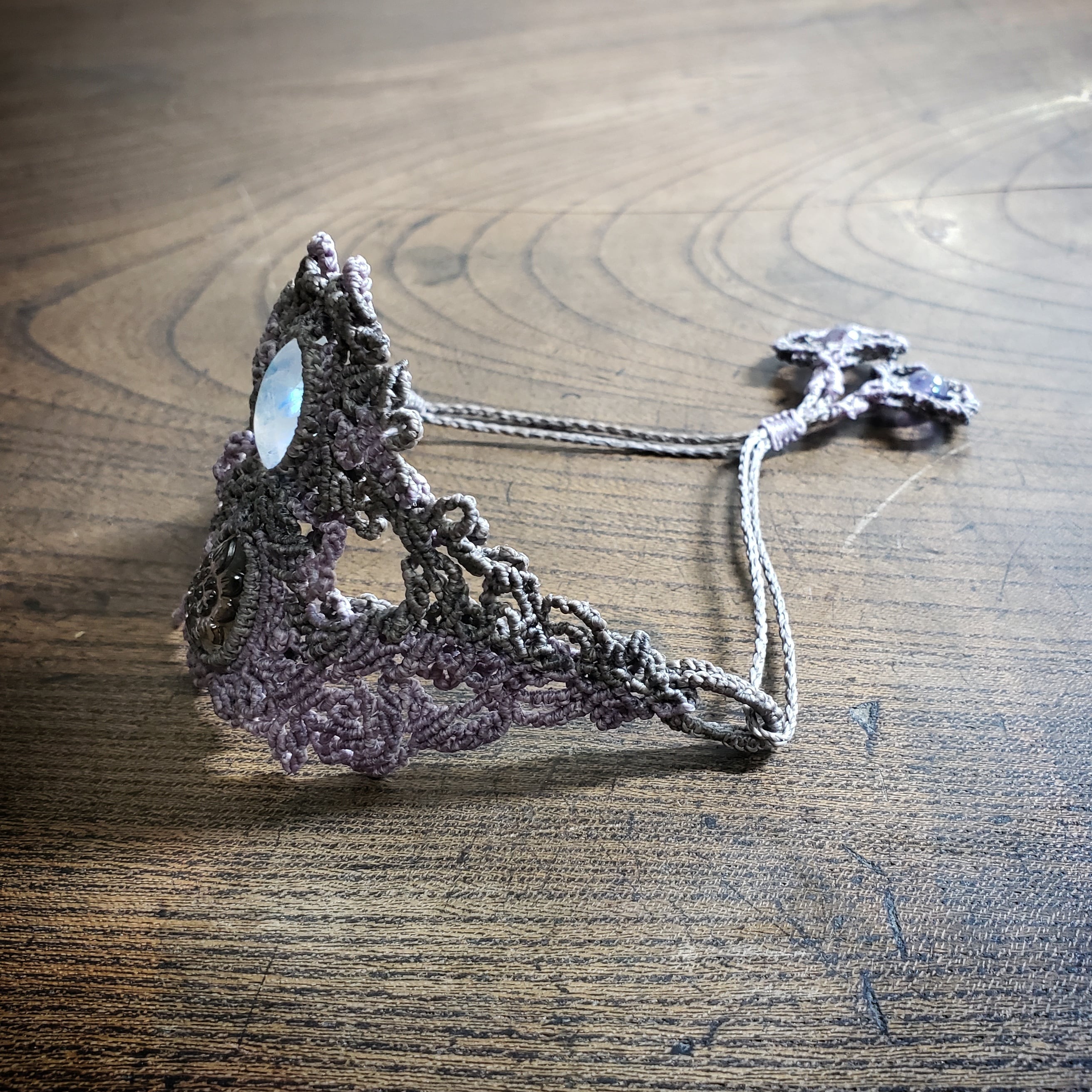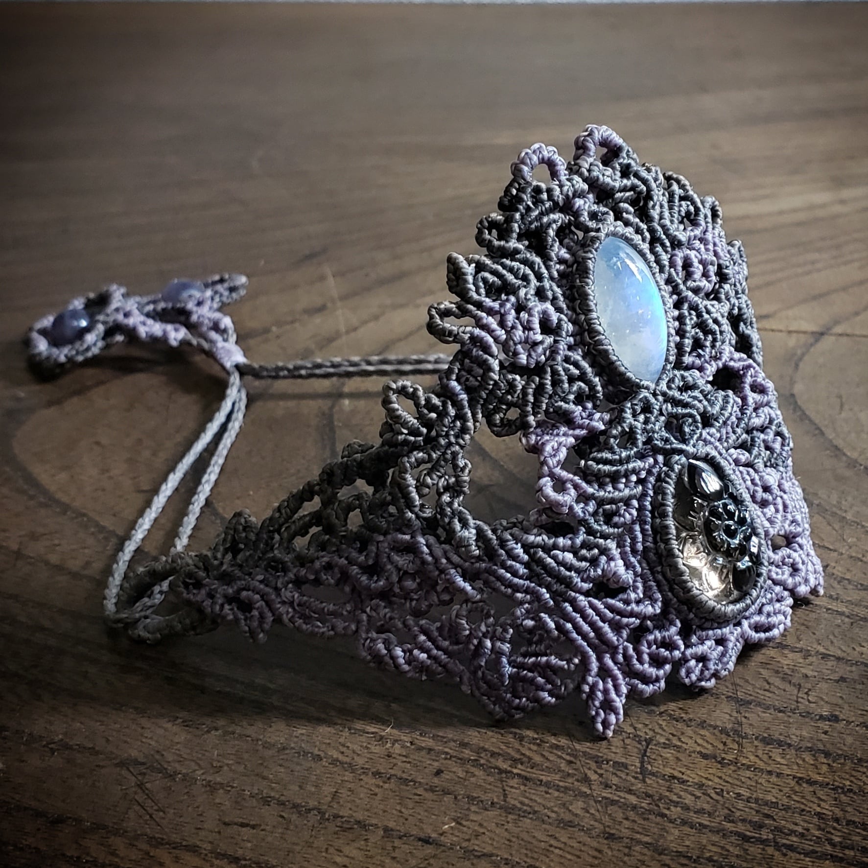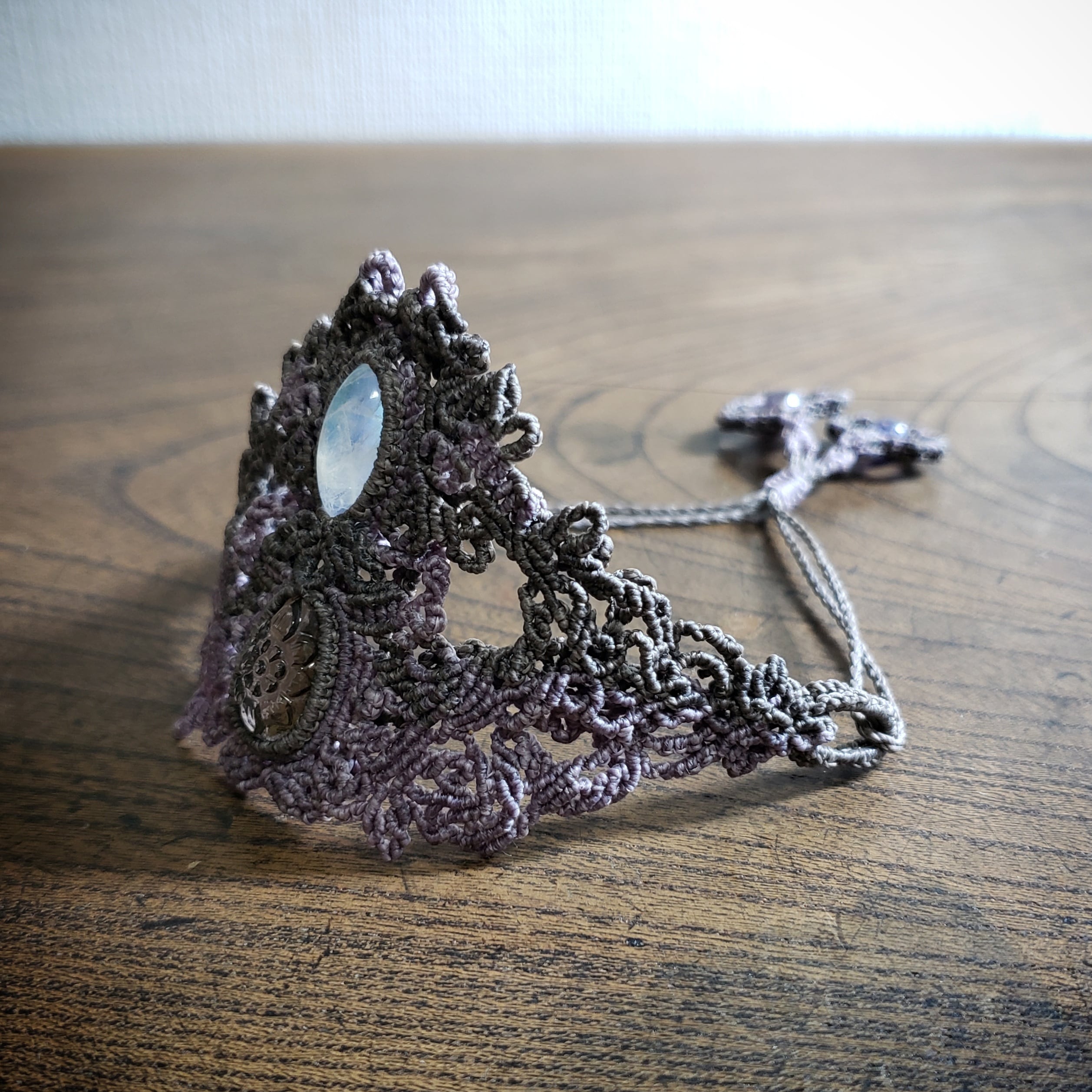 お花柄のカーヴィングが施された「スモーキークォーツ」と「レインボームーンストーン」の豪華で極太なマクラメ編みのブレスレットを作りました。