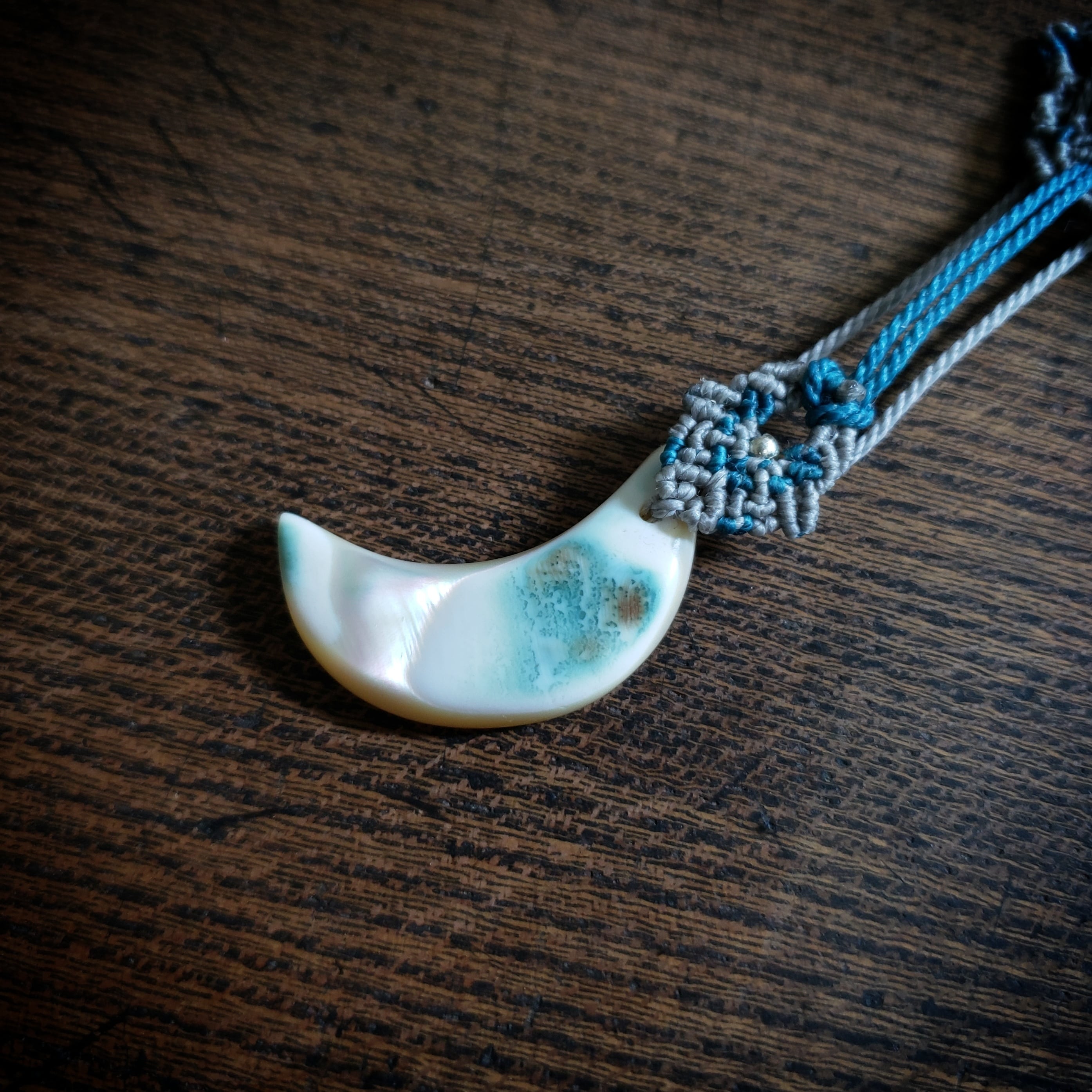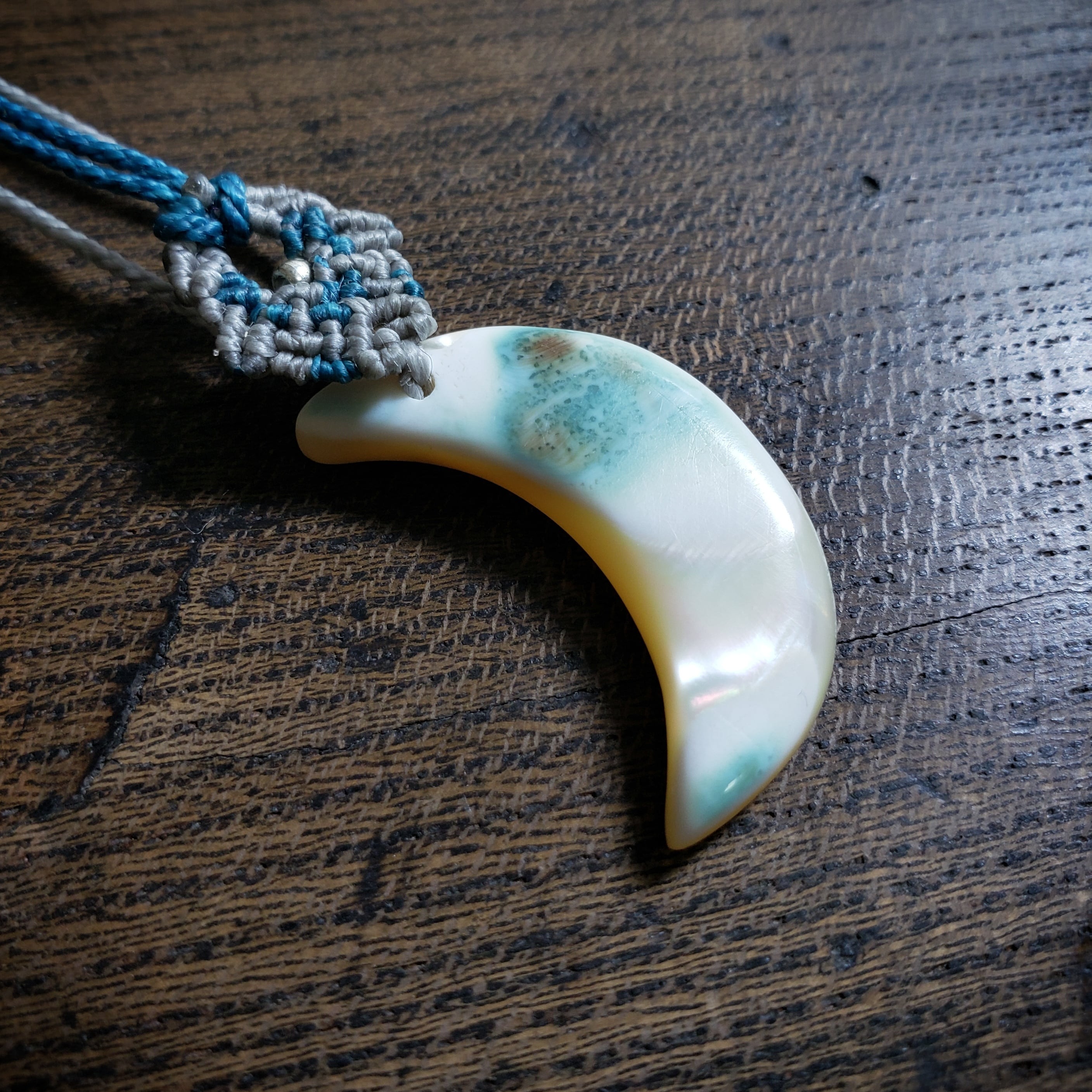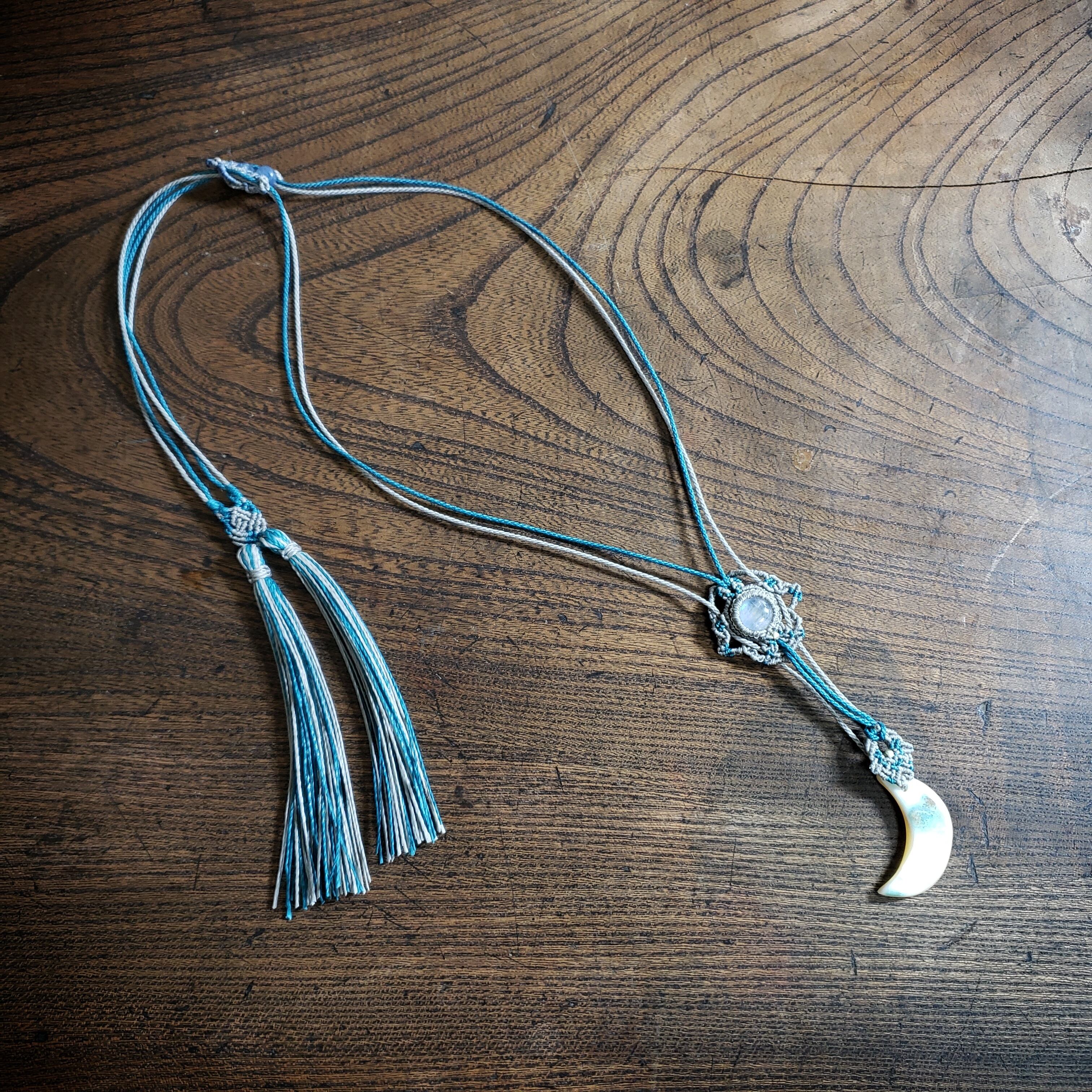 「ラブラドライト」と三日月型「夜光貝」のゆらゆらマクラメ編みネックレス