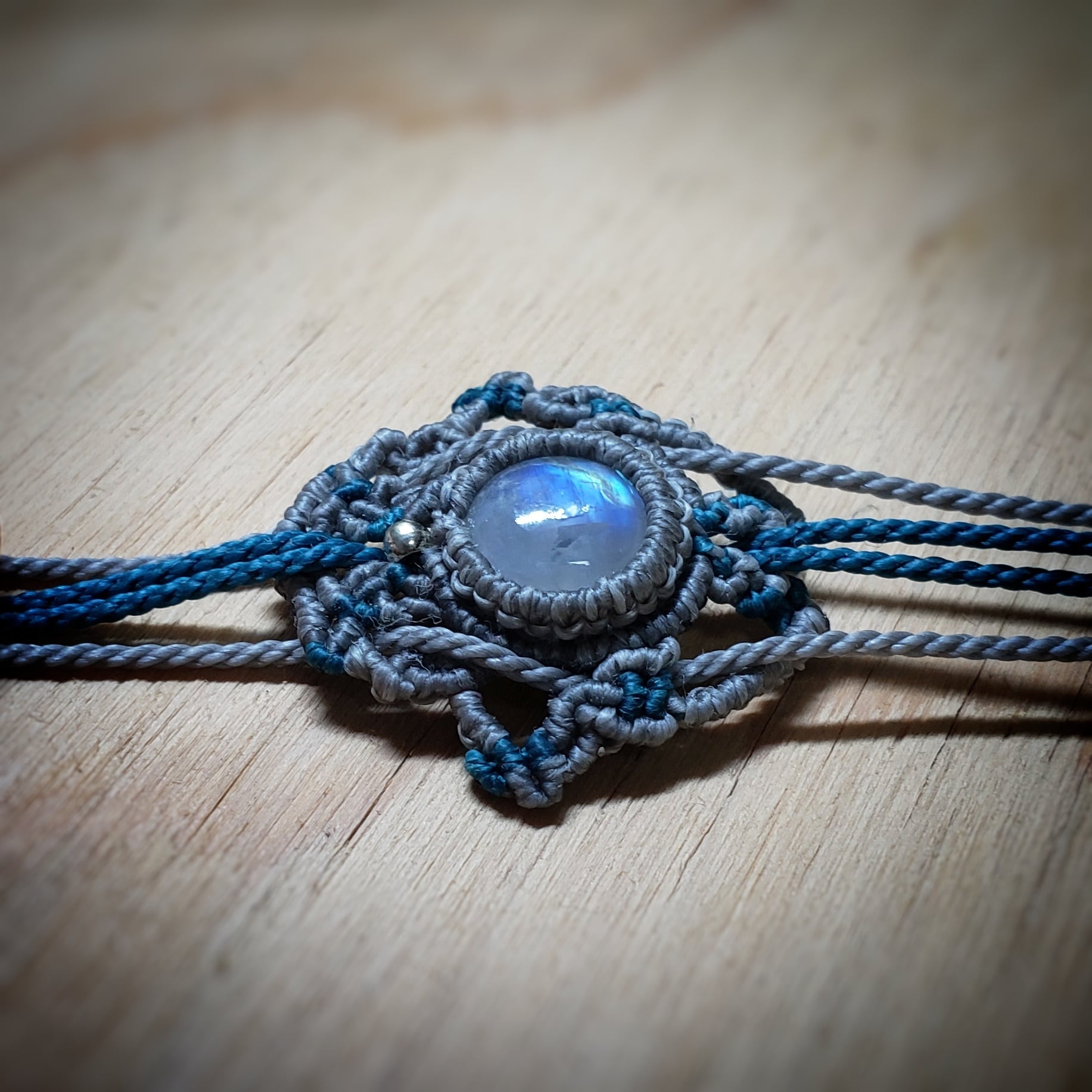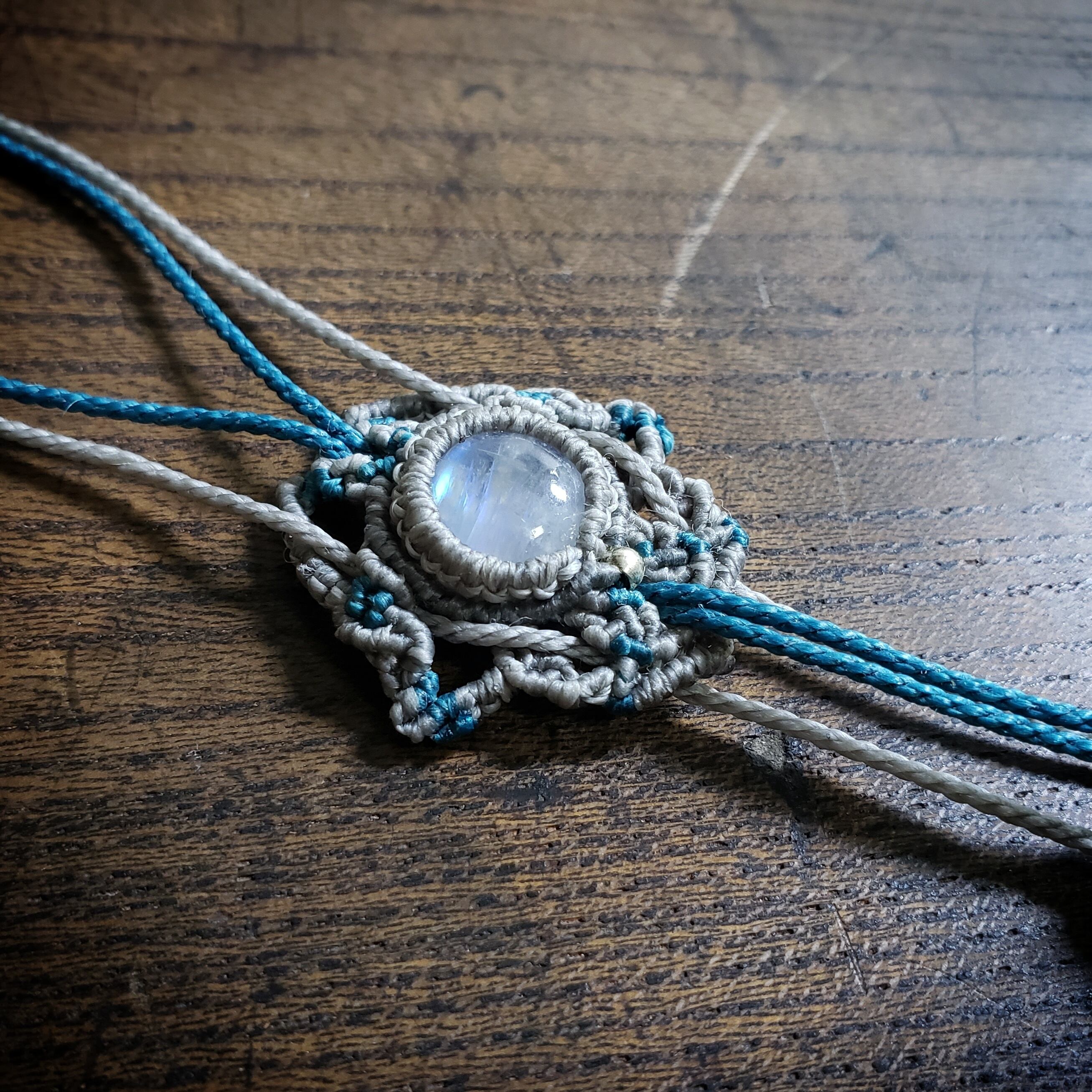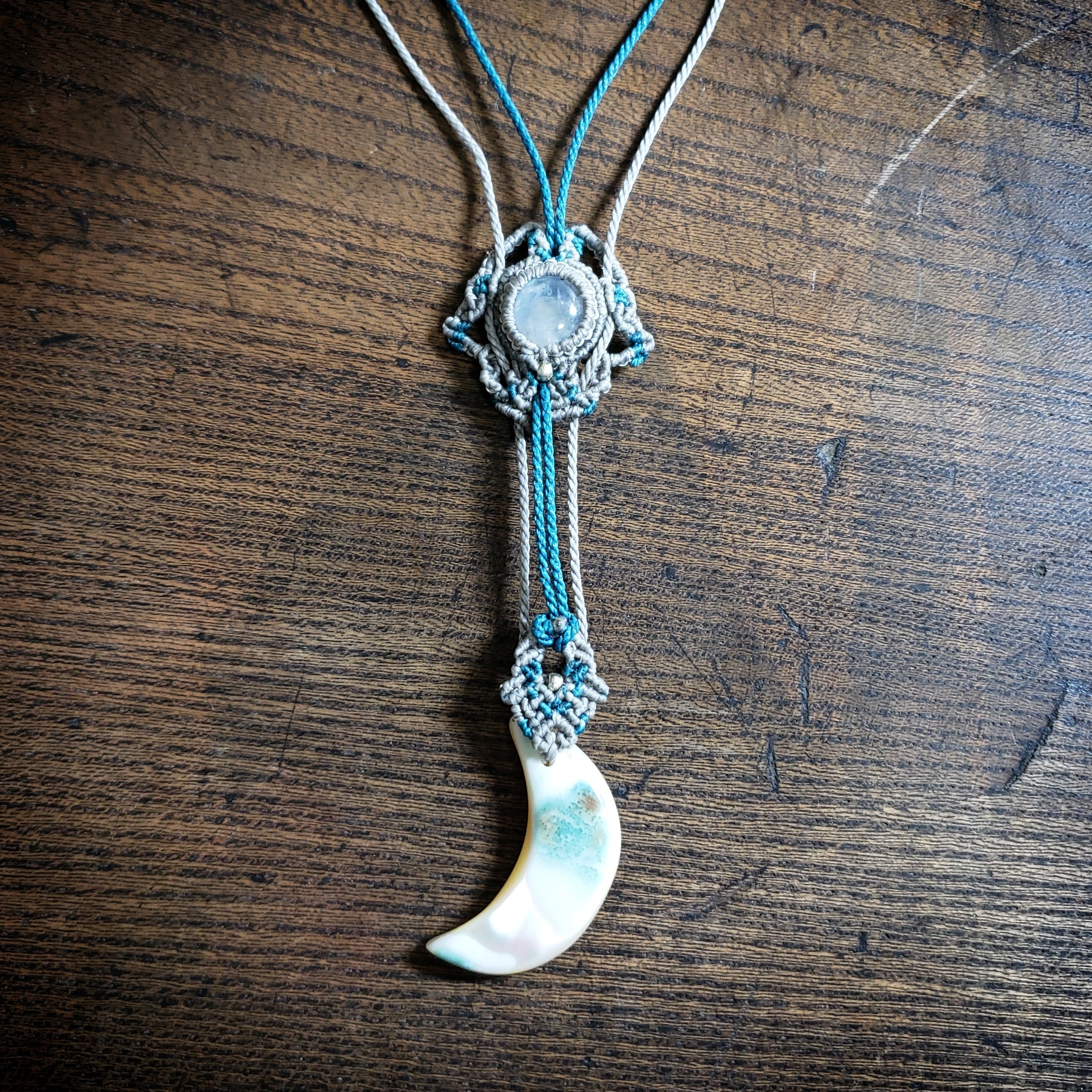 「ラブラドライト」と三日月型「夜光貝」のゆらゆらマクラメ編みネックレス