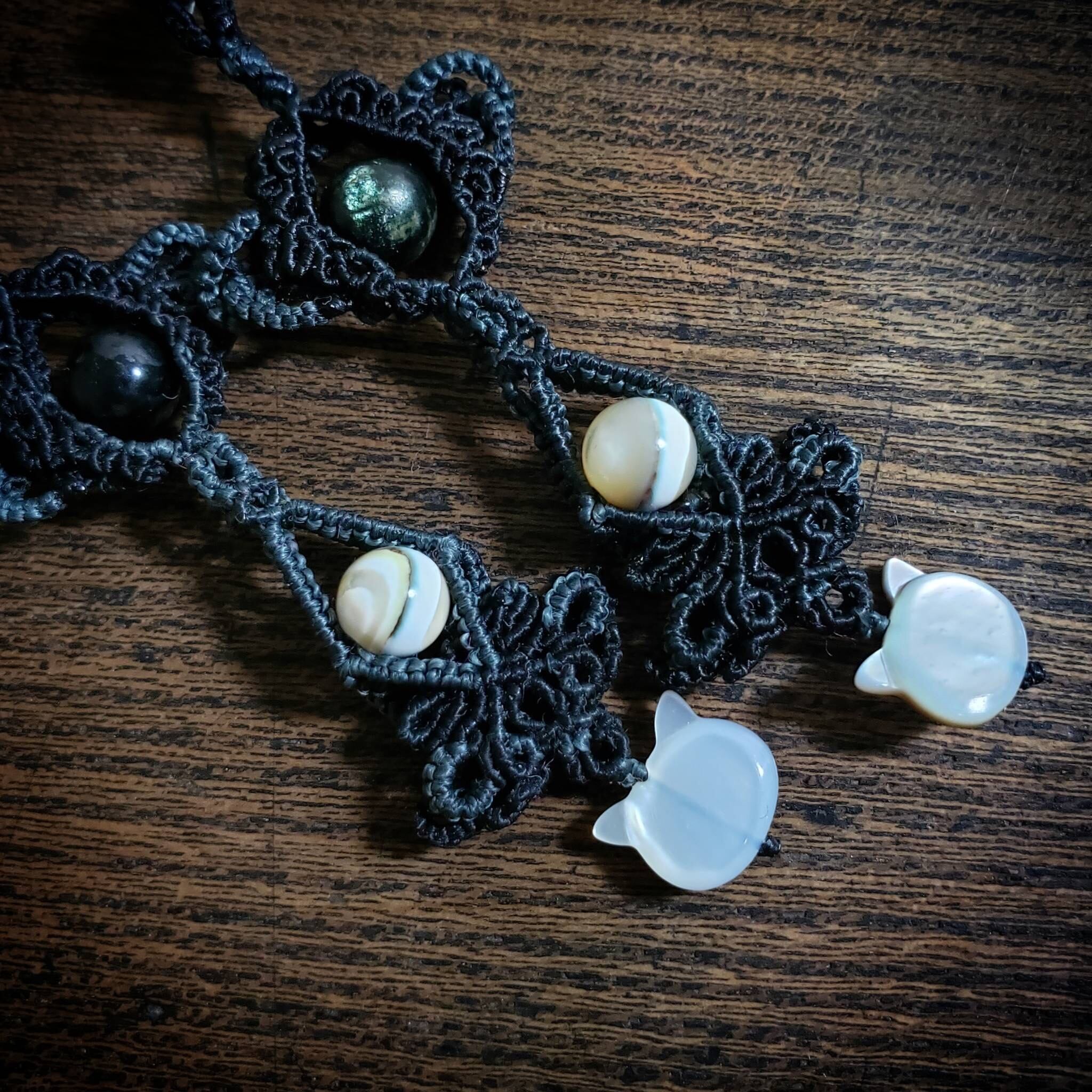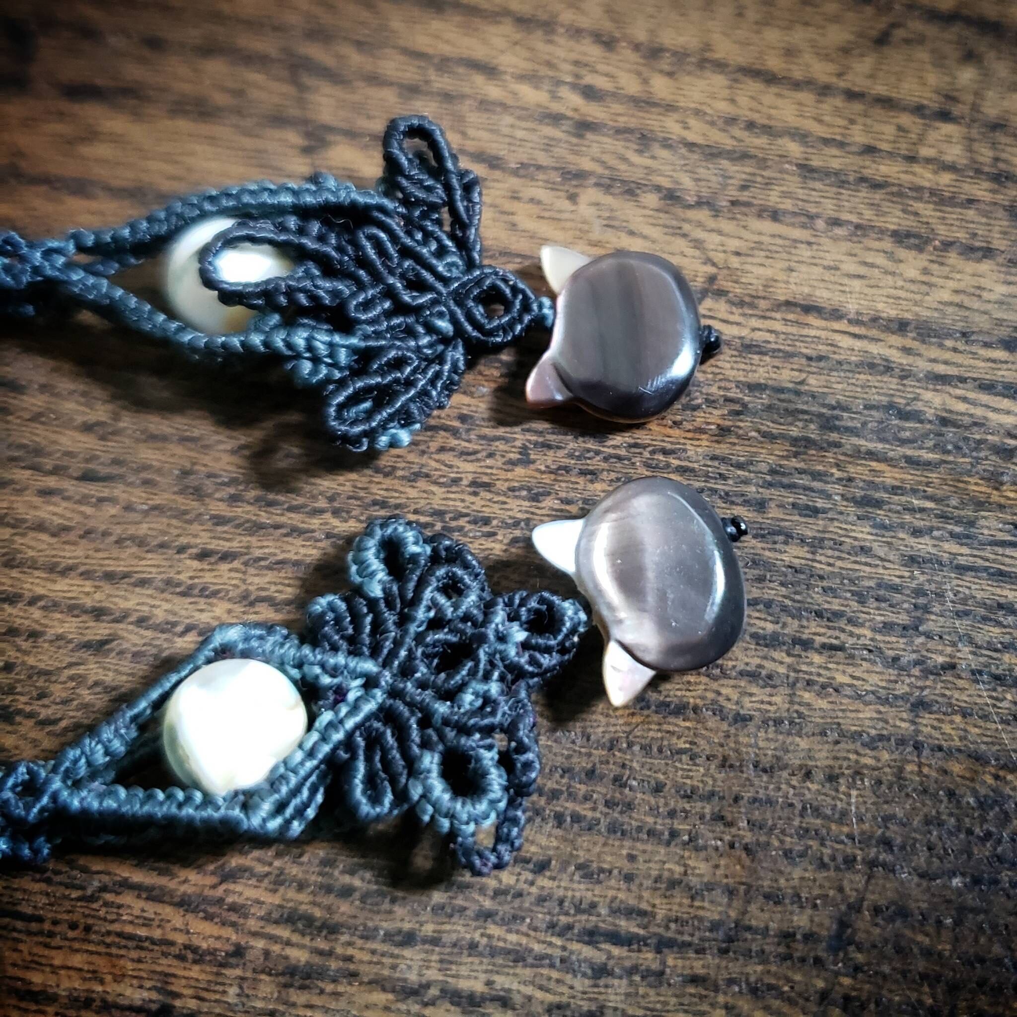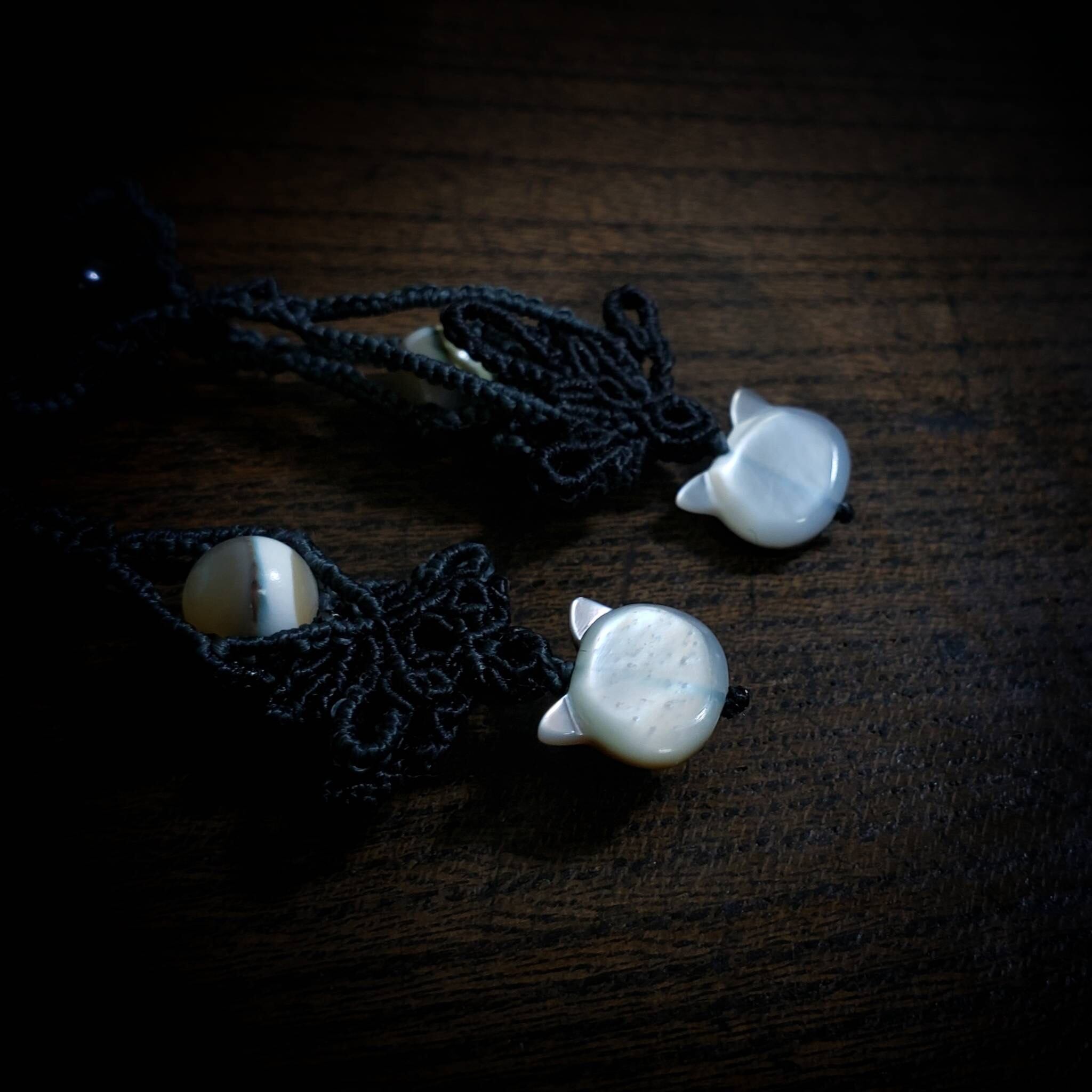 可愛い猫ちゃんのシェルビーズですが、黒のマクラメ紐で編んで大人っぽく仕上げました。