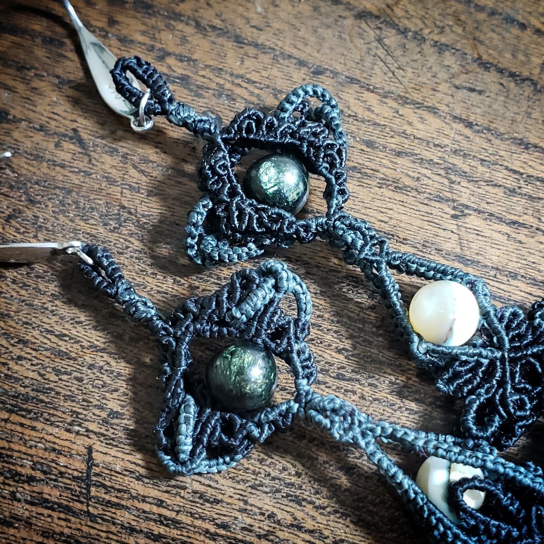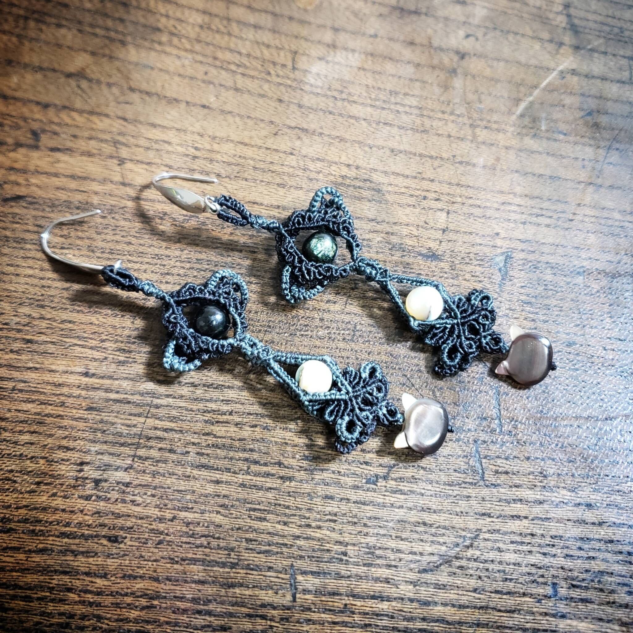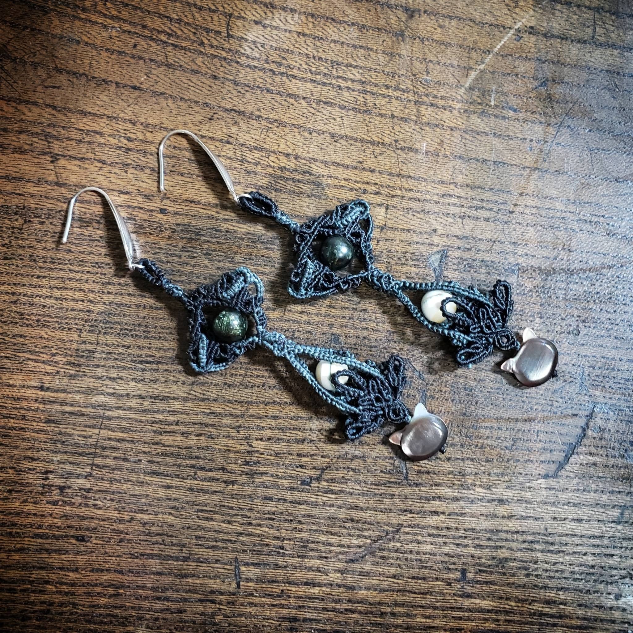 こちらは、シェルビーズの猫ちゃんを使いマクラメ編みのピアスを作りました。