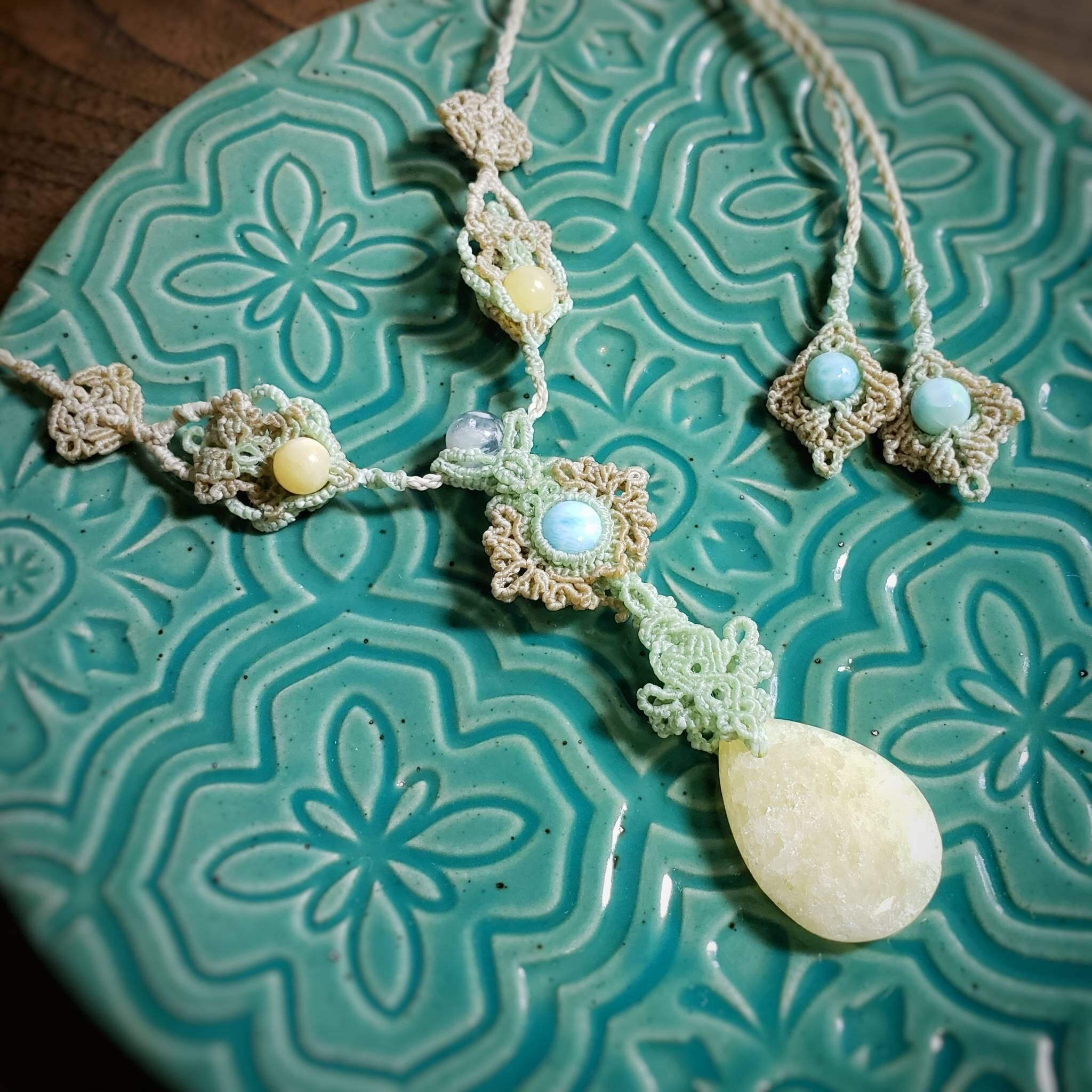 こちらは、「ラリマー」と「イエロージェイド」のマクラメ編みネックレスのご紹介です。