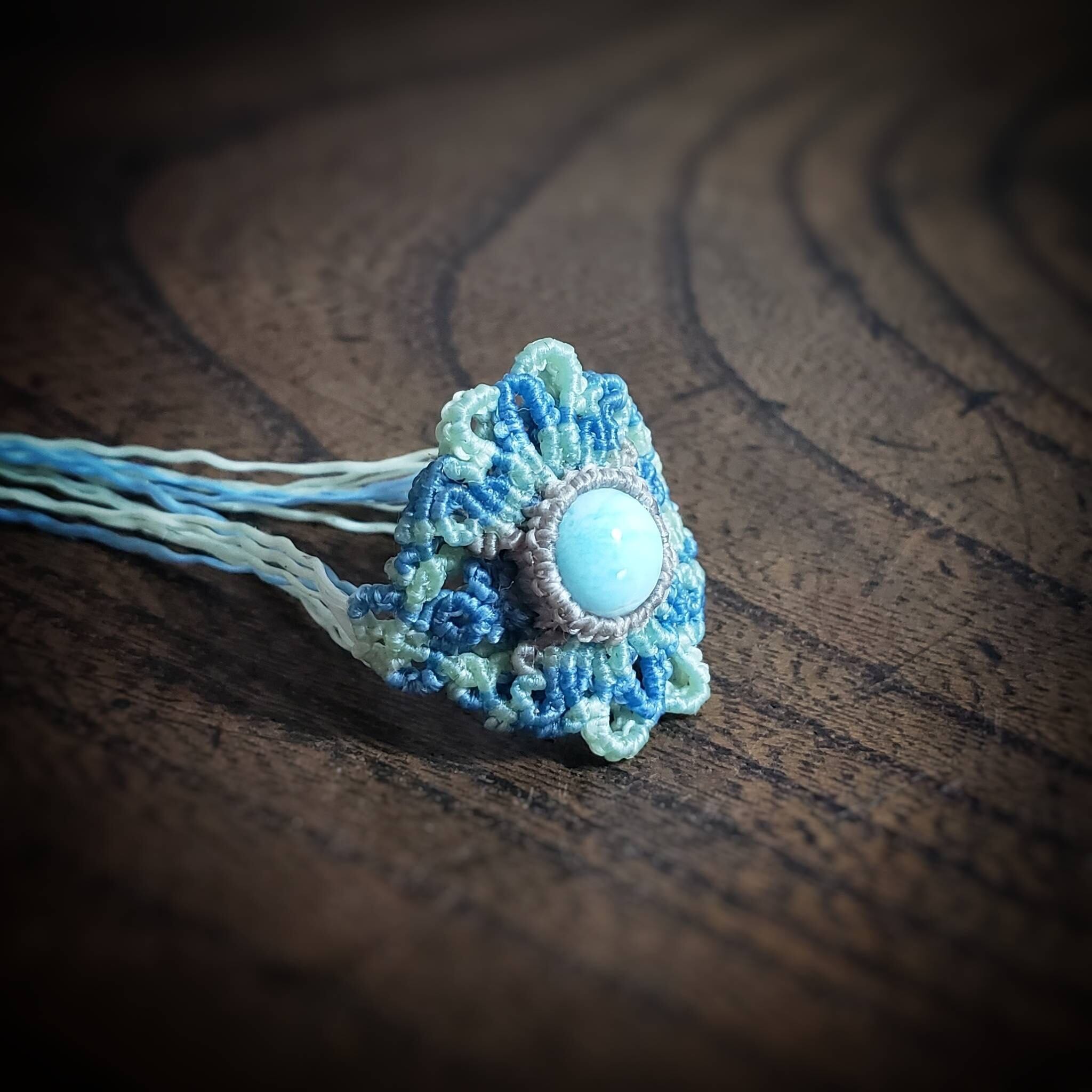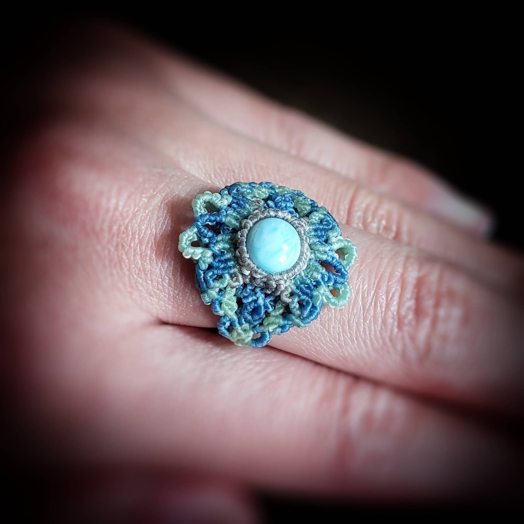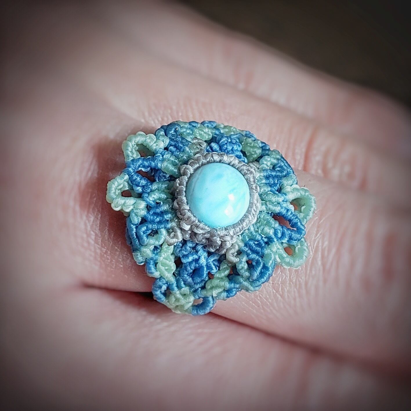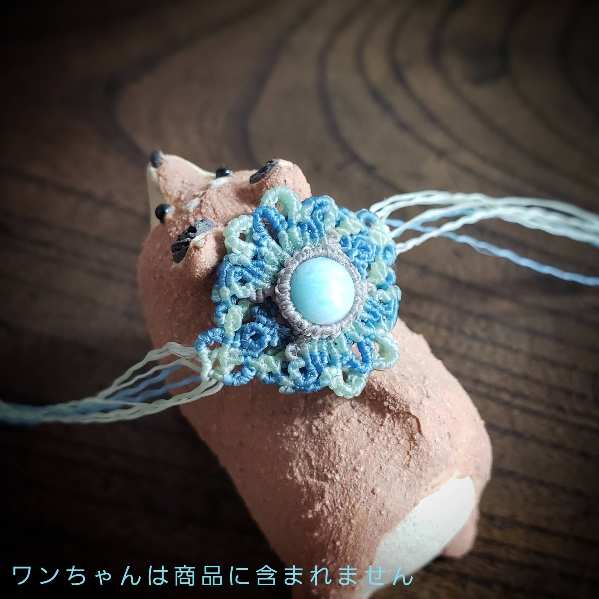こちらは、可愛らしい「ラリマー」のマクラメ編みリングです!