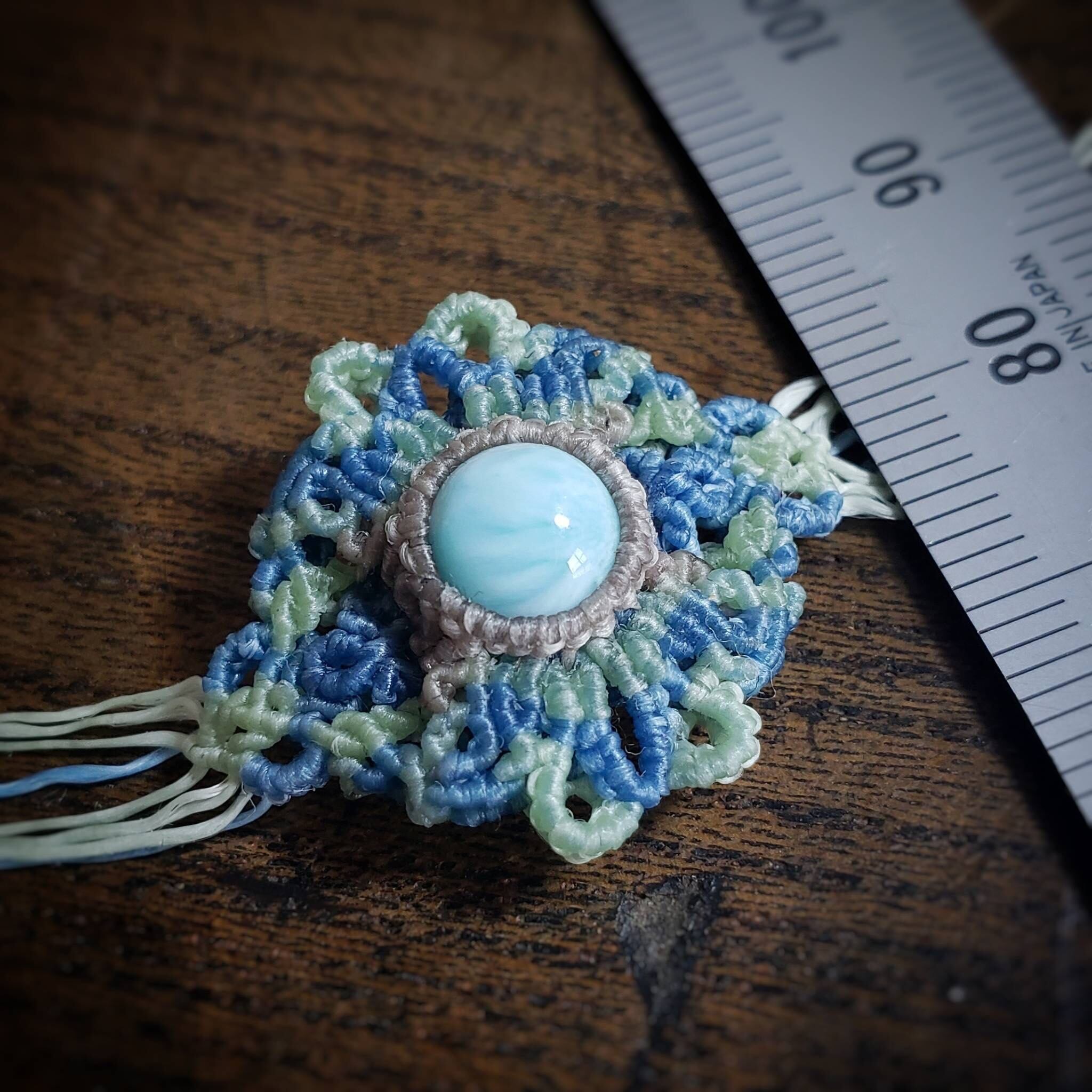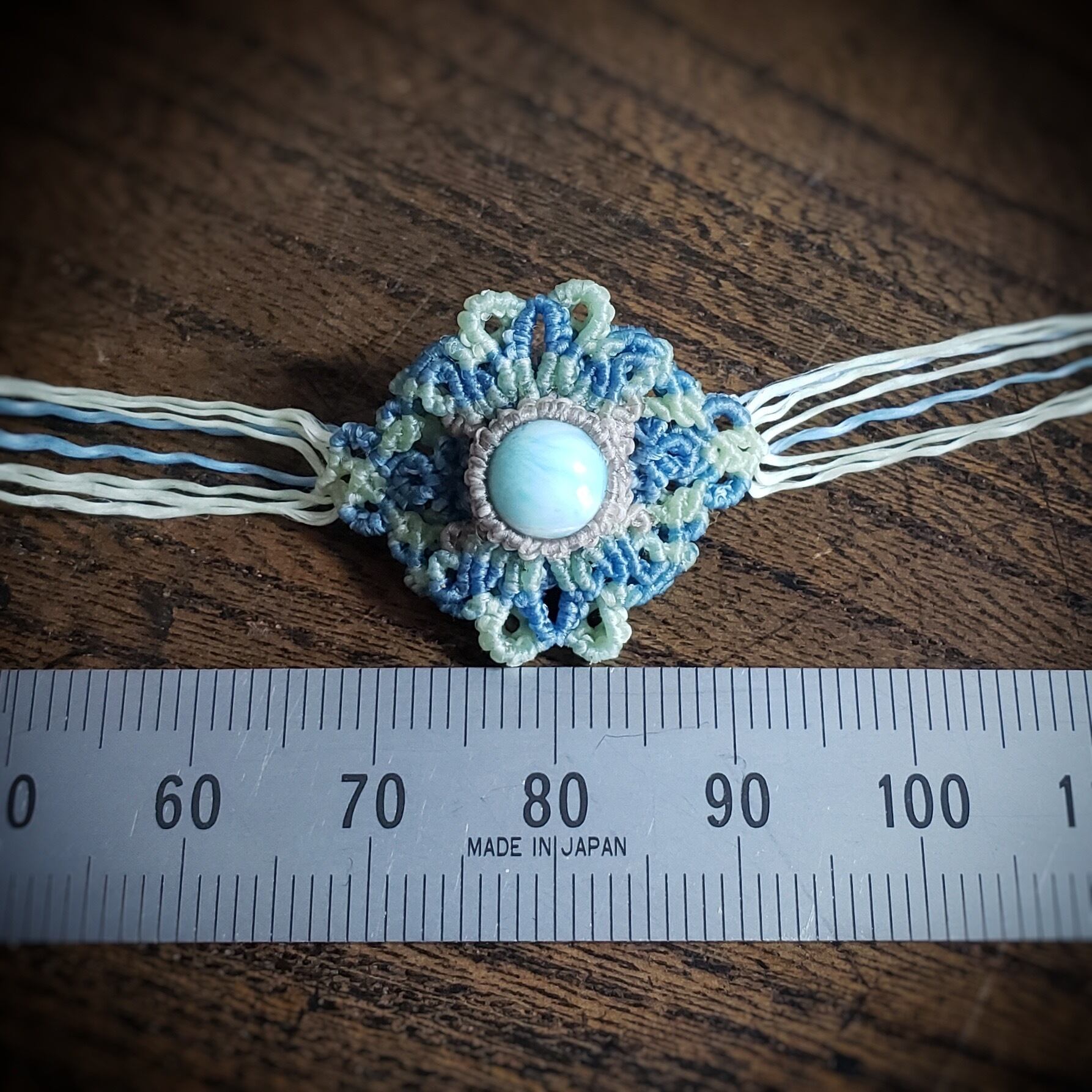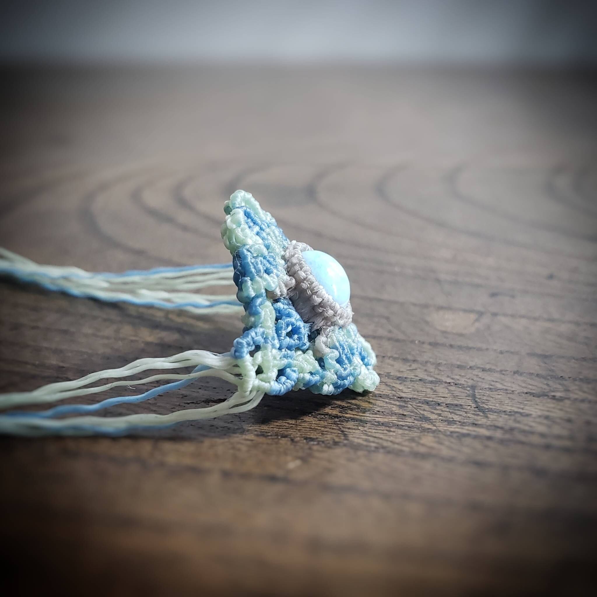 こちらは、可愛らしい「ラリマー」のマクラメ編みリングです!