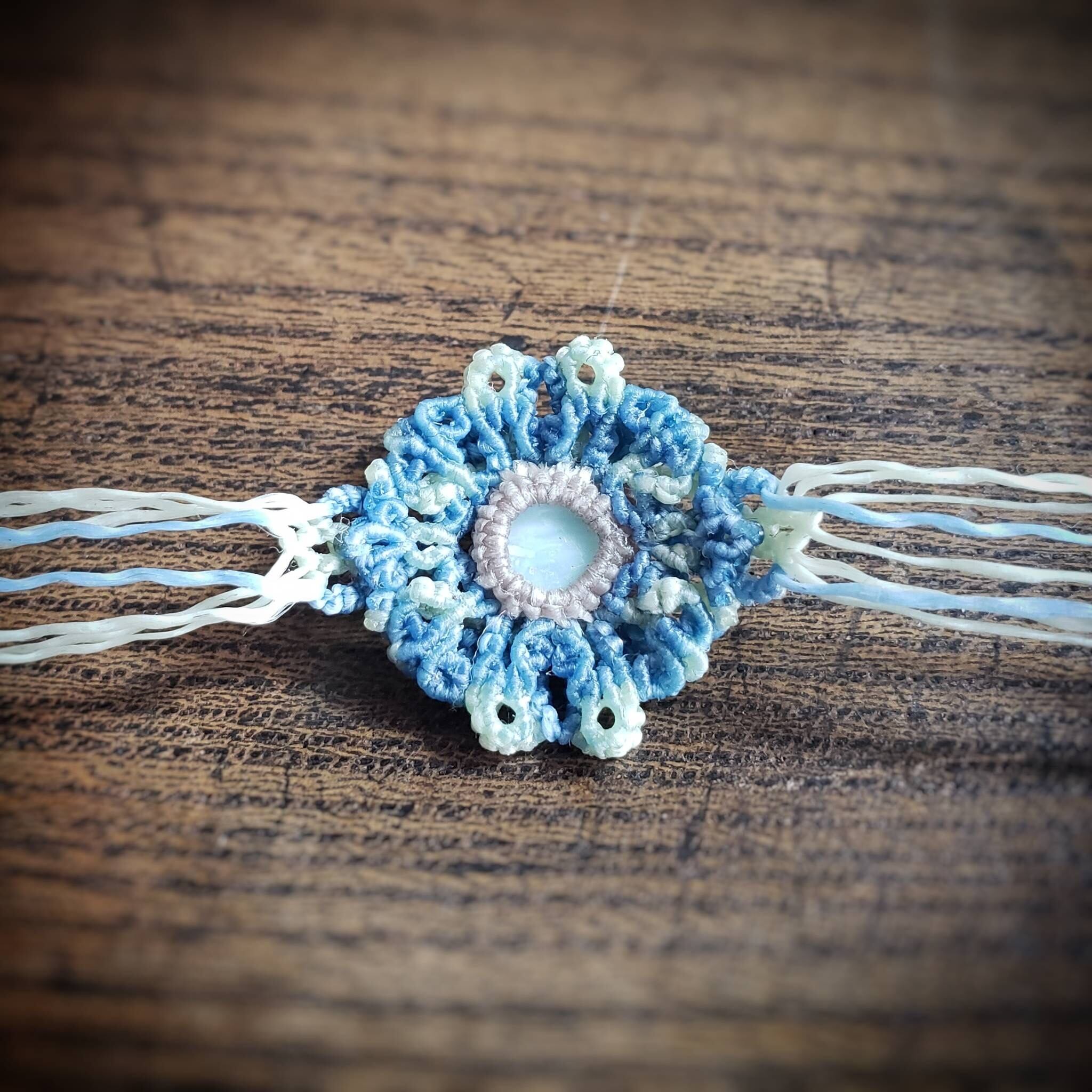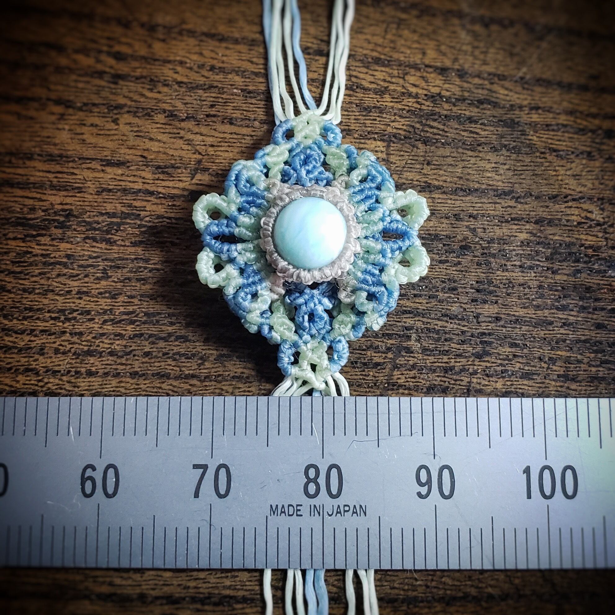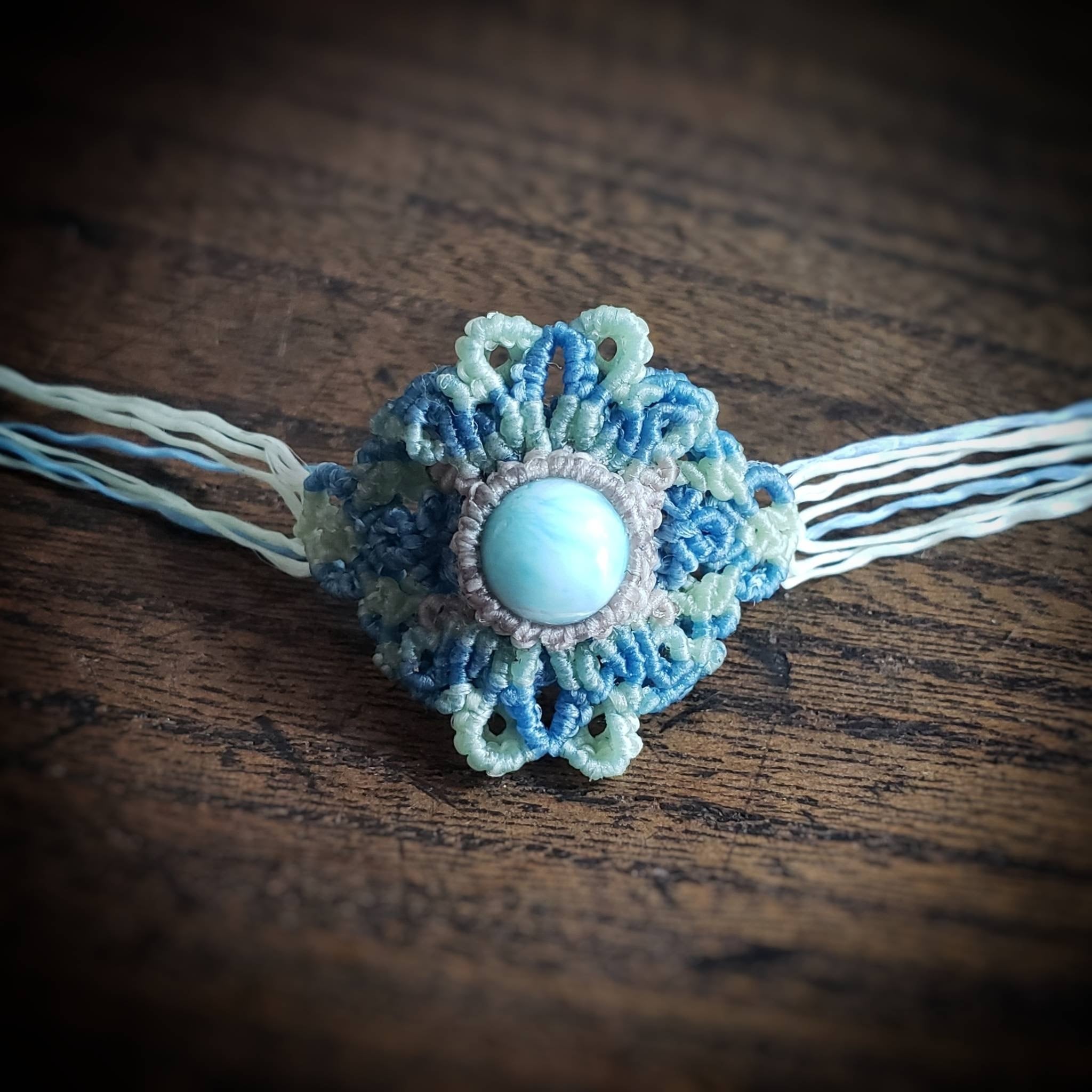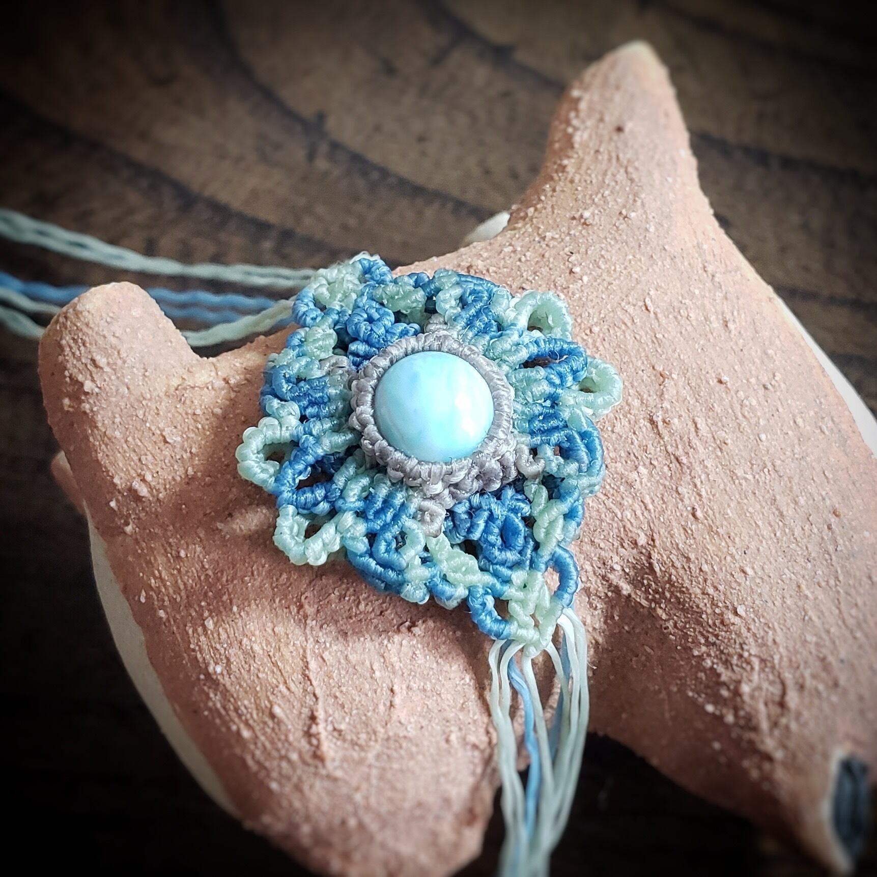 こちらは、可愛らしい「ラリマー」のマクラメ編みリングです!