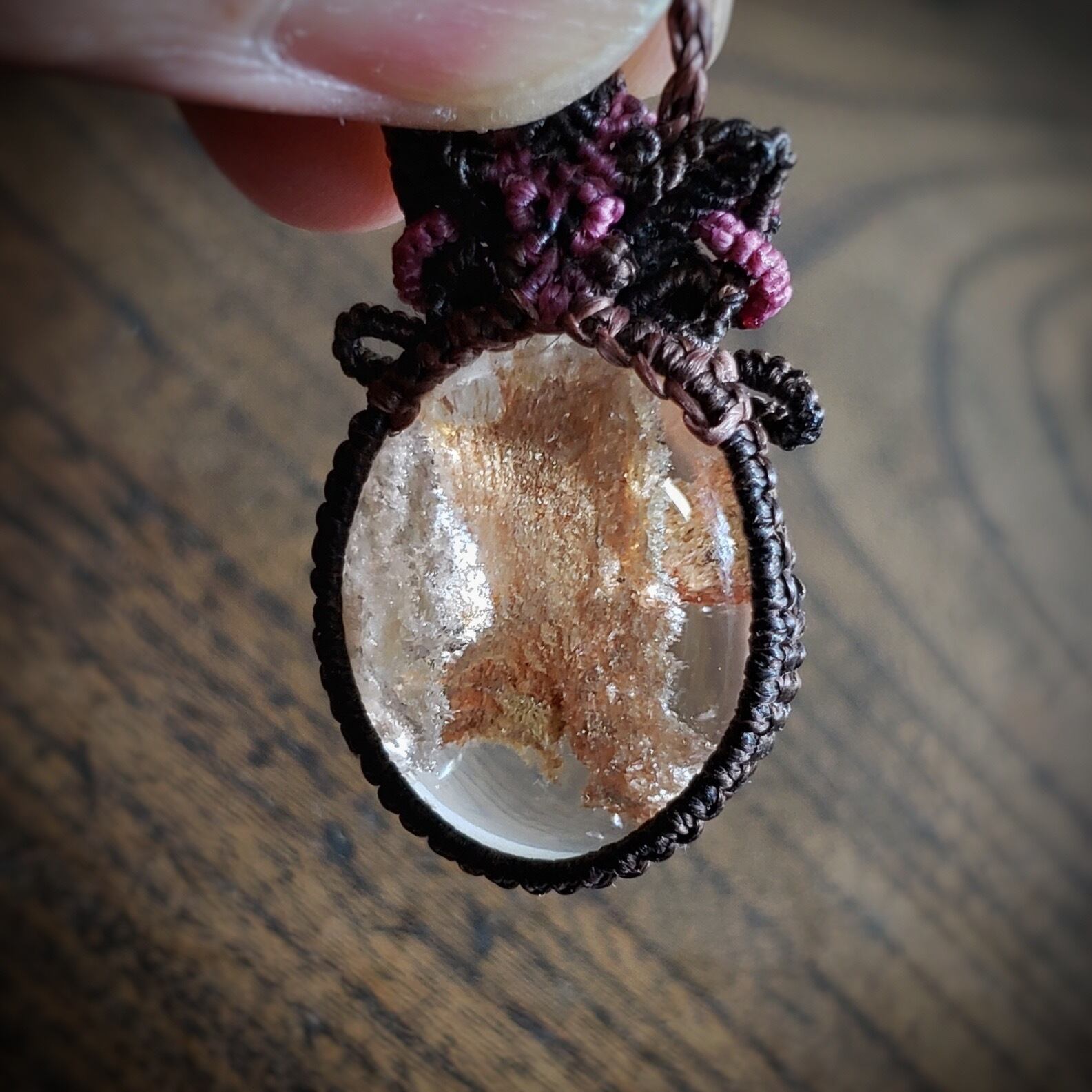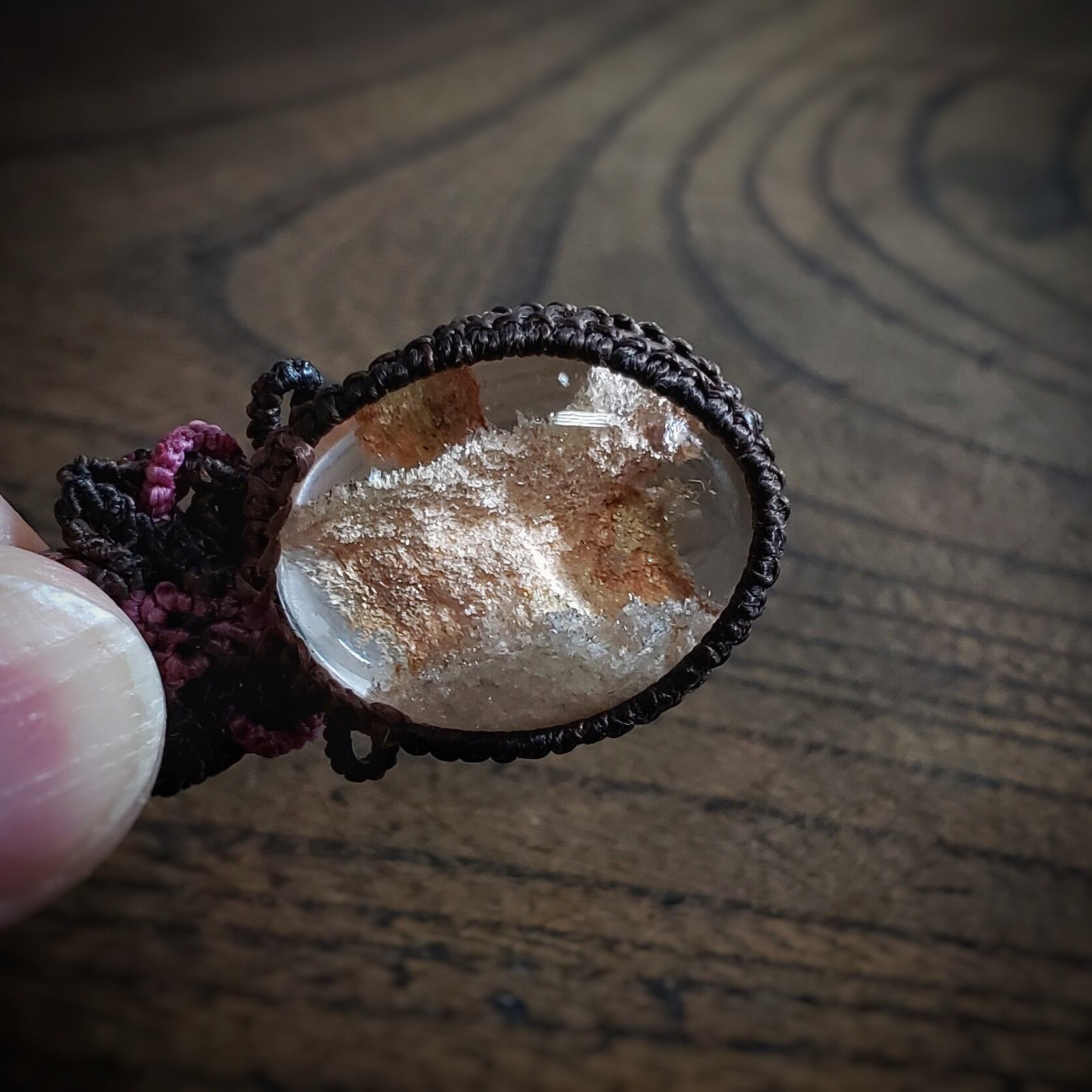 横から光が入る様に包み編みをしたのでキラキラ光るガーデンクォーツの表情を楽しめます。